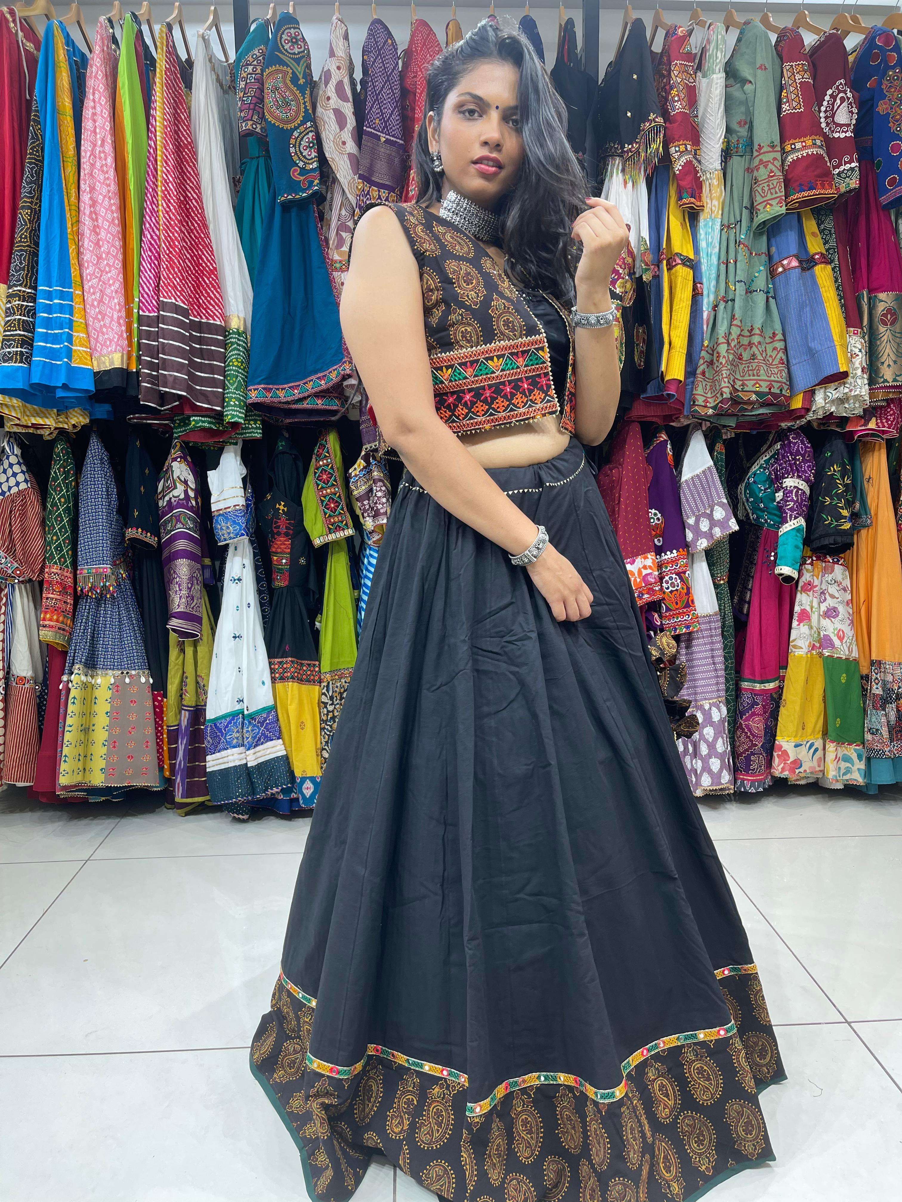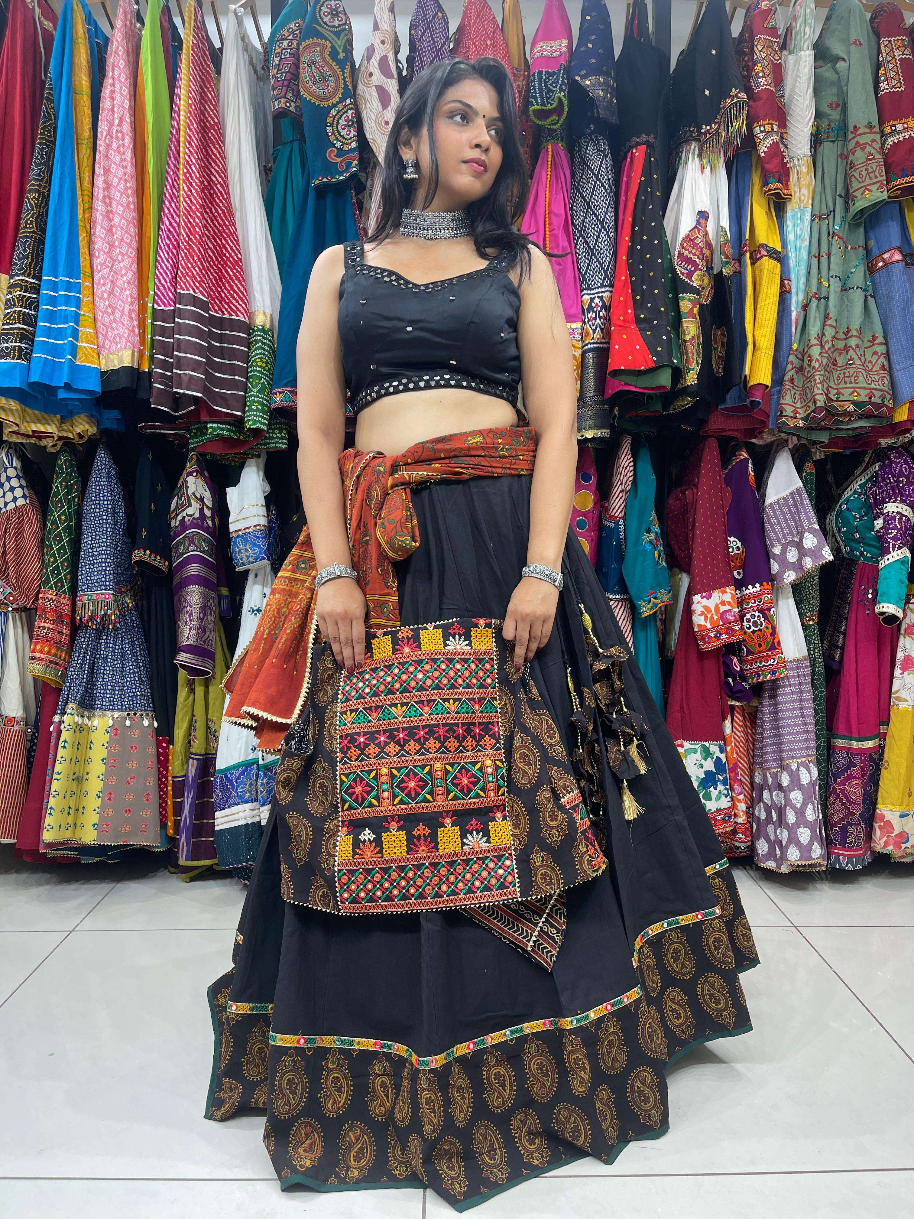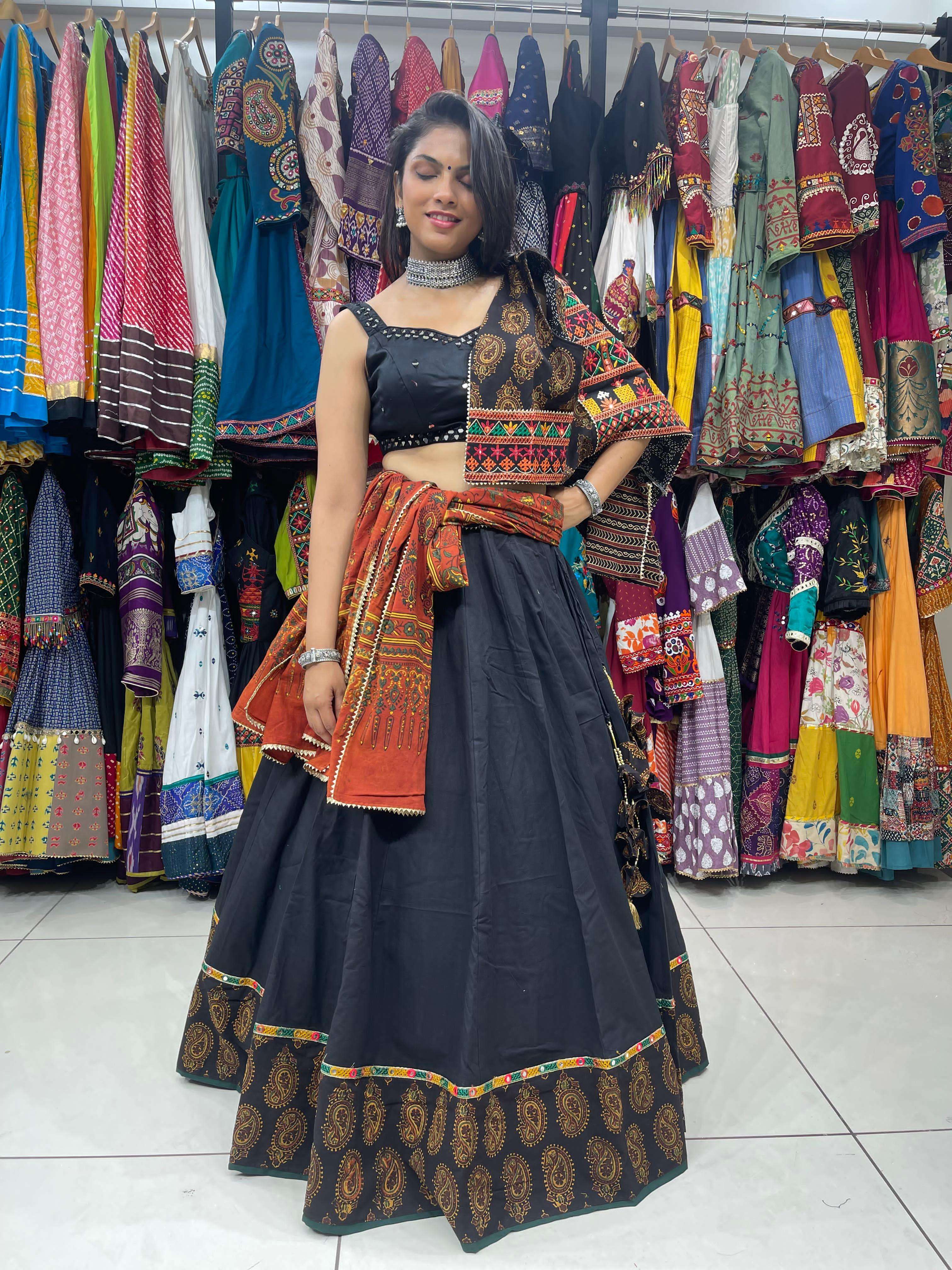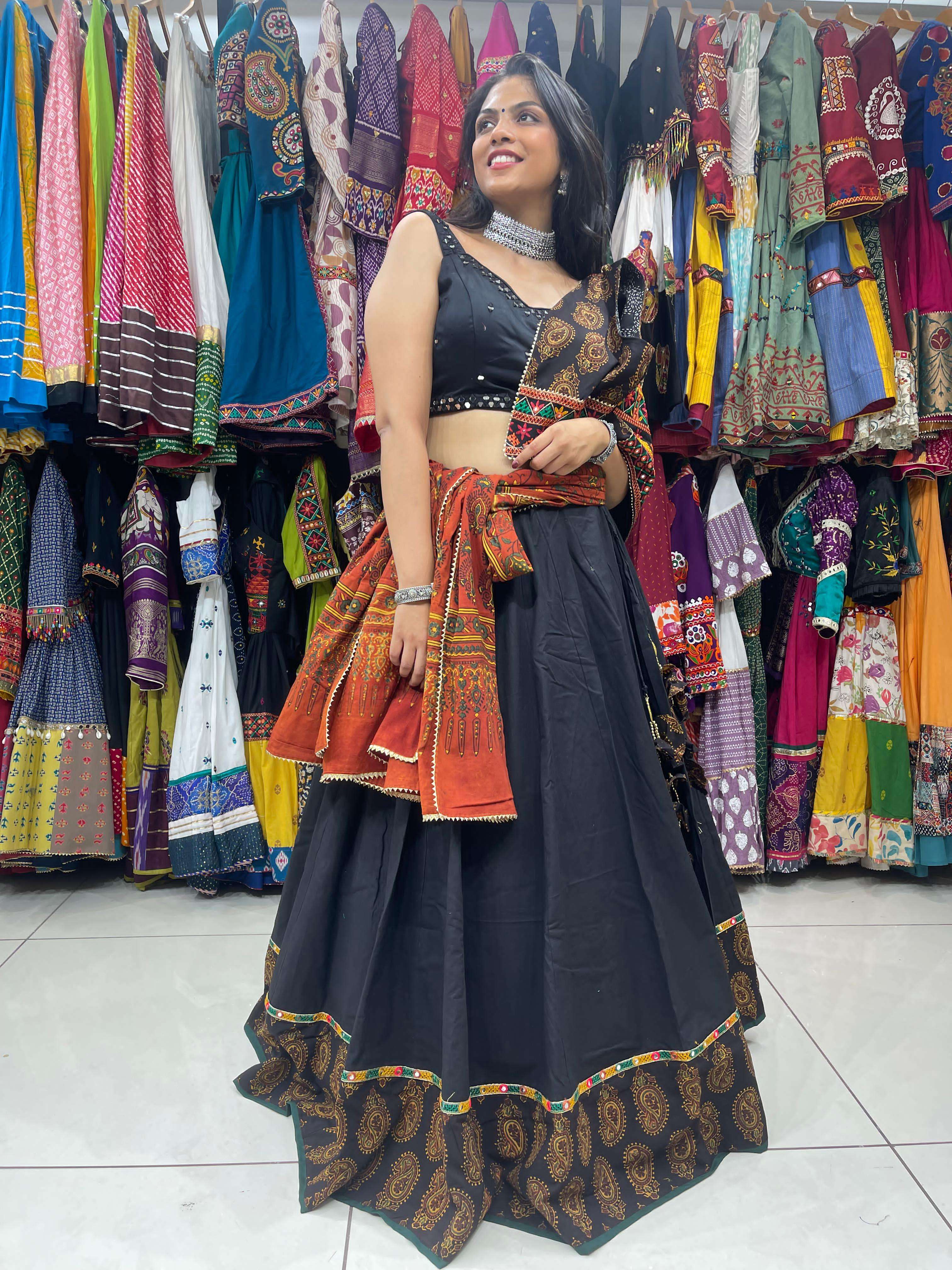 *Skirt/bottom*: *Soft pure cotton ajrakh floral classic print 6.5 Mtrs Ghera & long latkan with ajrakh print mix and march beautiful border which gives perfect look to lehenga* *Length 40/41”* *Upto 42/44” waist*