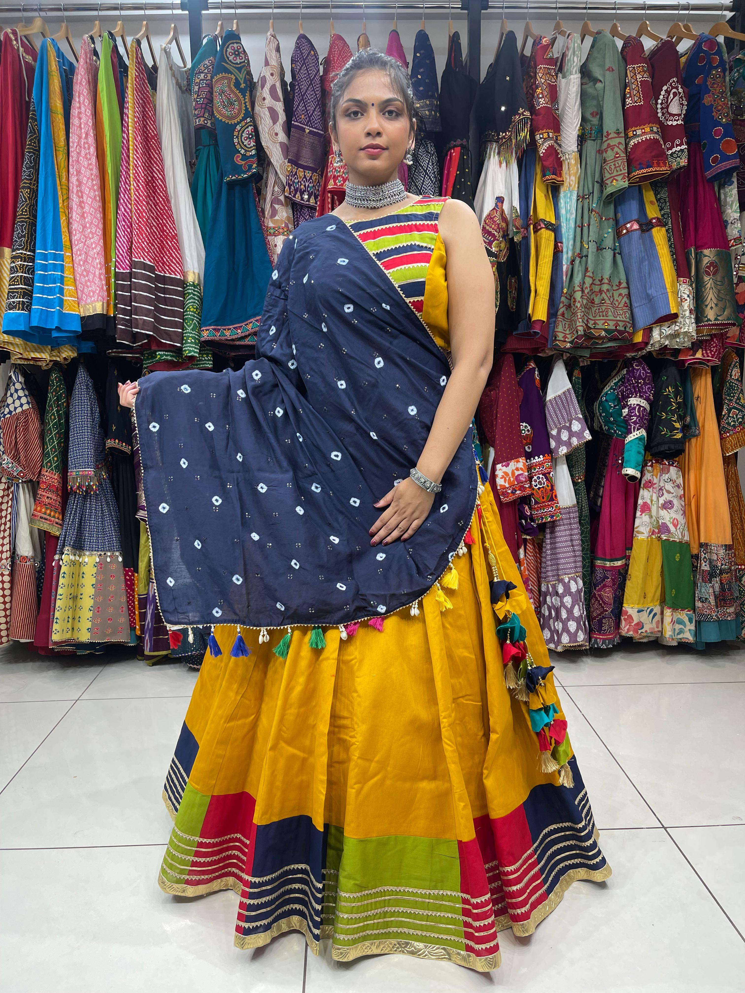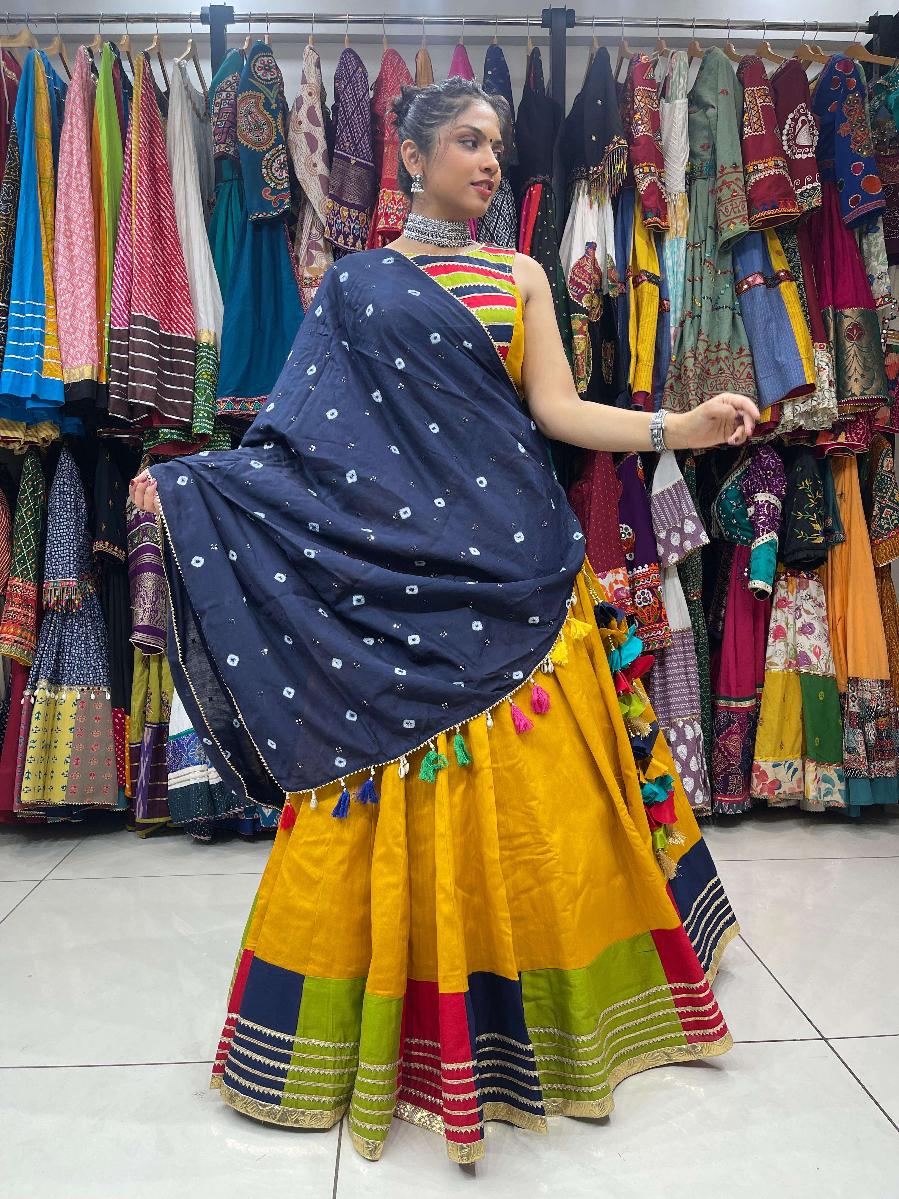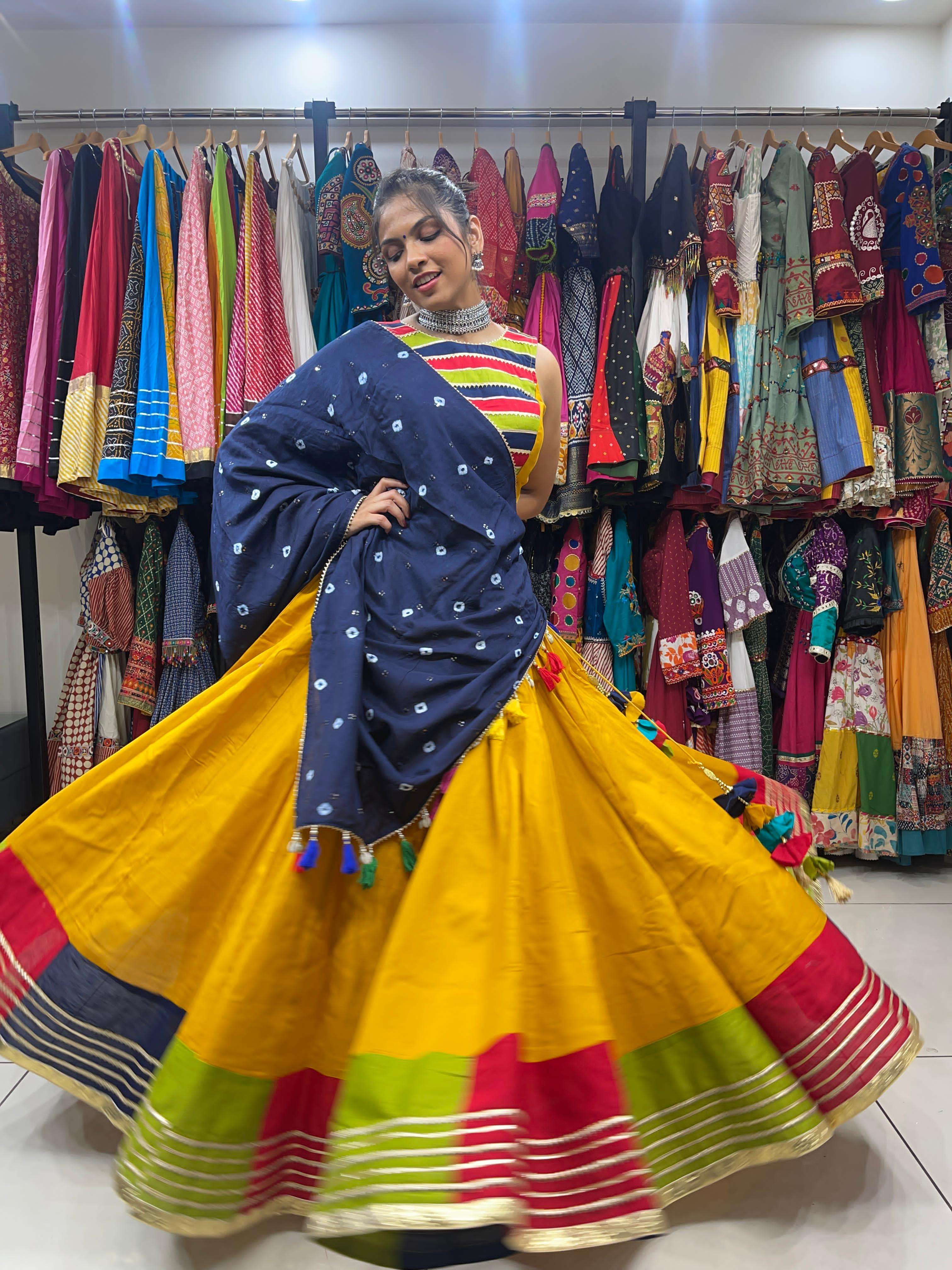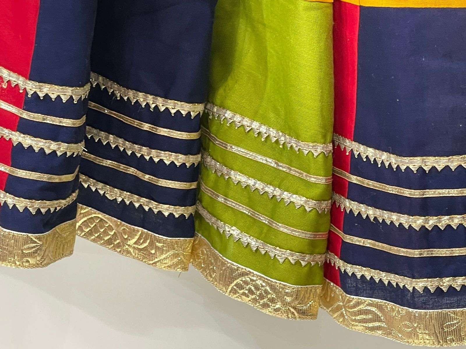*Skirt/bottom*: *Soft cotton vibrant Bright 3 colour combinations classic Colourful exclusive Elegant Multiple Colour Border 7 to 7.5 Mtrs full flair Chaniya & long colour ful latkan which gives perfect look to lehenga* *Length 40/41”* *Upto 42/44” waist*