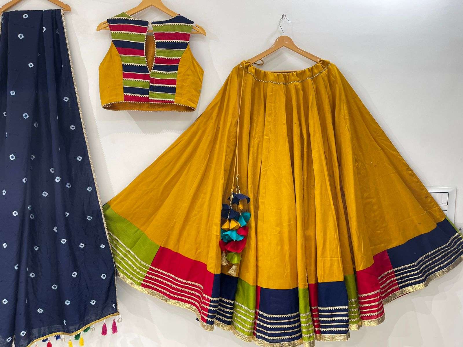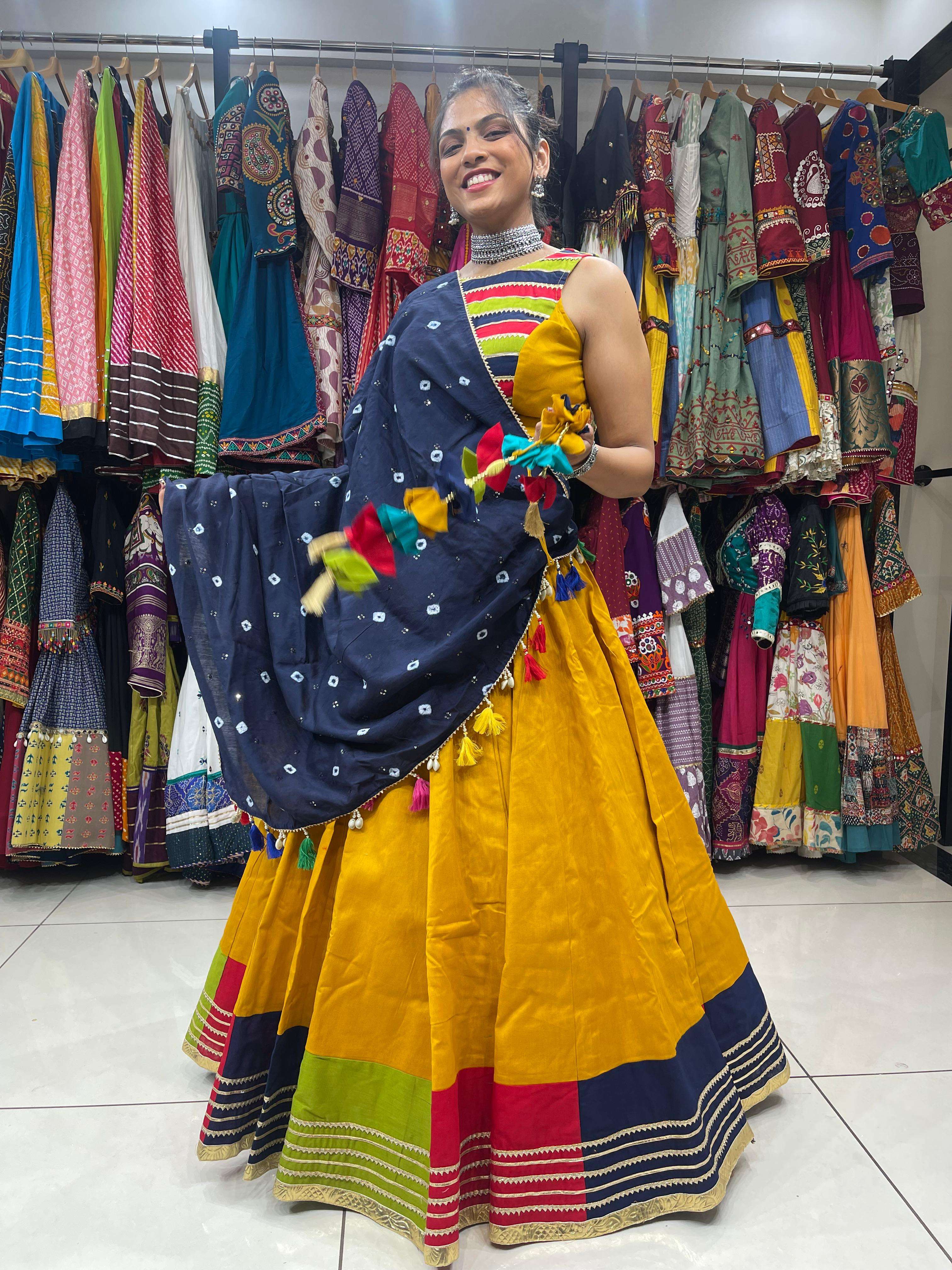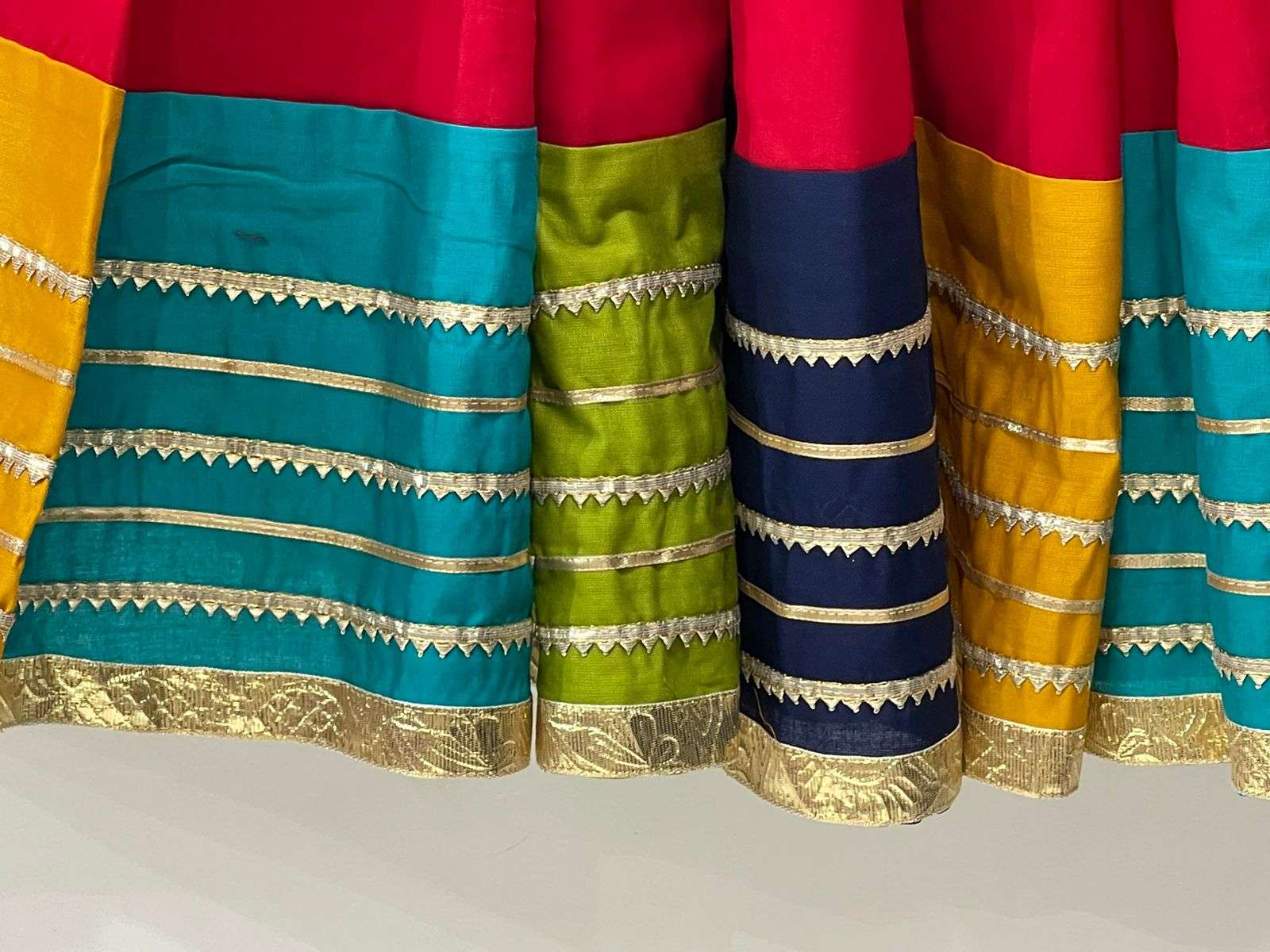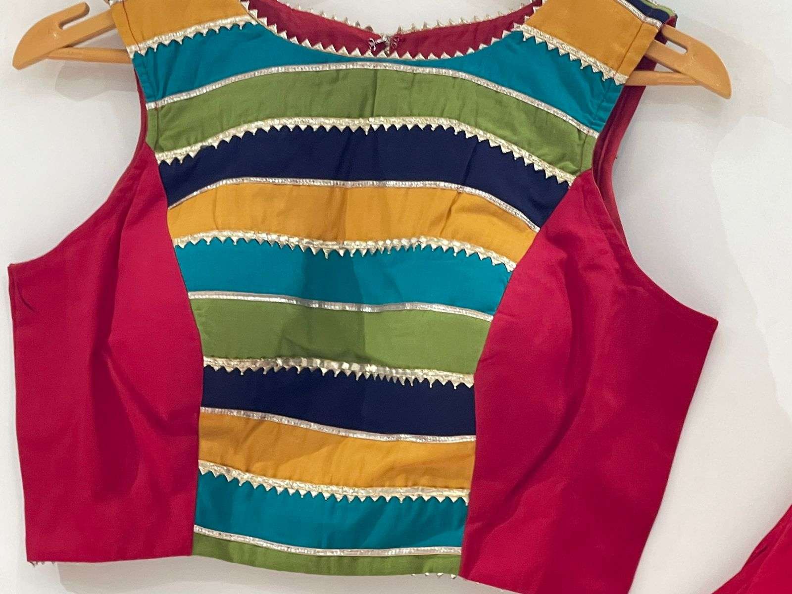 *Skirt/bottom*: *Soft cotton vibrant Bright 3 colour combinations classic Colourful exclusive Elegant Multiple Colour Border 7 to 7.5 Mtrs full flair Chaniya & long colour ful latkan which gives perfect look to lehenga* *Length 40/41”* *Upto 42/44” waist*