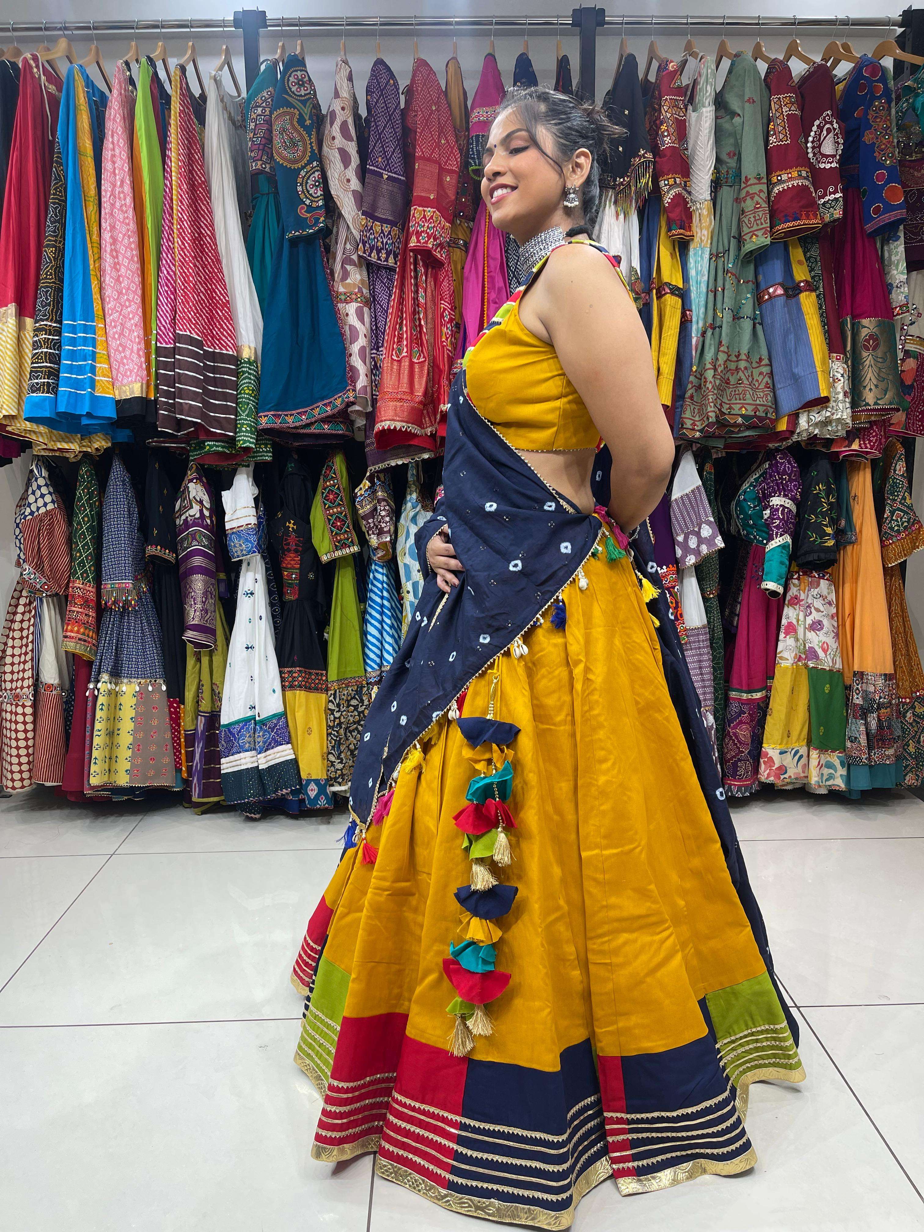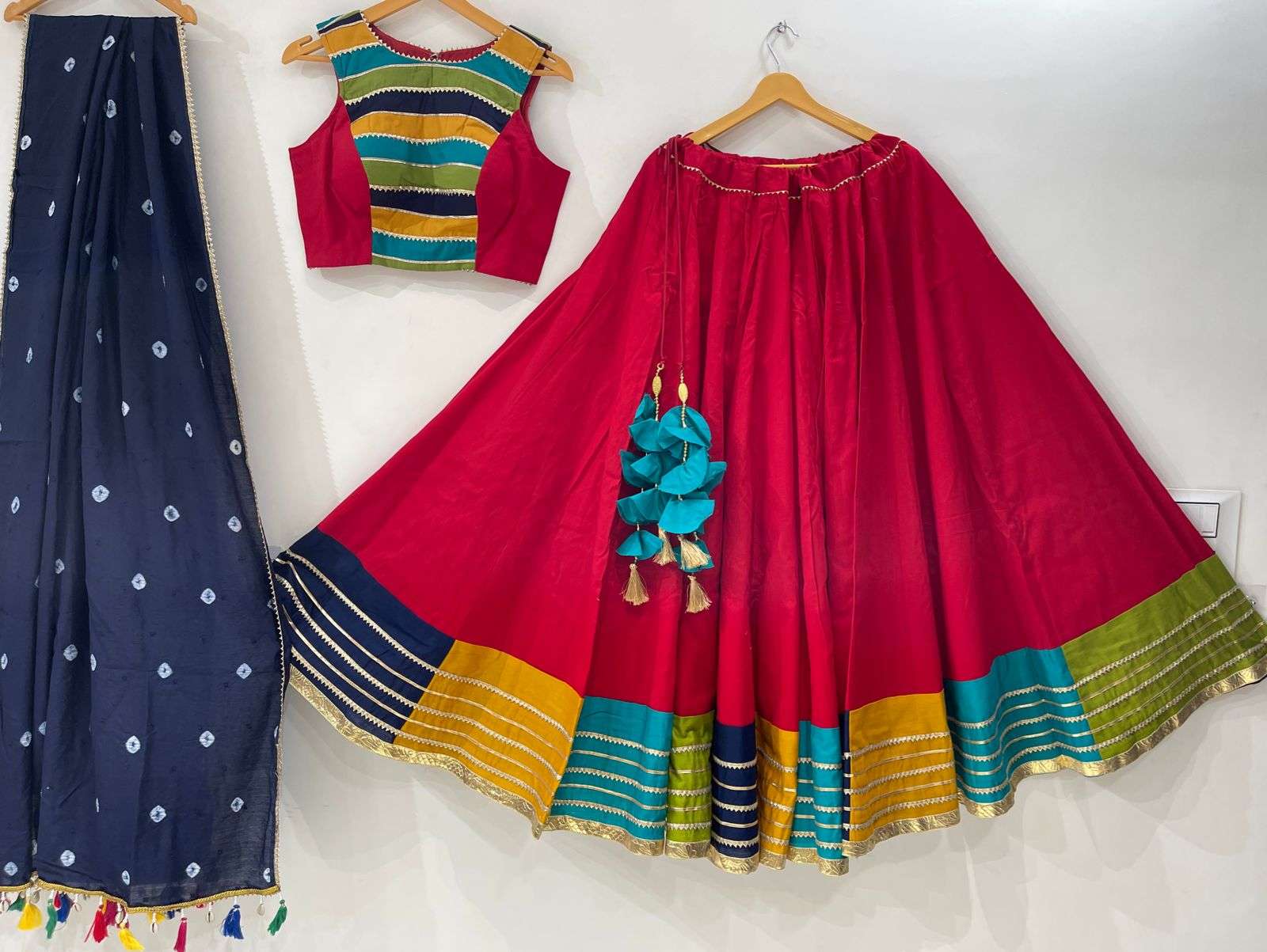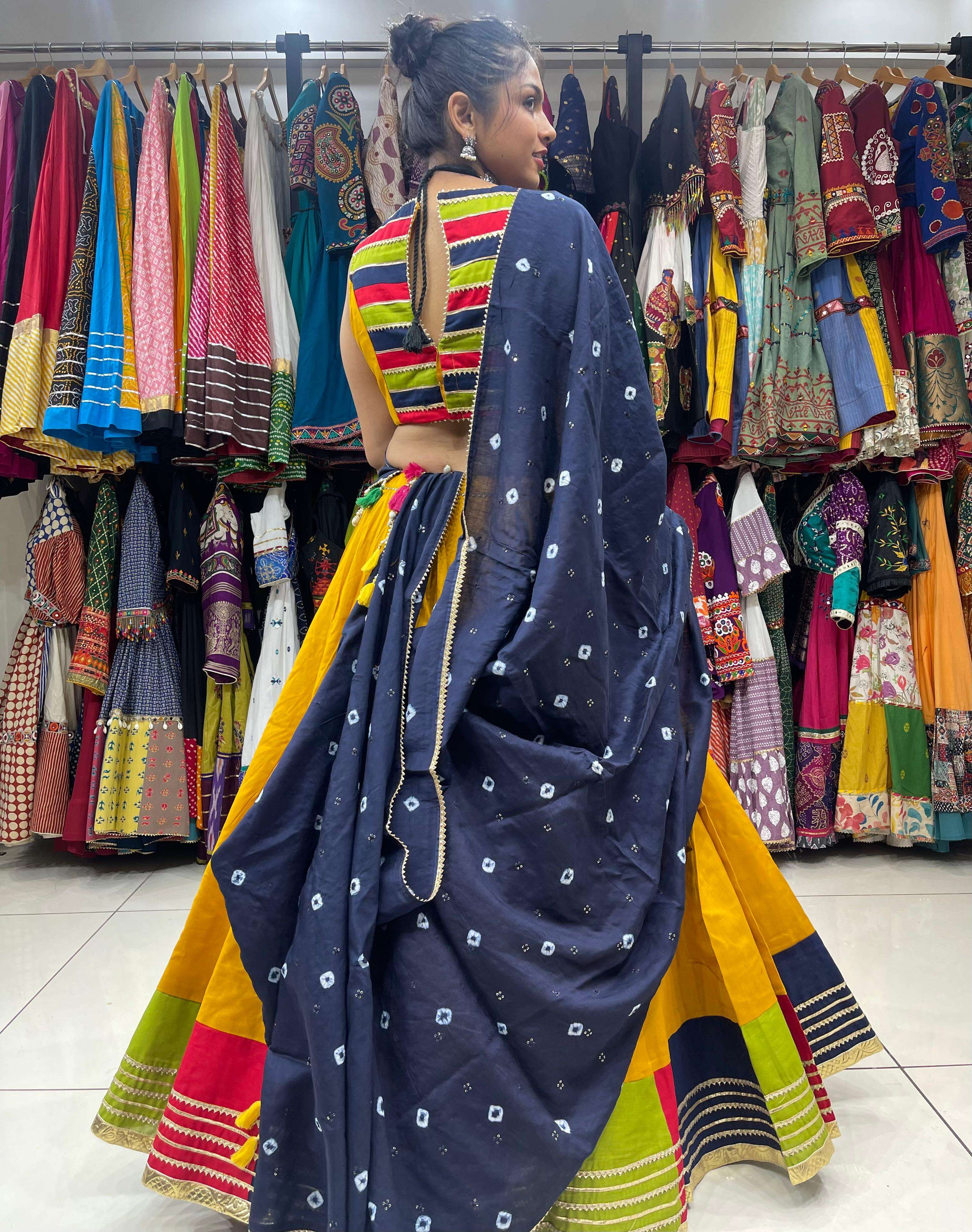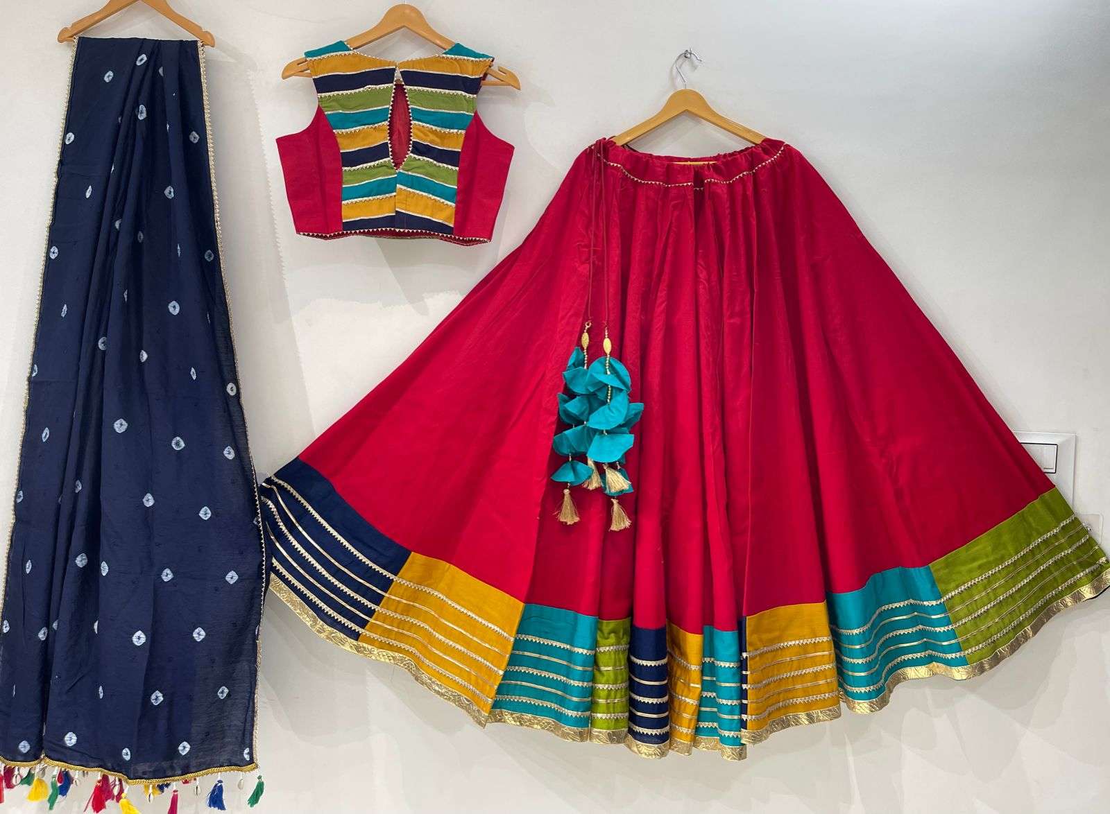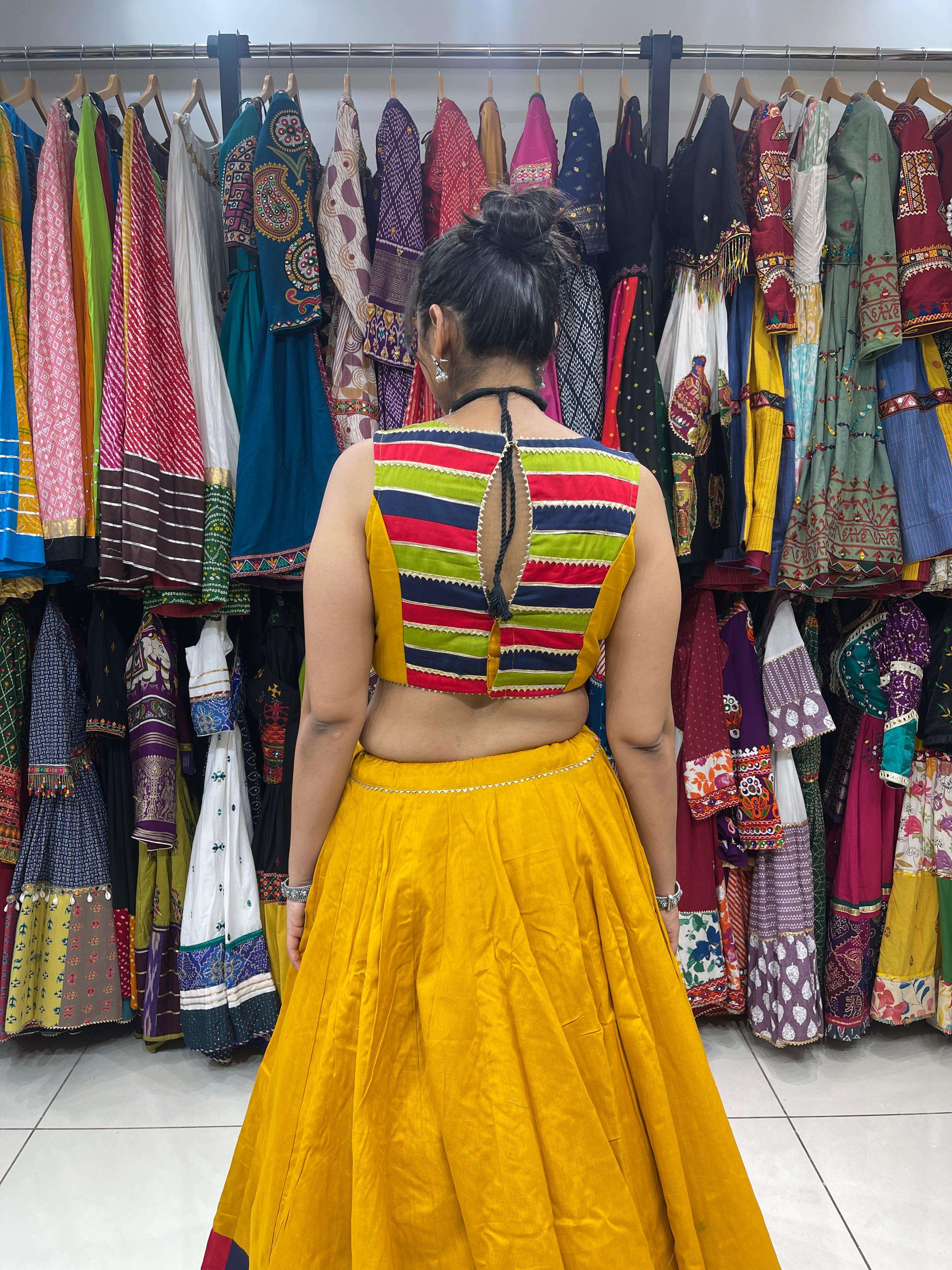 *Skirt/bottom*: *Soft cotton vibrant Bright 3 colour combinations classic Colourful exclusive Elegant Multiple Colour Border 7 to 7.5 Mtrs full flair Chaniya & long colour ful latkan which gives perfect look to lehenga* *Length 40/41”* *Upto 42/44” waist*