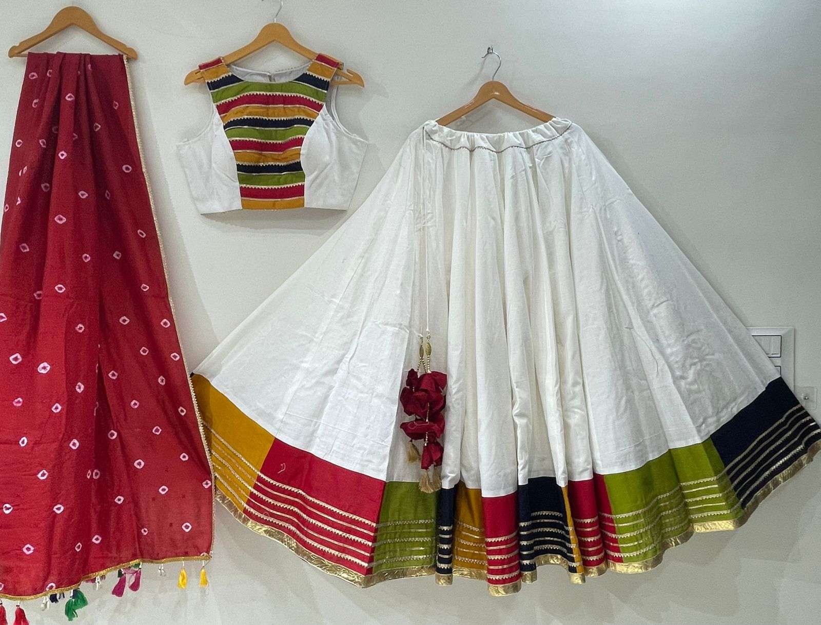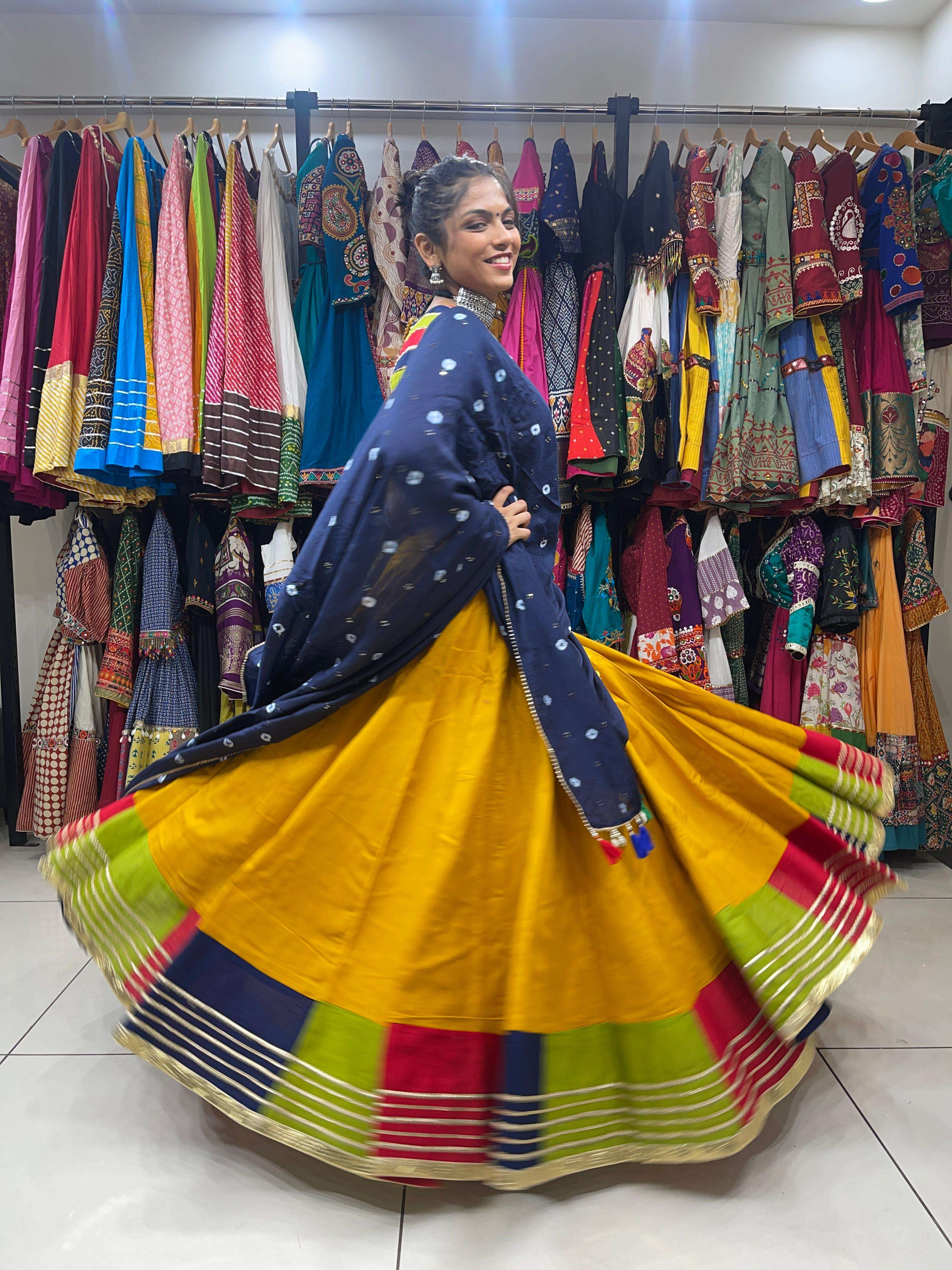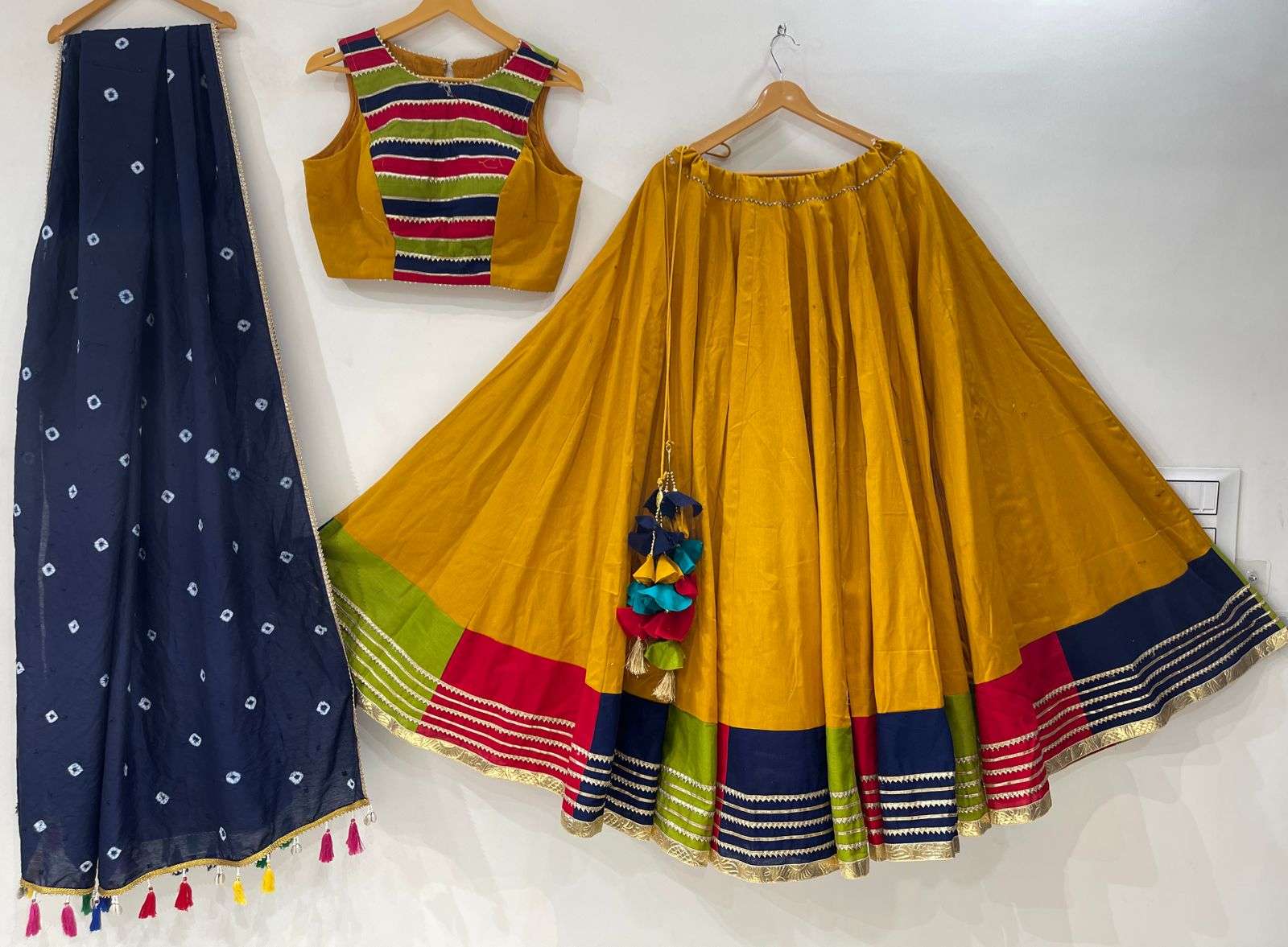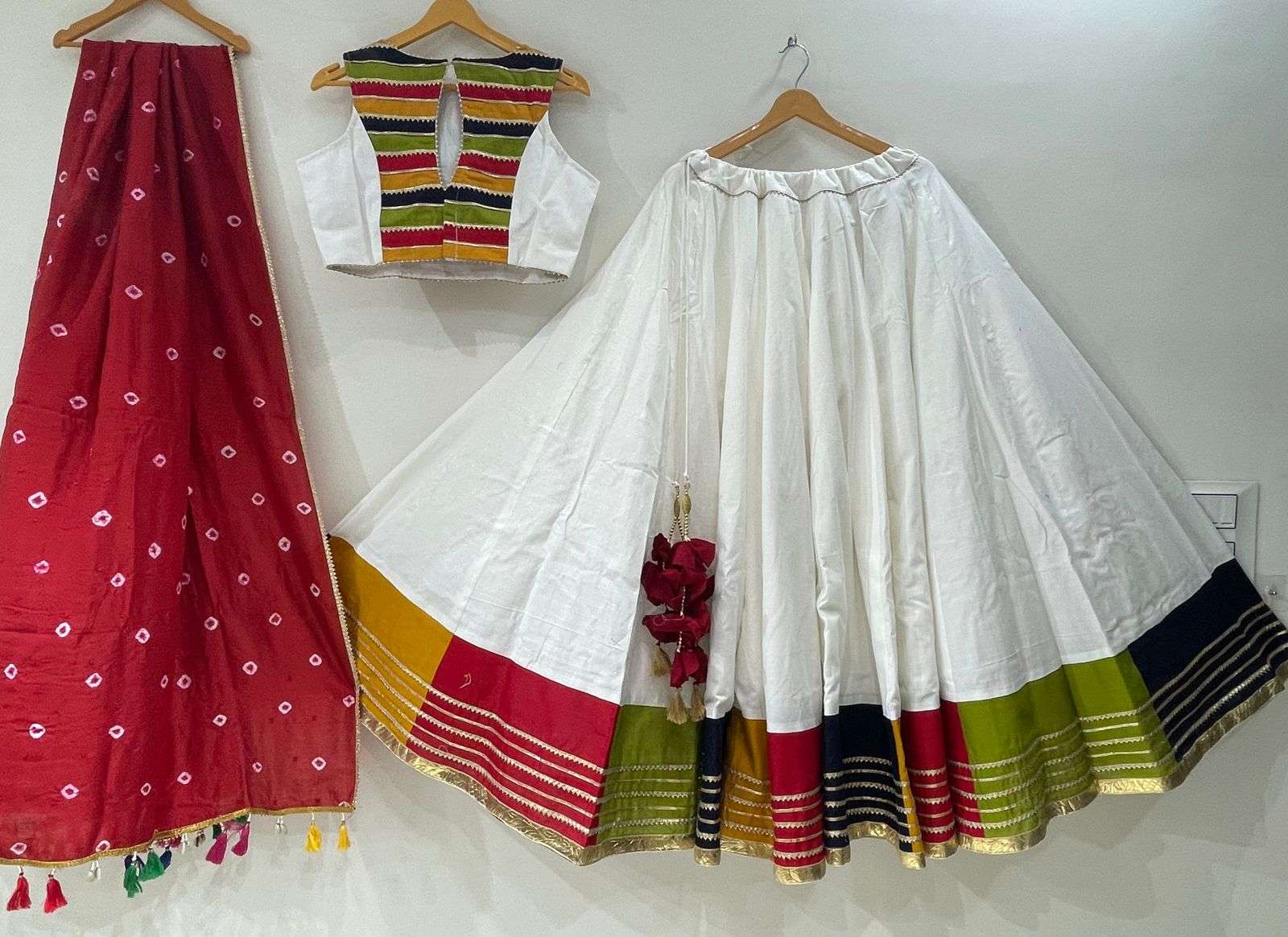 *Skirt/bottom*: *Soft cotton vibrant Bright 3 colour combinations classic Colourful exclusive Elegant Multiple Colour Border 7 to 7.5 Mtrs full flair Chaniya & long colour ful latkan which gives perfect look to lehenga* *Length 40/41”* *Upto 42/44” waist*