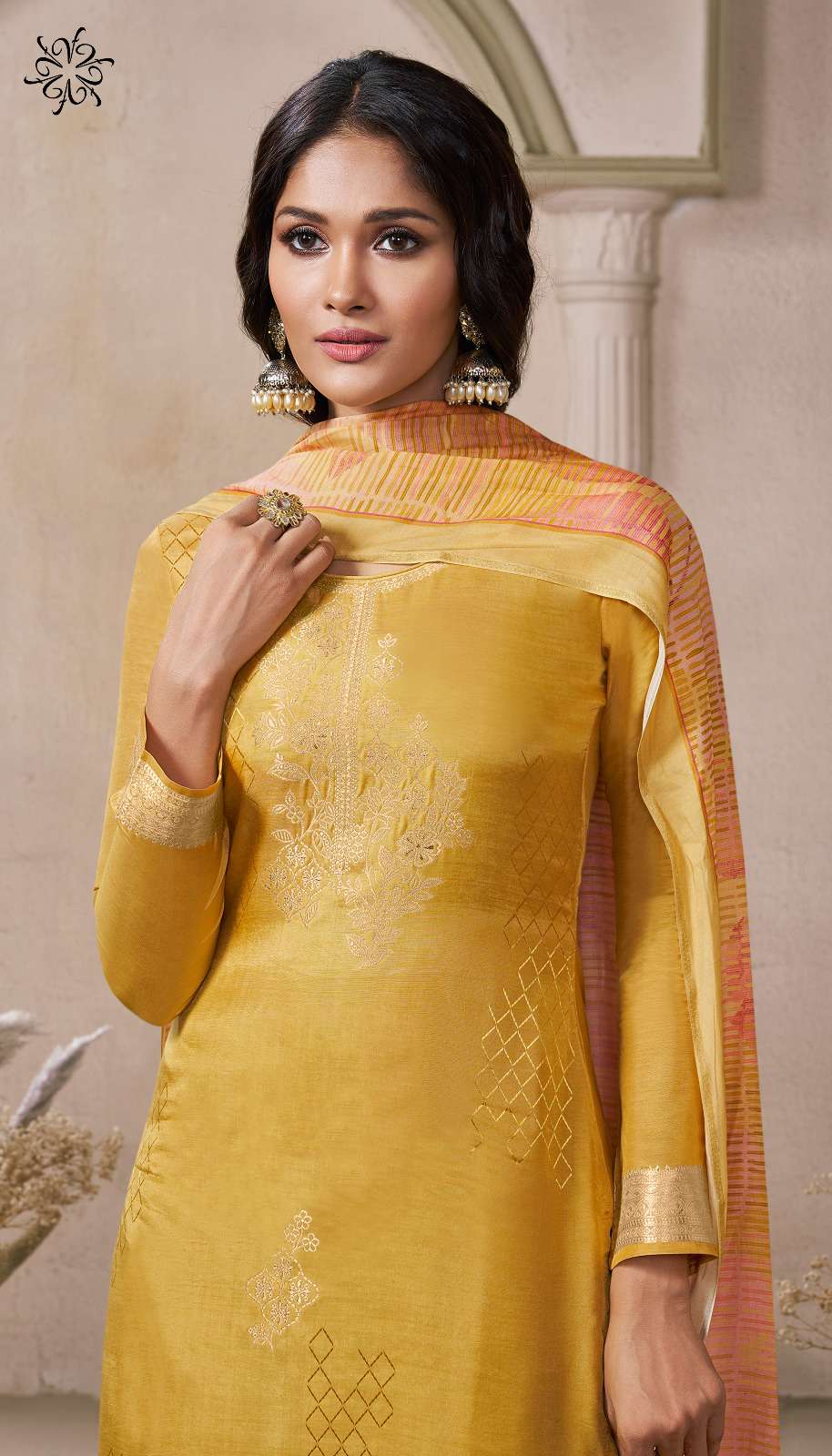 ✨ *Fabric Details:* - *Top/Kurta: Self-Weaved Viscose Machlin Jacquard – rich texture* - *Bottom: Soft & Comfortable Santoon* * *Dupatta: Viscose Machlin with Striking Digital Print* * GST 5% SHIP EXTRA