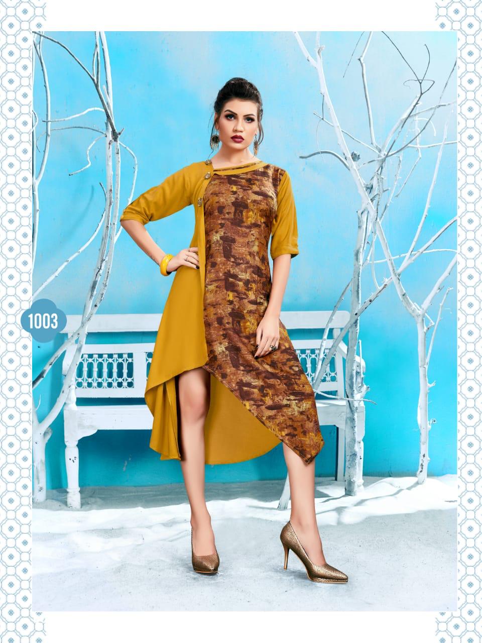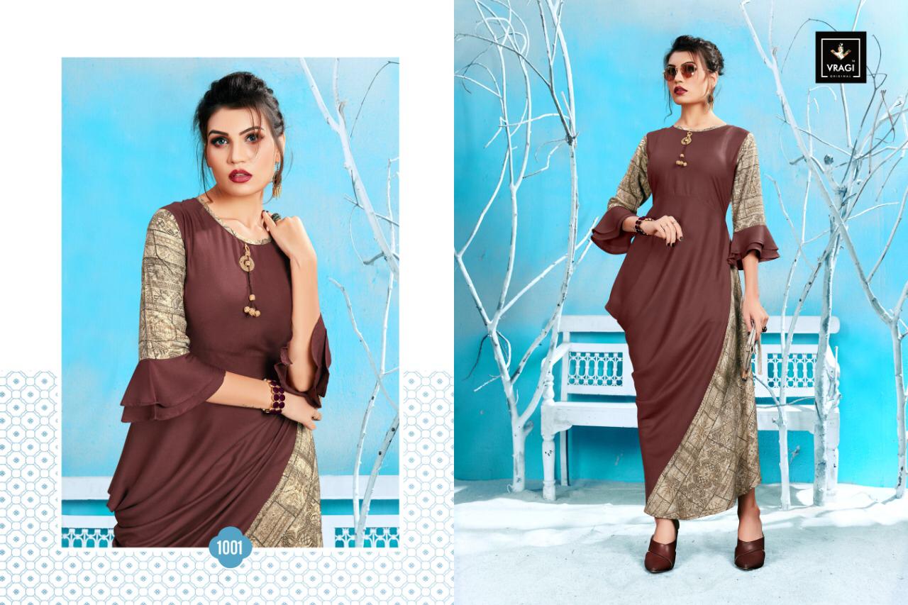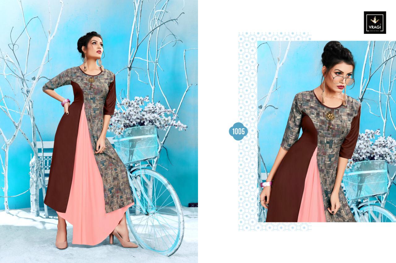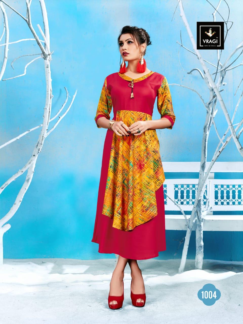 Buy Online Navya By Vragi 1001 Series Designer Reyon Printed Kurti Catlog Wholesaler Surat 5 Pcs of Full Catalogue at Wholesale Price. Looking for Navya By Vragi 1001 Series Designer Reyon Printed Kurti Catlog Wholesaler Surat Full Catalouge at Best Price? Buy Now Navya By Vragi 1001 Series Designer Reyon Printed Kurti Catlog Wholesaler Surat at Wholesale Rate of Rs 2895 with Total 5 Pcs from authroized dealer and supplier of Brand. Cost of Each piece is just only Rs 579 which is very low and affordable price to resale the product in your retail store ,This is Surat based Wholesale Supplier & Dealer of Brand. Click on Brand name to Know more about Brand's products.Call or Whatsapp on 9898838984 for booking or enquiry