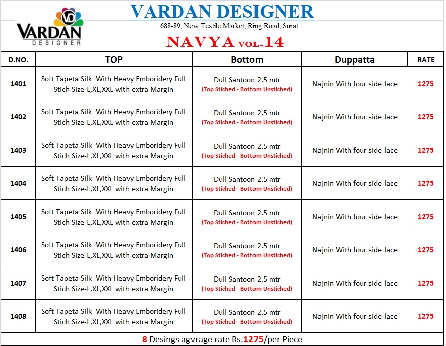 ?ardan Designer Presenting our new catalogue ? *Navya Vol-14* ? Fabric Detail? *?Top* : Soft Tapeta With Embroidery Work inner Stiched Bottom- Heavy Dull Santoon 2.5 mtr approx (Unstiched) Duppata - Najmin With Four Side Lace *Size* *- L , XL , XXL** ?Designs: 0?8? Rate- 1?2?7?5? |