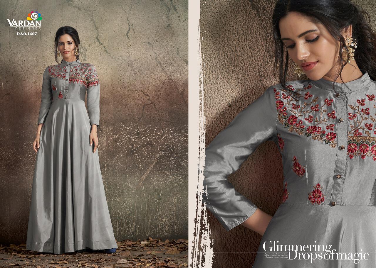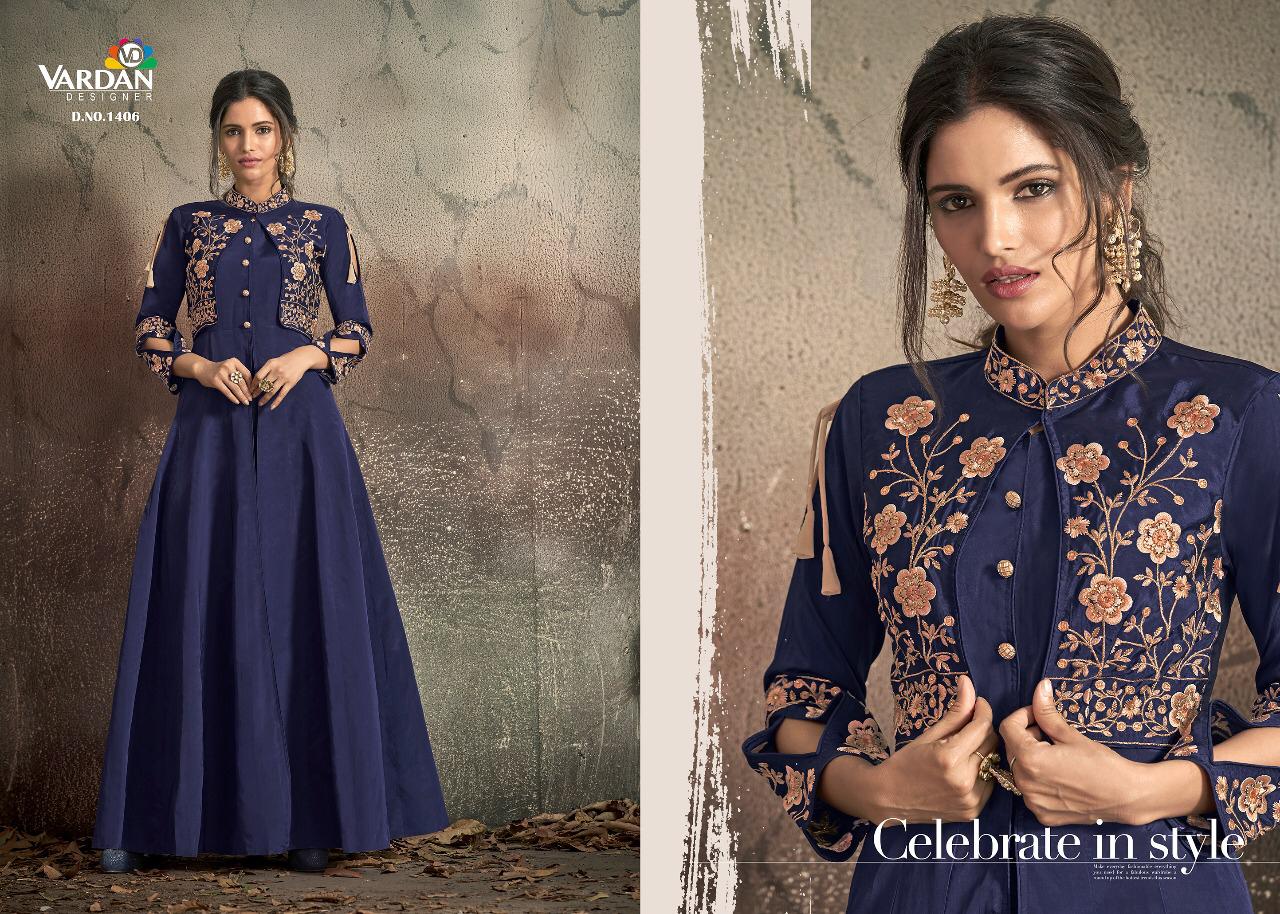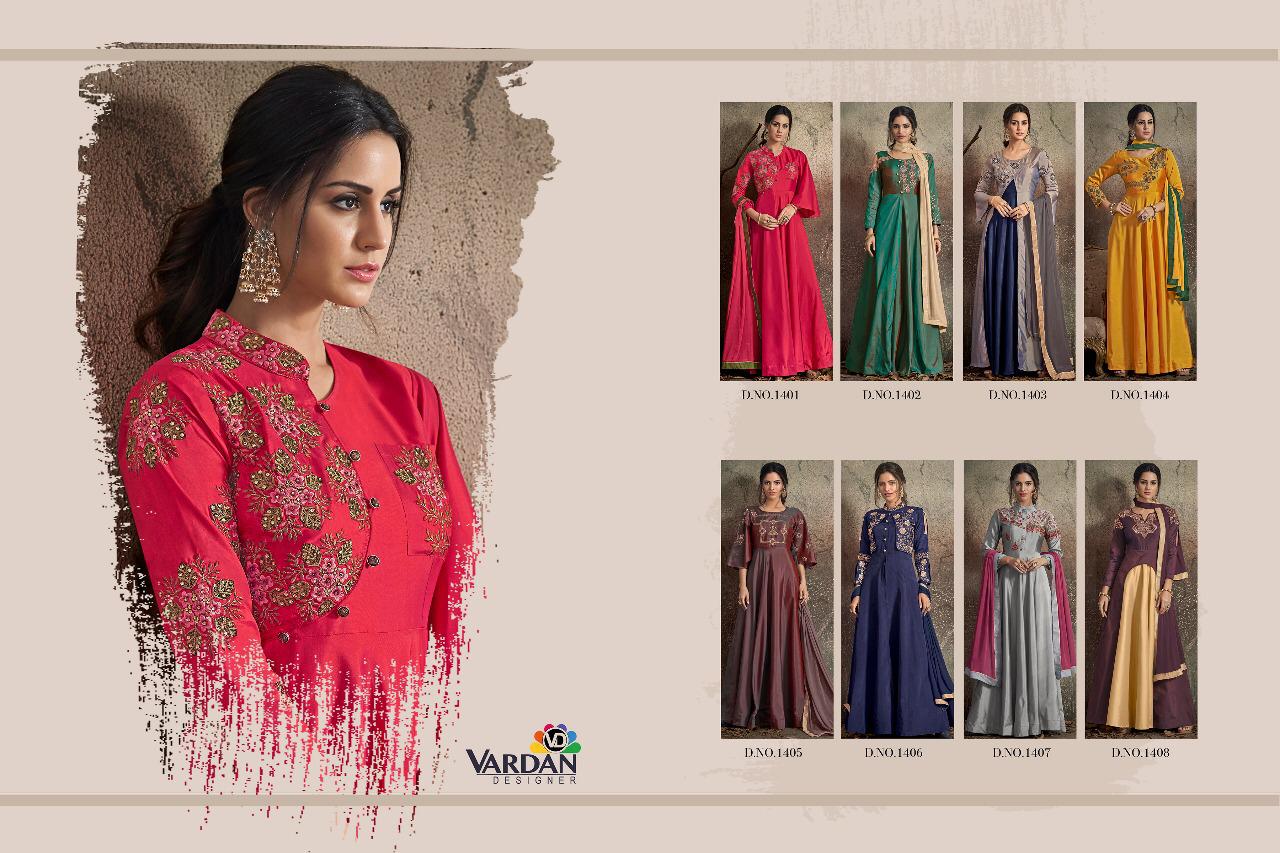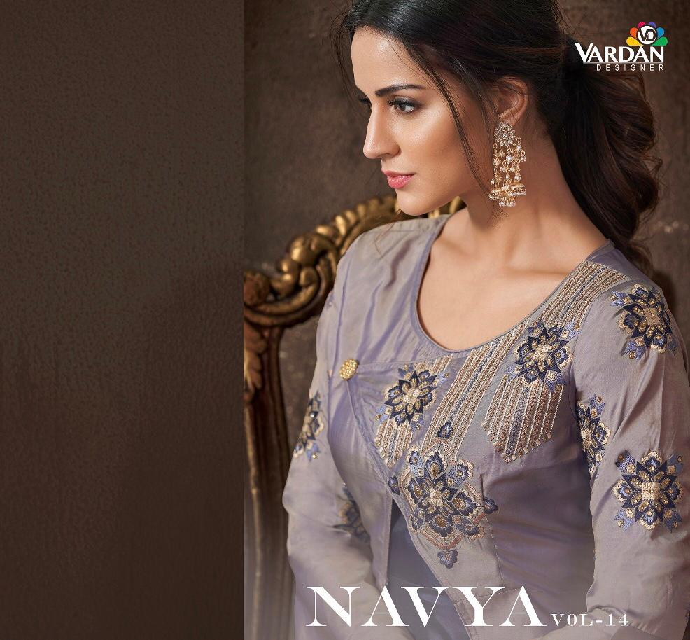 Buy Online Navya Vol 14 By Vardhan Silk Designer Party Wear Gowns Wholesale Supplier Gujarat 8 Pcs of Full Catalogue at Wholesale Price. Looking for Navya Vol 14 By Vardhan Silk Designer Party Wear Gowns Wholesale Supplier Gujarat Full Catalouge at Best Price? Buy Now Navya Vol 14 By Vardhan Silk Designer Party Wear Gowns Wholesale Supplier Gujarat at Wholesale Rate of Rs 10200 with Total 8 Pcs from authroized dealer and supplier of VARDAN DESIGNER Brand. Cost of Each piece is just only Rs 1275 which is very low and affordable price to resale the product in your retail store ,This is Surat based Wholesale Supplier & Dealer of VARDAN DESIGNER Brand. Click on Brand name to Know more about VARDAN DESIGNER Brand's products.Call or Whatsapp on 9898838984 for booking or enquiry