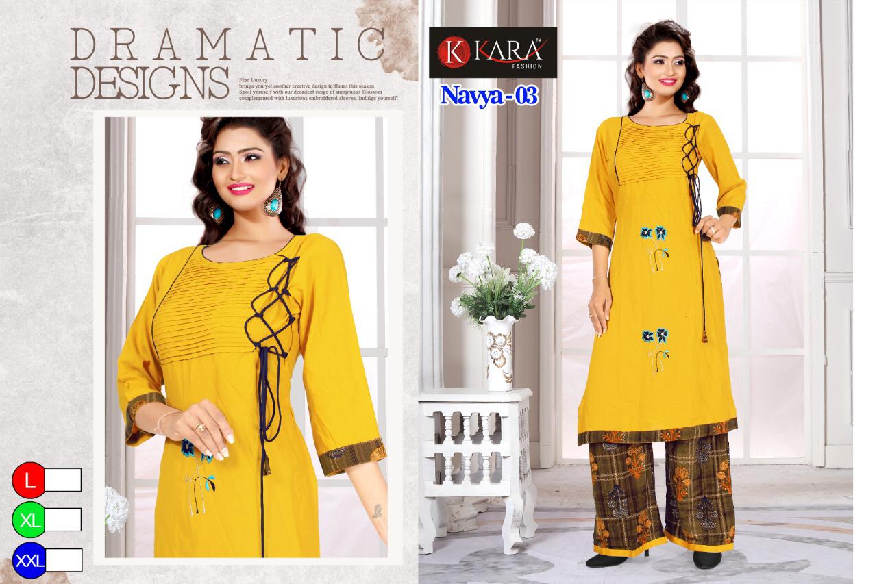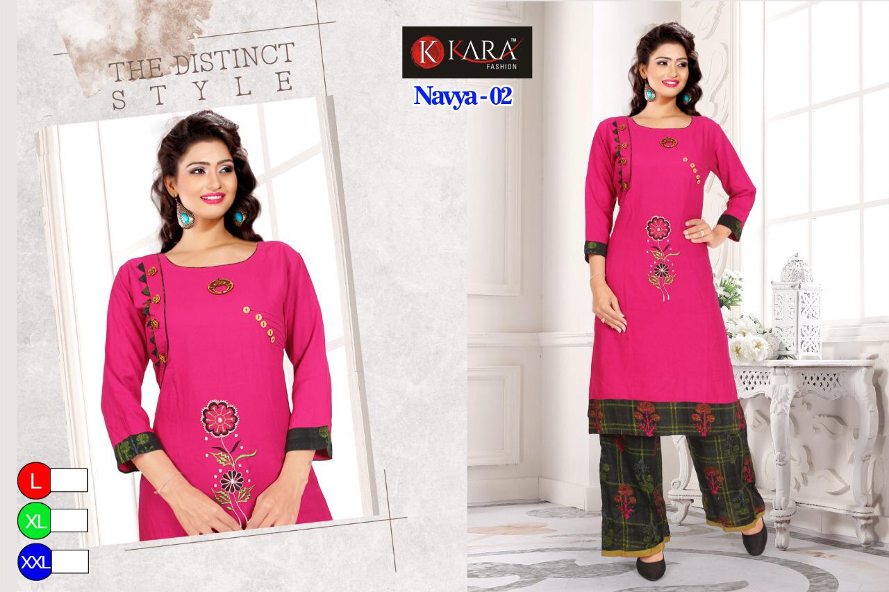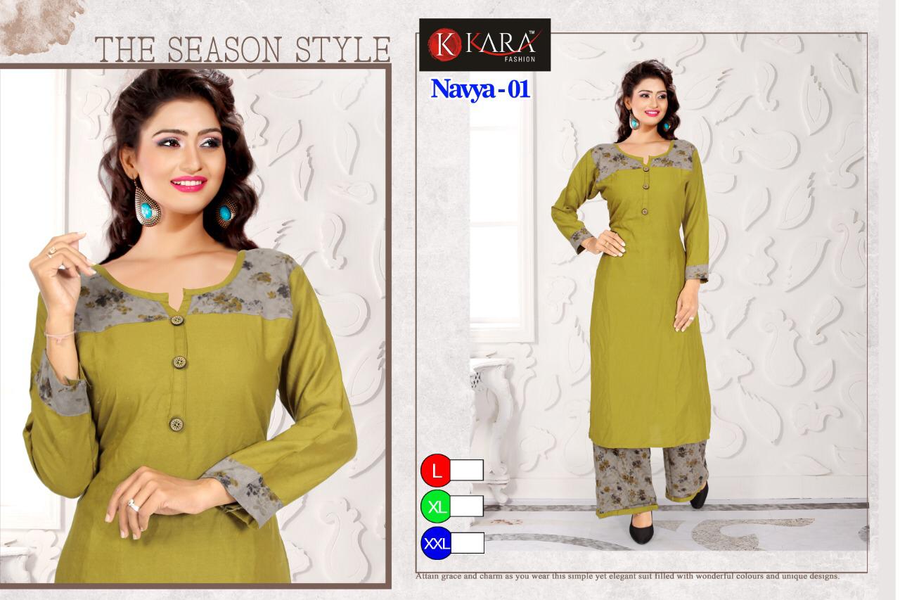 Buy Online Navya Vol 2 By Kara 01 Series Fancy Reyon Kurti With Plazzo Collection Wholesaler Surat 7 Pcs of Full Catalogue at Wholesale Price. Looking for Navya Vol 2 By Kara 01 Series Fancy Reyon Kurti With Plazzo Collection Wholesaler Surat Full Catalouge at Best Price? Buy Now Navya Vol 2 By Kara 01 Series Fancy Reyon Kurti With Plazzo Collection Wholesaler Surat at Wholesale Rate of Rs 4165 with Total 7 Pcs from authroized dealer and supplier of KAARA Brand. Cost of Each piece is just only Rs 595 which is very low and affordable price to resale the product in your retail store ,This is Surat based Wholesale Supplier & Dealer of KAARA Brand. Click on Brand name to Know more about KAARA Brand's products.Call or Whatsapp on 9898838984 for booking or enquiry