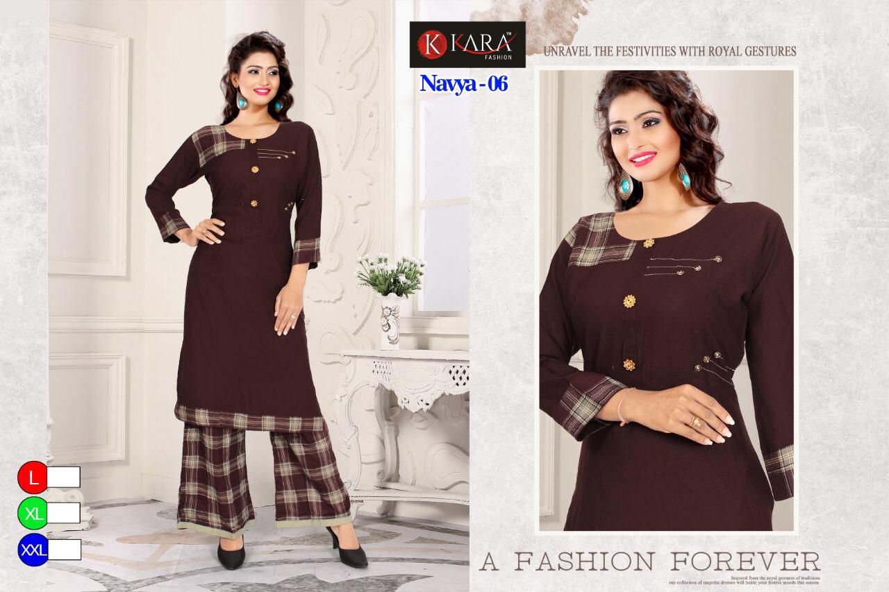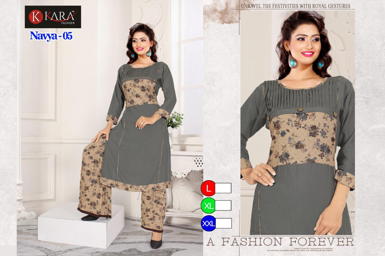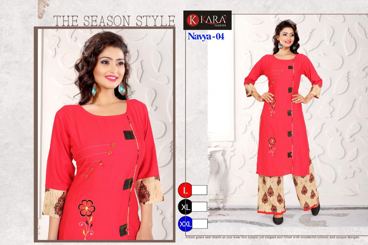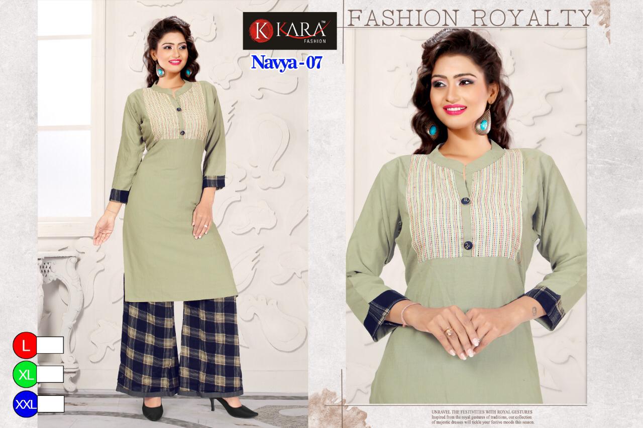 Buy Online Navya Vol 2 By Kara 01 Series Fancy Reyon Kurti With Plazzo Collection Wholesaler Surat 7 Pcs of Full Catalogue at Wholesale Price. Looking for Navya Vol 2 By Kara 01 Series Fancy Reyon Kurti With Plazzo Collection Wholesaler Surat Full Catalouge at Best Price? Buy Now Navya Vol 2 By Kara 01 Series Fancy Reyon Kurti With Plazzo Collection Wholesaler Surat at Wholesale Rate of Rs 4165 with Total 7 Pcs from authroized dealer and supplier of KAARA Brand. Cost of Each piece is just only Rs 595 which is very low and affordable price to resale the product in your retail store ,This is Surat based Wholesale Supplier & Dealer of KAARA Brand. Click on Brand name to Know more about KAARA Brand's products.Call or Whatsapp on 9898838984 for booking or enquiry