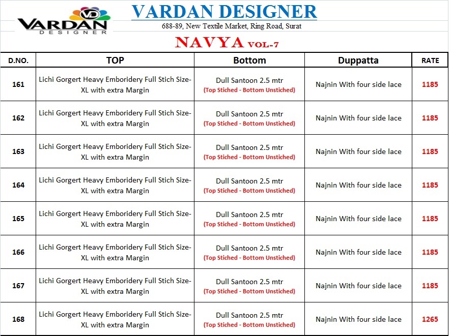 ?ardan Designer Thanks for your love? and support ??. Presenting our new catalogue ?Navya Vol-7?? Fabric Detail? ?Top: Lichi Gorgert with inner *Stitched* size -XL with Extra Margin *Dupatta* : Najmin four side lace Bottom- Dull Santoon 2.5 MTR *Unstiched* ?Designs: 0?8? Rate- 1?1?9?5? ?Dispatching- 1? August |
