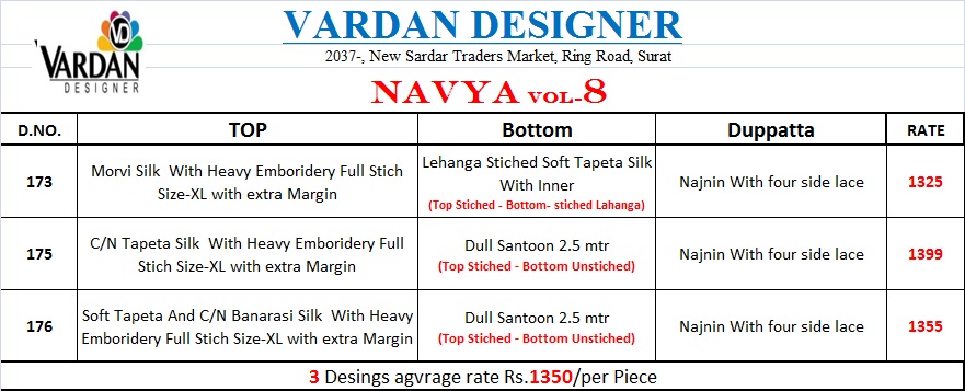 ?ardan Designer ?Navya Vol-8?? Fabric Detail? *?Top* : Soft Tapeta, C/N Banarasi, Morvi Silk with inner *Stitched* size -XL with Extra Margin with Can-Can Net *Dupatta* : Najmin four side lace *Bottom* - Dull Santoon 2.5 MTR *Unstiched* And Lahnga Description in image Below ?Designs: 0?3? Rate - 1?3?5?0? Single Extra 100 |