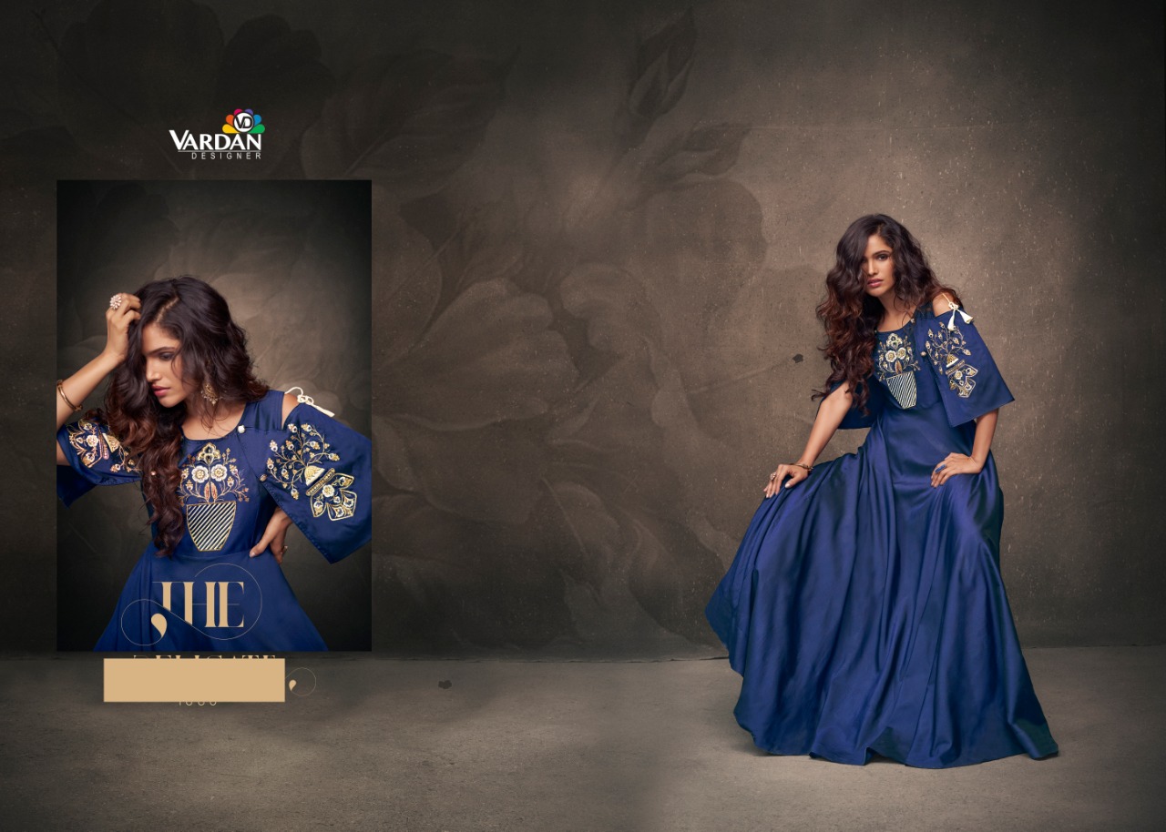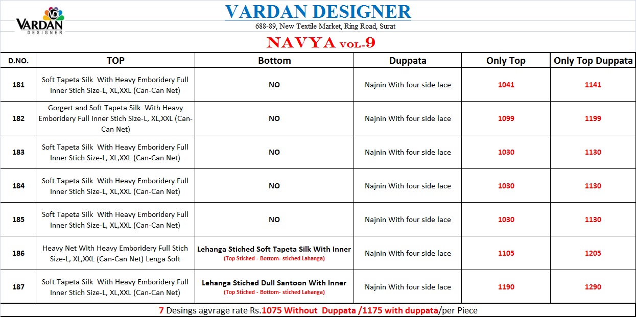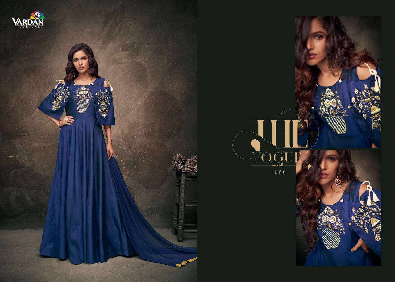 Buy Online Navya Vol 9 By Vardan Designer 181 Series Fancy Designer Gown Suit Collection Wholesale Dealer And Supplier Surat 7 Pcs of Full Catalogue at Wholesale Price. Looking for Navya Vol 9 By Vardan Designer 181 Series Fancy Designer Gown Suit Collection Wholesale Dealer And Supplier Surat Full Catalouge at Best Price? Buy Now Navya Vol 9 By Vardan Designer 181 Series Fancy Designer Gown Suit Collection Wholesale Dealer And Supplier Surat at Wholesale Rate of Rs 7525 with Total 7 Pcs from authroized dealer and supplier of VARDAN DESIGNER Brand. Cost of Each piece is just only Rs 1075 which is very low and affordable price to resale the product in your retail store ,This is Surat based Wholesale Supplier & Dealer of VARDAN DESIGNER Brand. Click on Brand name to Know more about VARDAN DESIGNER Brand's products.Call or Whatsapp on 9898838984 for booking or enquiry