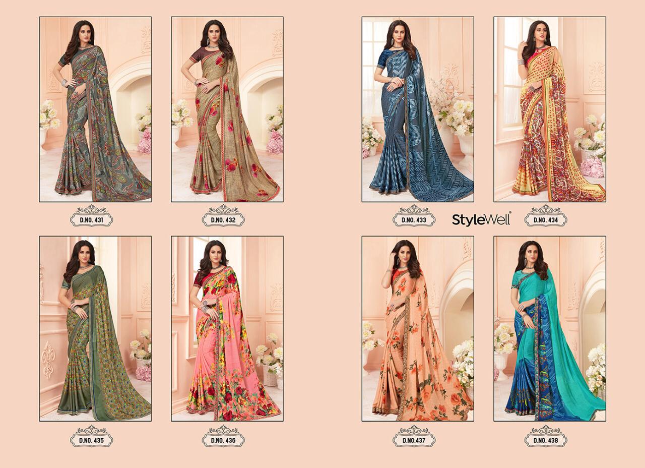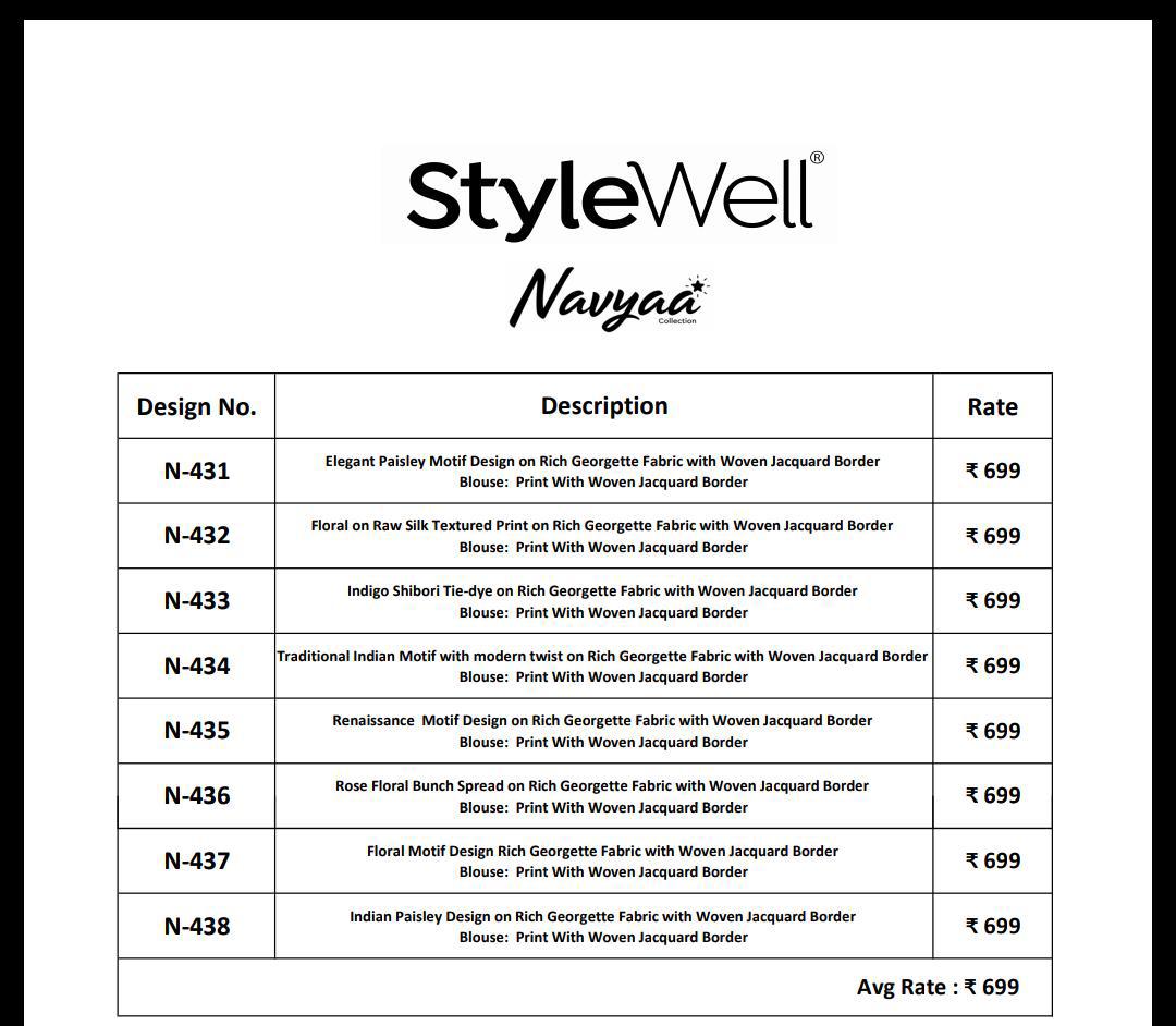 Buy Online Navyaa By Stylewell Series N 431 To N 438 Georgette Designer Party Wear Sarees Wholesale Supplier Surat 8 Pcs of Full Catalogue at Wholesale Price. Looking for Navyaa By Stylewell Series N 431 To N 438 Georgette Designer Party Wear Sarees Wholesale Supplier Surat Full Catalouge at Best Price? Buy Now Navyaa By Stylewell Series N 431 To N 438 Georgette Designer Party Wear Sarees Wholesale Supplier Surat at Wholesale Rate of Rs 5592 with Total 8 Pcs from authroized dealer and supplier of STYLE WELL Brand. Cost of Each piece is just only Rs 699 which is very low and affordable price to resale the product in your retail store ,This is Surat based Wholesale Supplier & Dealer of STYLE WELL Brand. Click on Brand name to Know more about STYLE WELL Brand's products.Call or Whatsapp on 9898838984 for booking or enquiry