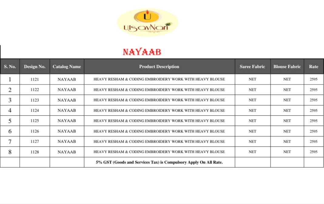 *Utsav nari* My New Catalog Launching Today NAYAAB Fabric details *Work details* HEAVY RESHAM & CODING EMBROIDERY WORK WITH HEAVY BLOUSE Saree Net Blouse Net Rate 2595+5% GST Single 100+ |