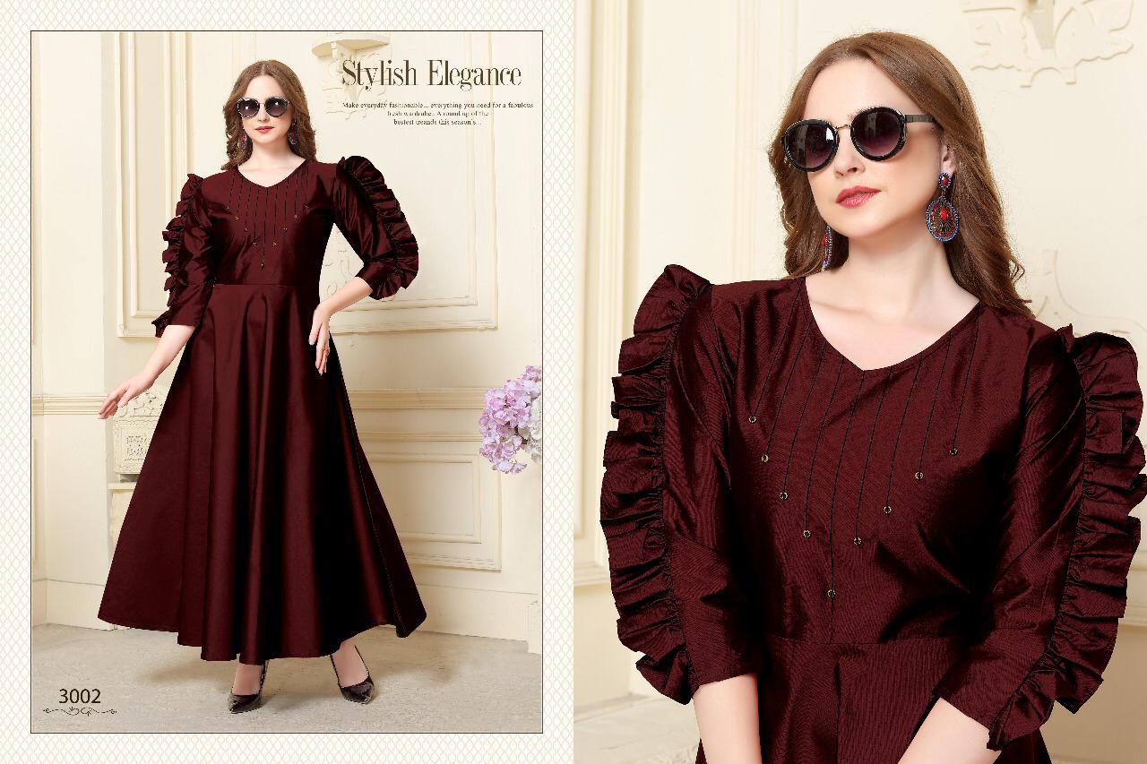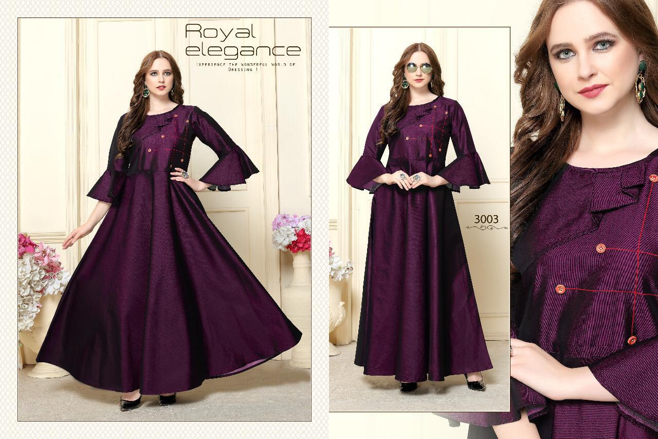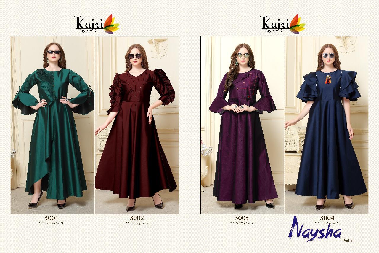 Buy Online Naysha Vol 3 By Kajri Style Tefeta Silk Designer Gowns Wholesale Supplier Surat 4 Pcs of Full Catalogue at Wholesale Price. Looking for Naysha Vol 3 By Kajri Style Tefeta Silk Designer Gowns Wholesale Supplier Surat Full Catalouge at Best Price? Buy Now Naysha Vol 3 By Kajri Style Tefeta Silk Designer Gowns Wholesale Supplier Surat at Wholesale Rate of Rs 2380 with Total 4 Pcs from authroized dealer and supplier of KAJRI STYLE Brand. Cost of Each piece is just only Rs 595 which is very low and affordable price to resale the product in your retail store ,This is Surat based Wholesale Supplier & Dealer of KAJRI STYLE Brand. Click on Brand name to Know more about KAJRI STYLE Brand's products.Call or Whatsapp on 9898838984 for booking or enquiry