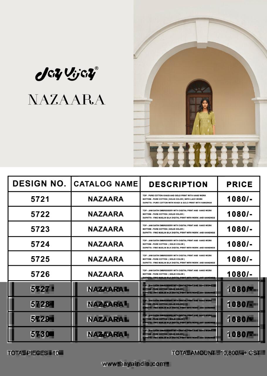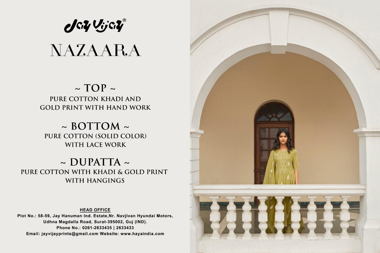 Buy Online Nazaara By Jay Vijay Fashion Pure Cotton Khadi Suits 10 Pcs of Full Catalogue at Wholesale Price. Looking for Nazaara By Jay Vijay Fashion Pure Cotton Khadi Suits Full Catalouge at Best Price? Buy Now Nazaara By Jay Vijay Fashion Pure Cotton Khadi Suits at Wholesale Rate of Rs 10800 with Total 10 Pcs from authroized dealer and supplier of JAY VIJAY Brand. Cost of Each piece is just only Rs 1080 which is very low and affordable price to resale the product in your retail store ,This is Surat based Wholesale Supplier & Dealer of JAY VIJAY Brand. Click on Brand name to Know more about JAY VIJAY Brand's products.Call or Whatsapp on 9898838984 for booking or enquiry