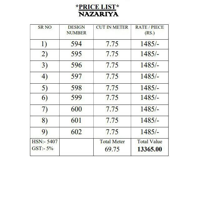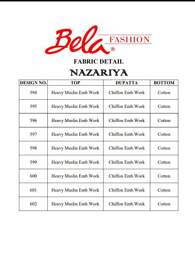 Brand - Bela . Catlog name - NAZARIYA . Series -594 to 602. * set & Loose* Single Extra 100 on company price list GST 5 Percent Extra. Delivery from- 06-08-19 |