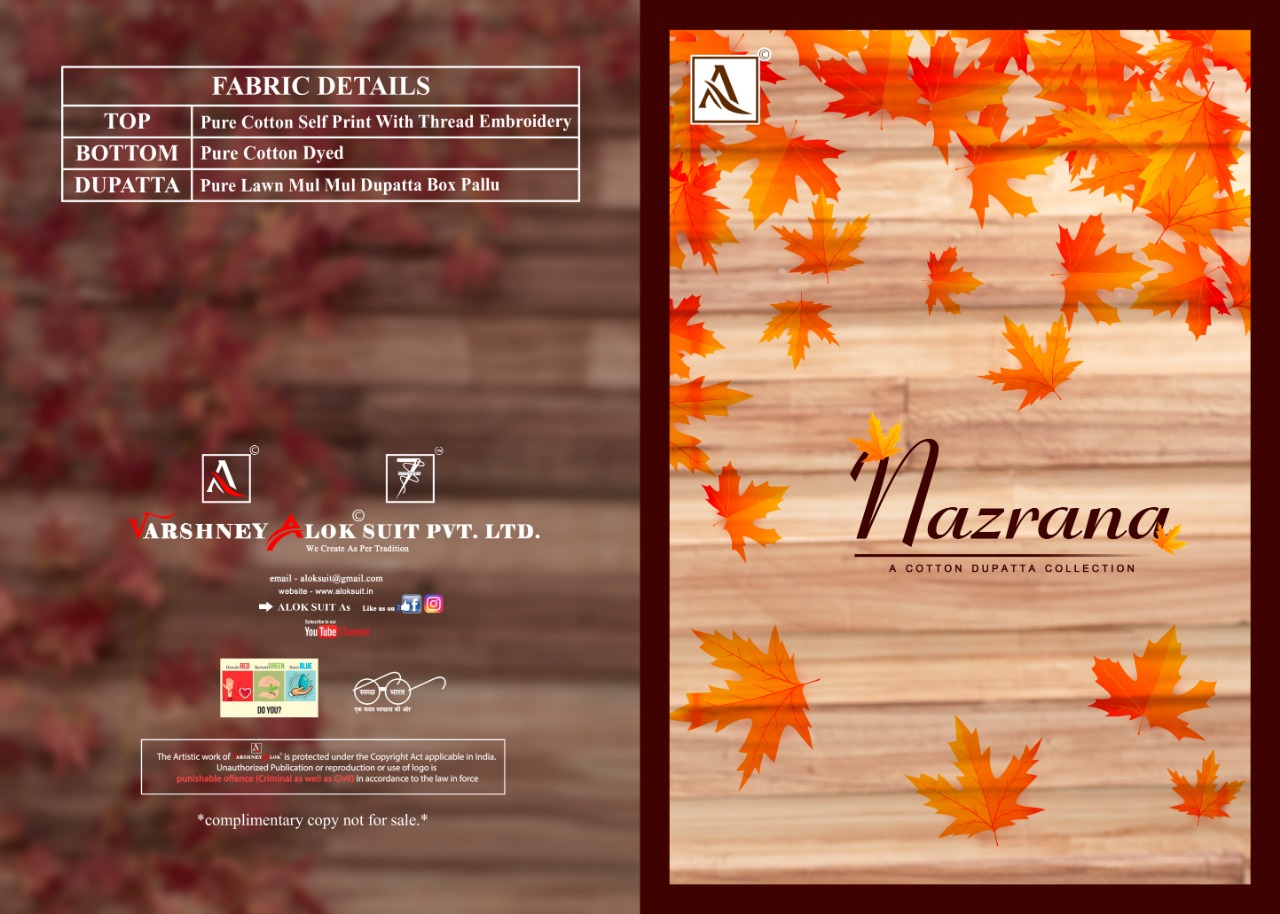 Buy Online Nazrana By Alok Suits Cambric Cotton Suits Wholesale Supplier Surat 10 Pcs of Full Catalogue at Wholesale Price. Looking for Nazrana By Alok Suits Cambric Cotton Suits Wholesale Supplier Surat Full Catalouge at Best Price? Buy Now Nazrana By Alok Suits Cambric Cotton Suits Wholesale Supplier Surat at Wholesale Rate of Rs 6750 with Total 10 Pcs from authroized dealer and supplier of BRAND'S Brand. Cost of Each piece is just only Rs 675 which is very low and affordable price to resale the product in your retail store ,This is Surat based Wholesale Supplier & Dealer of BRAND'S Brand. Click on Brand name to Know more about BRAND'S Brand's products.Call or Whatsapp on 9898838984 for booking or enquiry