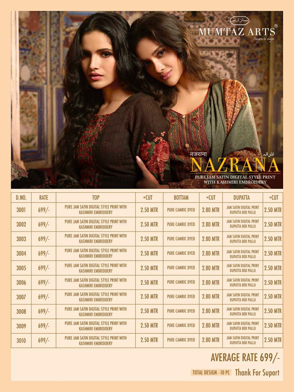 Buy Online Nazrana By Mumtaz Arts Jam Satin Dress Materials Wholesale Supplier Surat 10 Pcs of Full Catalogue at Wholesale Price. Looking for Nazrana By Mumtaz Arts Jam Satin Dress Materials Wholesale Supplier Surat Full Catalouge at Best Price? Buy Now Nazrana By Mumtaz Arts Jam Satin Dress Materials Wholesale Supplier Surat at Wholesale Rate of Rs 6990 with Total 10 Pcs from authroized dealer and supplier of MUMTAZ ARTS Brand. Cost of Each piece is just only Rs 699 which is very low and affordable price to resale the product in your retail store ,This is Surat based Wholesale Supplier & Dealer of MUMTAZ ARTS Brand. Click on Brand name to Know more about MUMTAZ ARTS Brand's products.Call or Whatsapp on 9898838984 for booking or enquiry