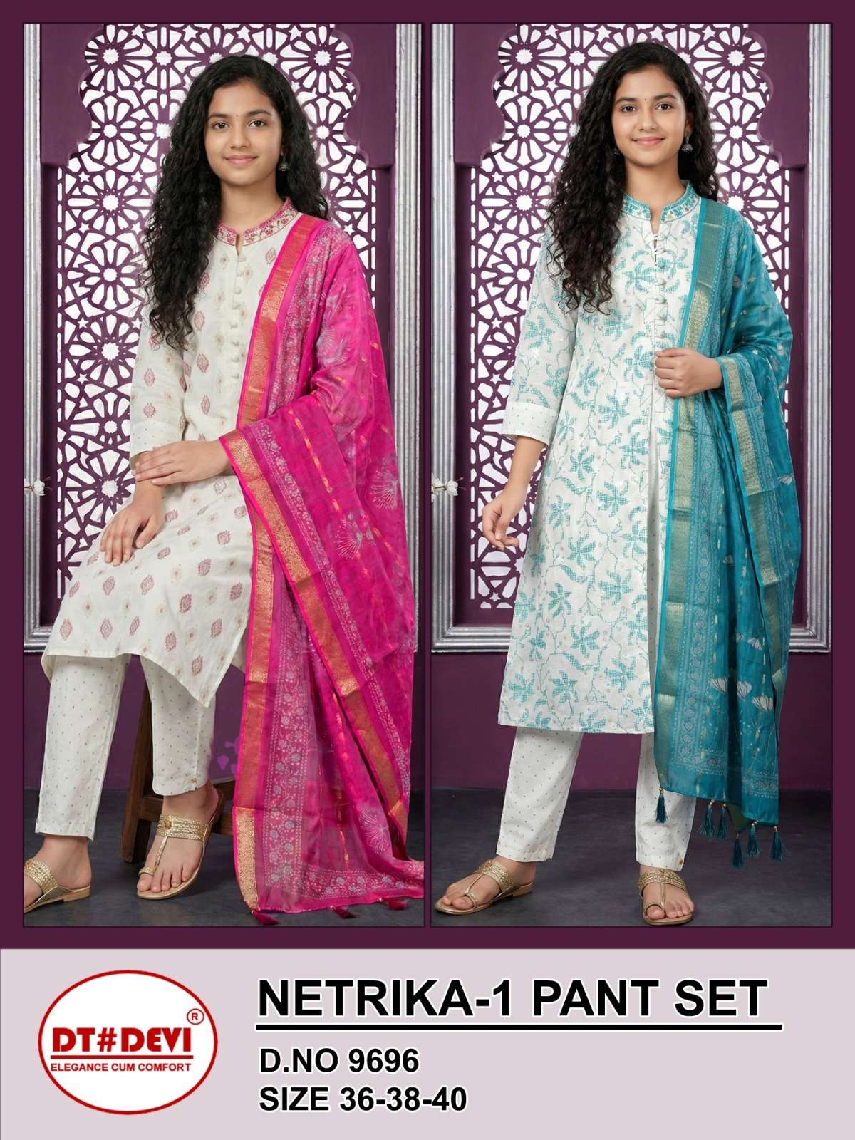 🌟 D.NO 9696 🌟NETRIKA-1 PANT SET 🌟SIZE - 36-38-40 🌟COLOURS - 2 🌟1 SET - 6 PCS 🌟FABRIC TOP & BOTTOM - ROMAN SILK WITH DIGITAL DUPATTA 🌟RATE - 685/- 🌟EMBROIDERY WORK IN COLLAR