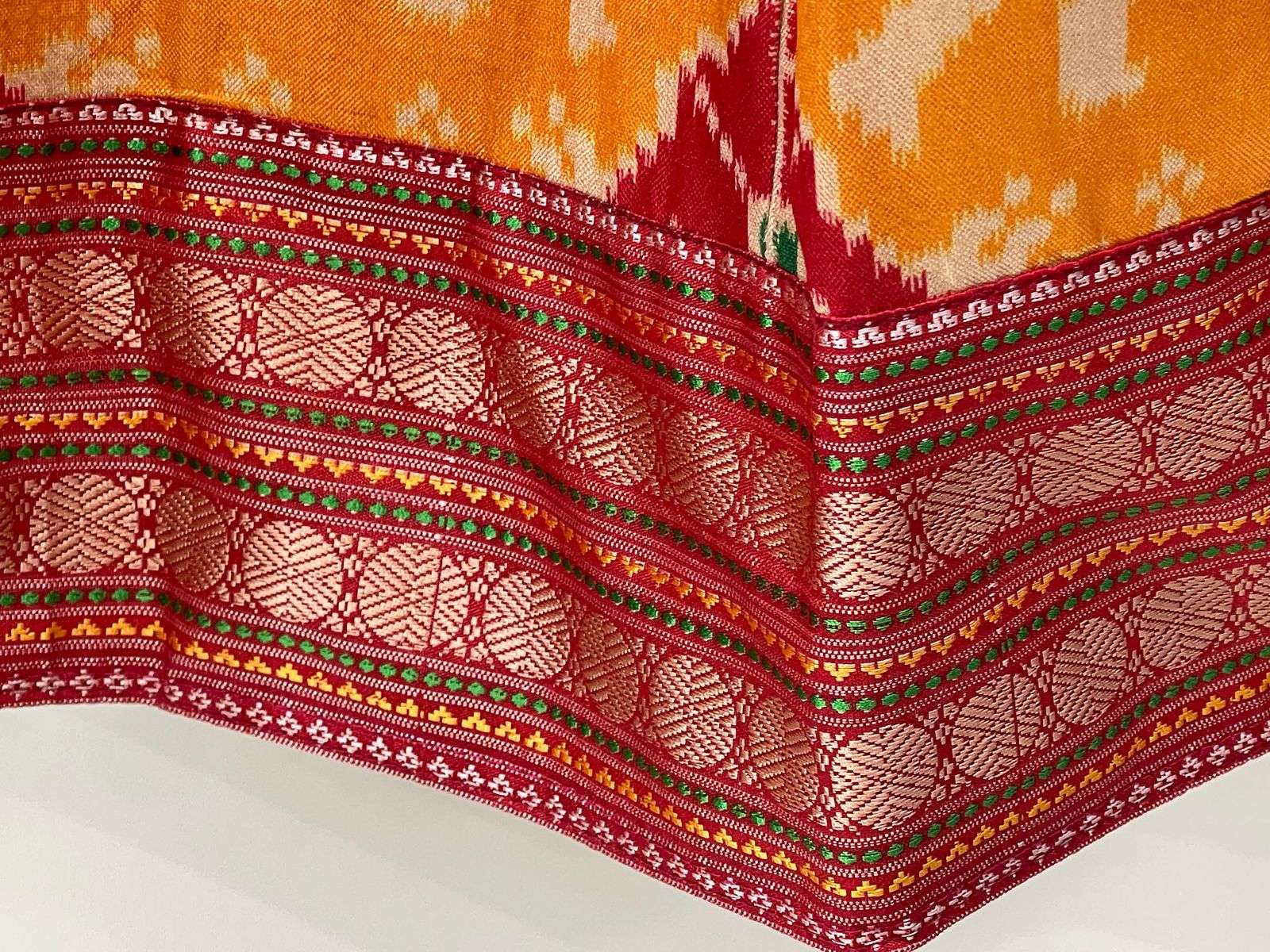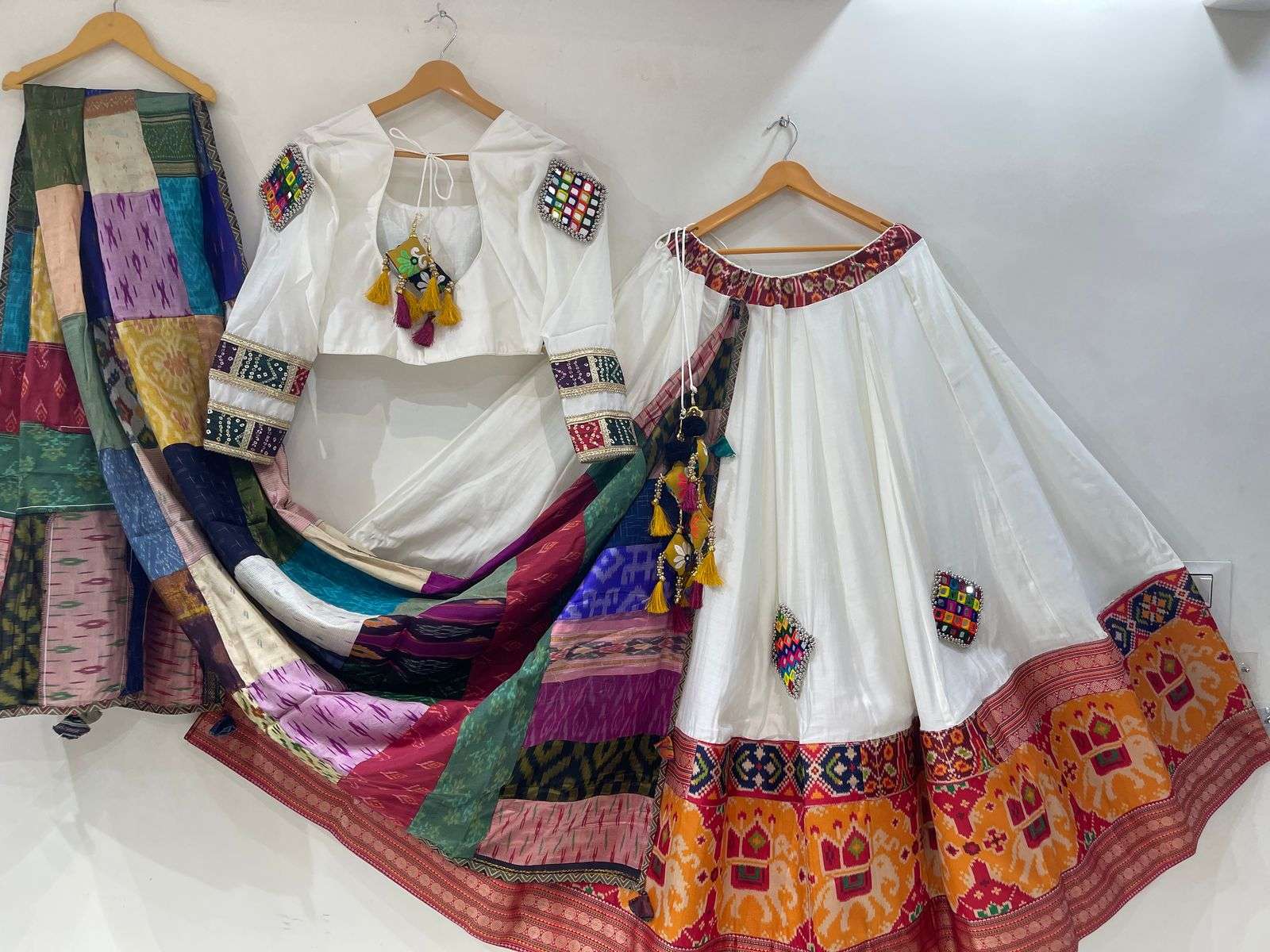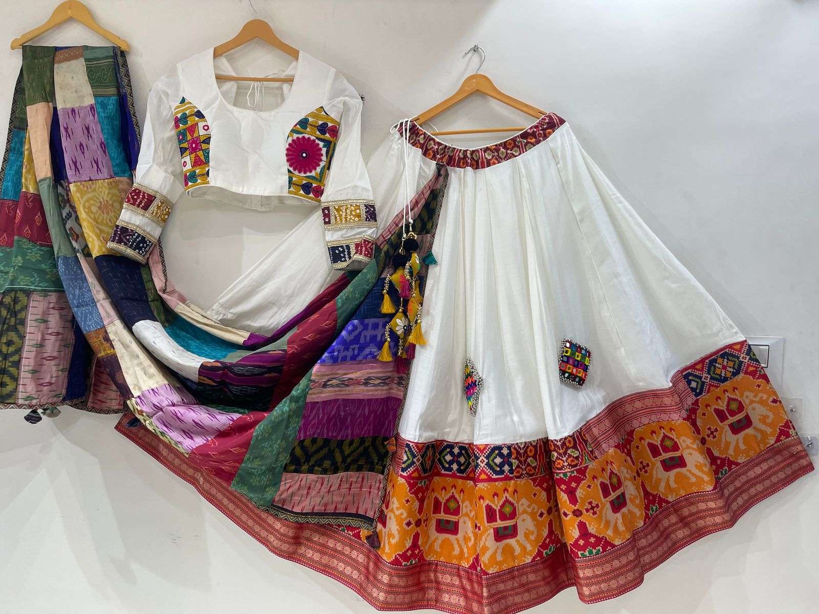 *Skirt/bottom*: *Bombay Silk Sober Classic Elegant touch traditional border sober look Handloom Digital Royal print chaniya with approx 5 to 5.5 Mtrs flair with Rabari Moti Work Butta patch hand 🤚 stitches good aster heavy quality side zip on waist & best quality latkan gives perfect look to lehenga* *Length 40/41”* *Upto 42”waist*