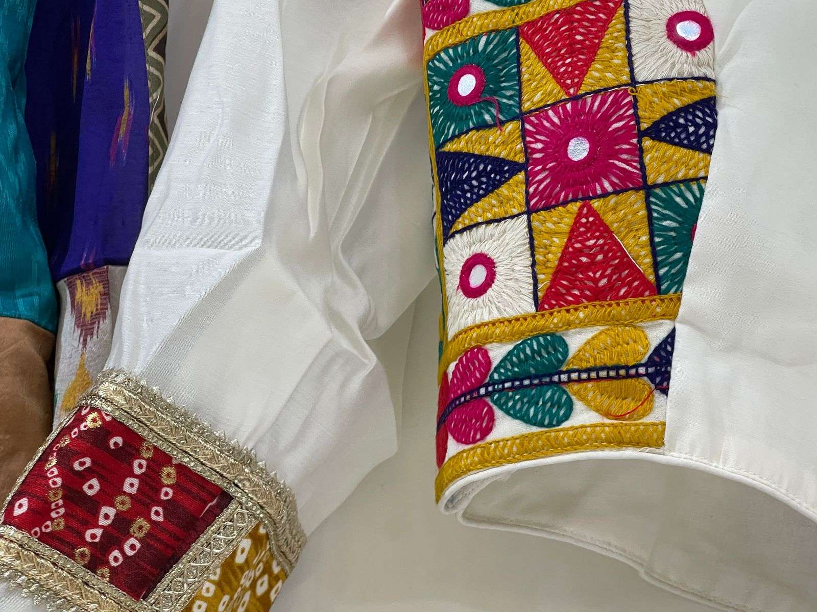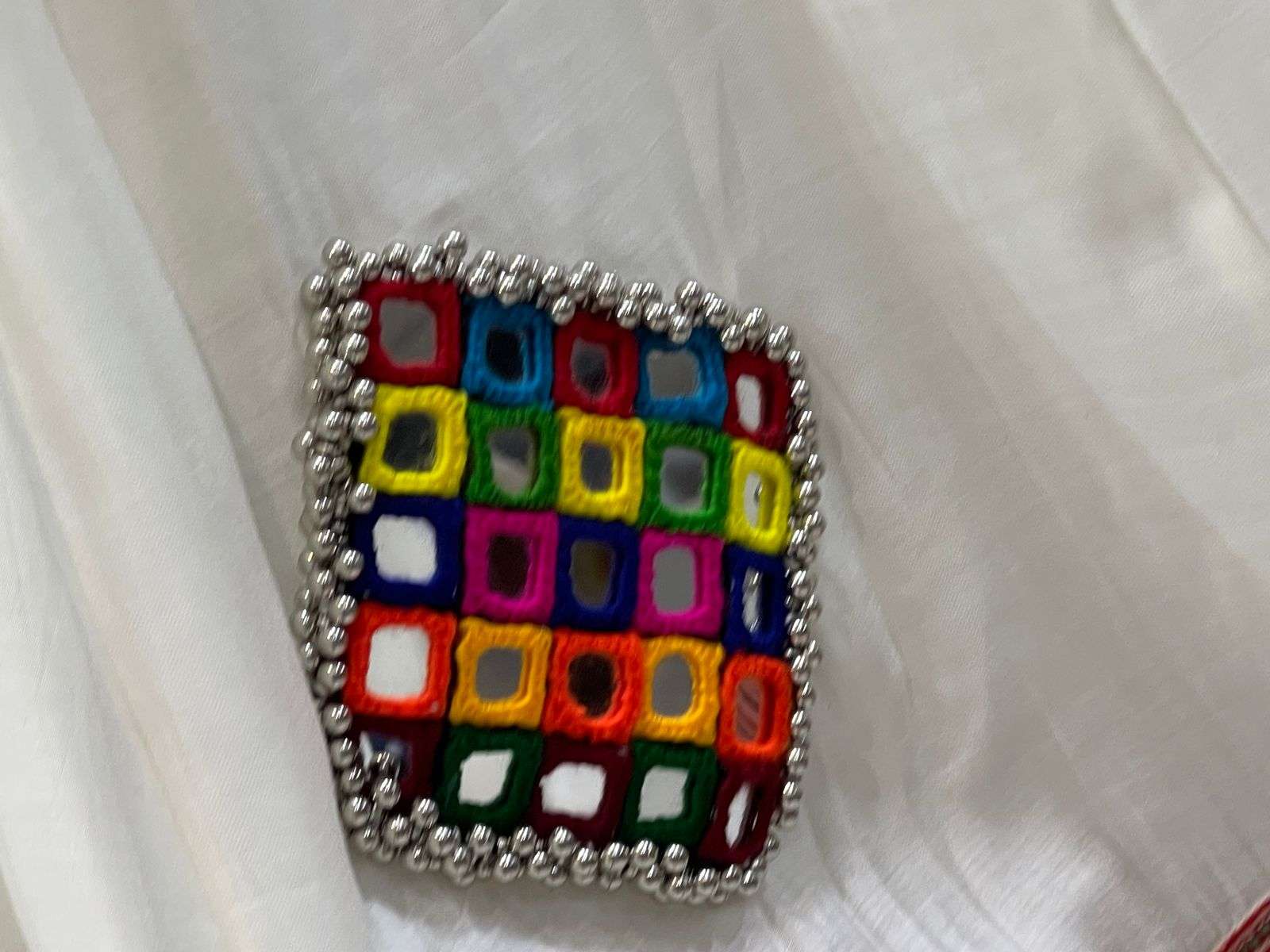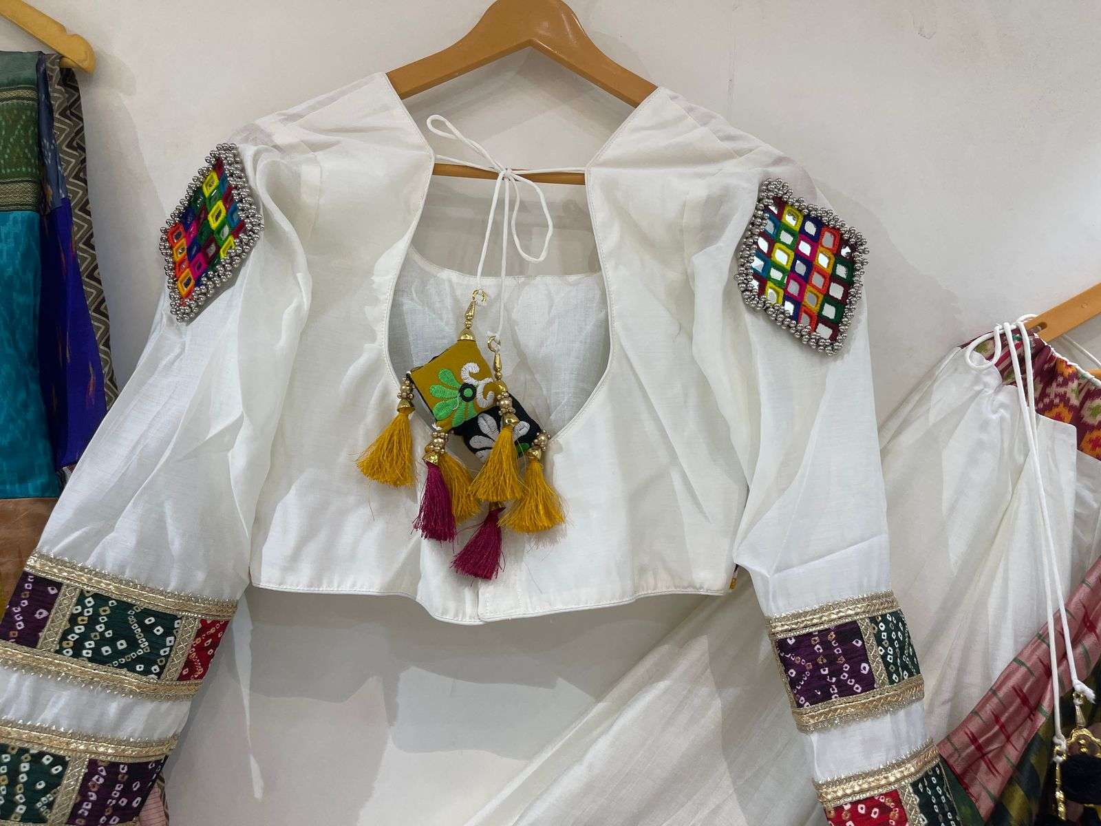 *Blouse*: *Designer Bombay silk multiple colourful mirror work embroidered Full long sleeves 👋 with Rabari moti Work hand 🤚 stitches butta patches Best quality long sleeves designer 🪡 work blouse with matching latkan 38” size plus margin 2” for Size L*