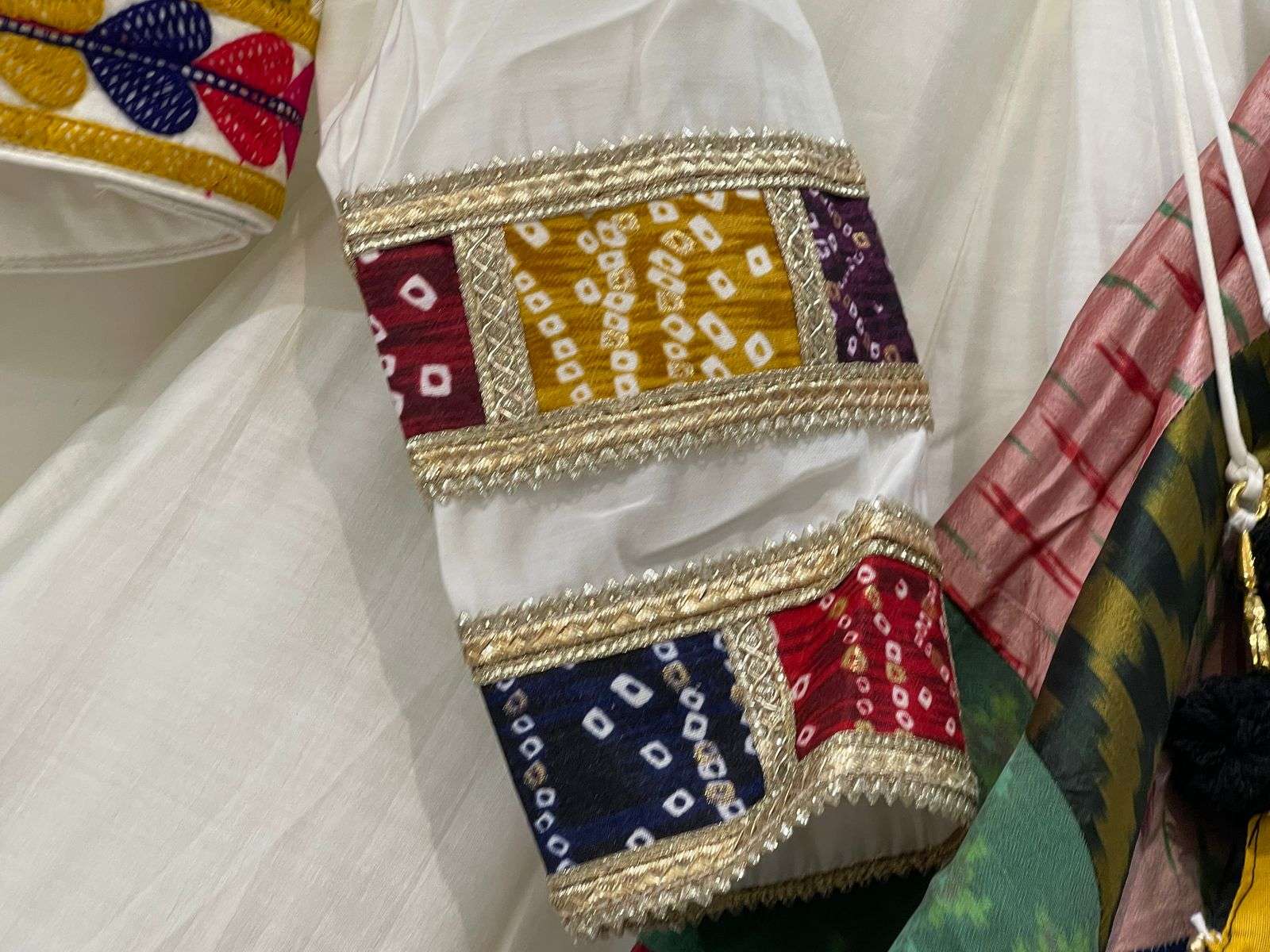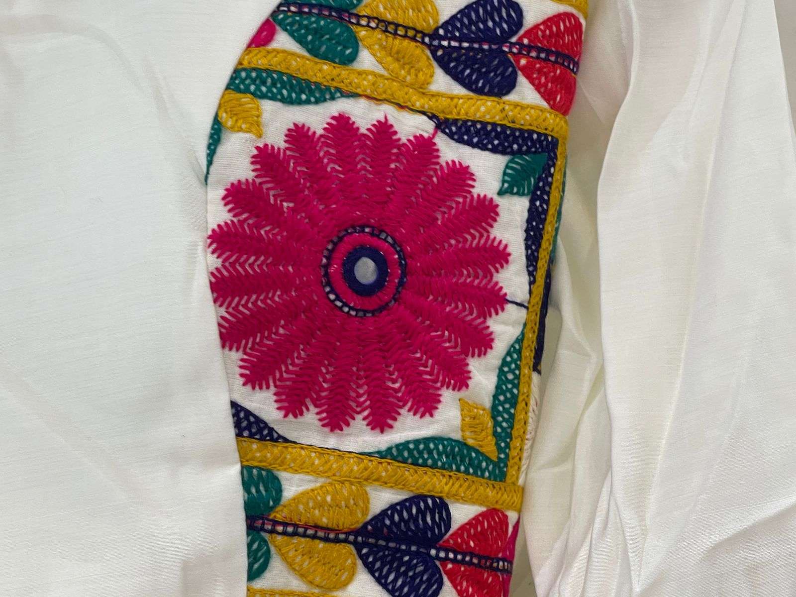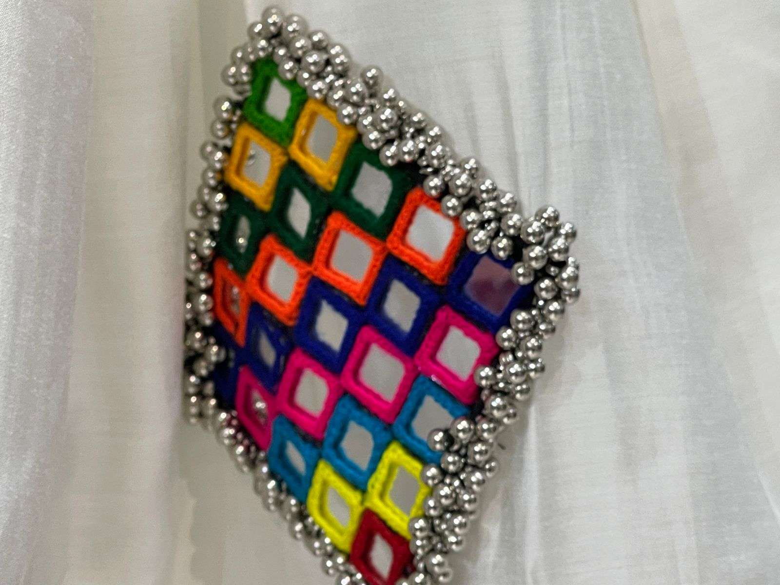 *Blouse*: *Designer Bombay silk multiple colourful mirror work embroidered Full long sleeves 👋 with Rabari moti Work hand 🤚 stitches butta patches Best quality long sleeves designer 🪡 work blouse with matching latkan 38” size plus margin 2” for Size L*