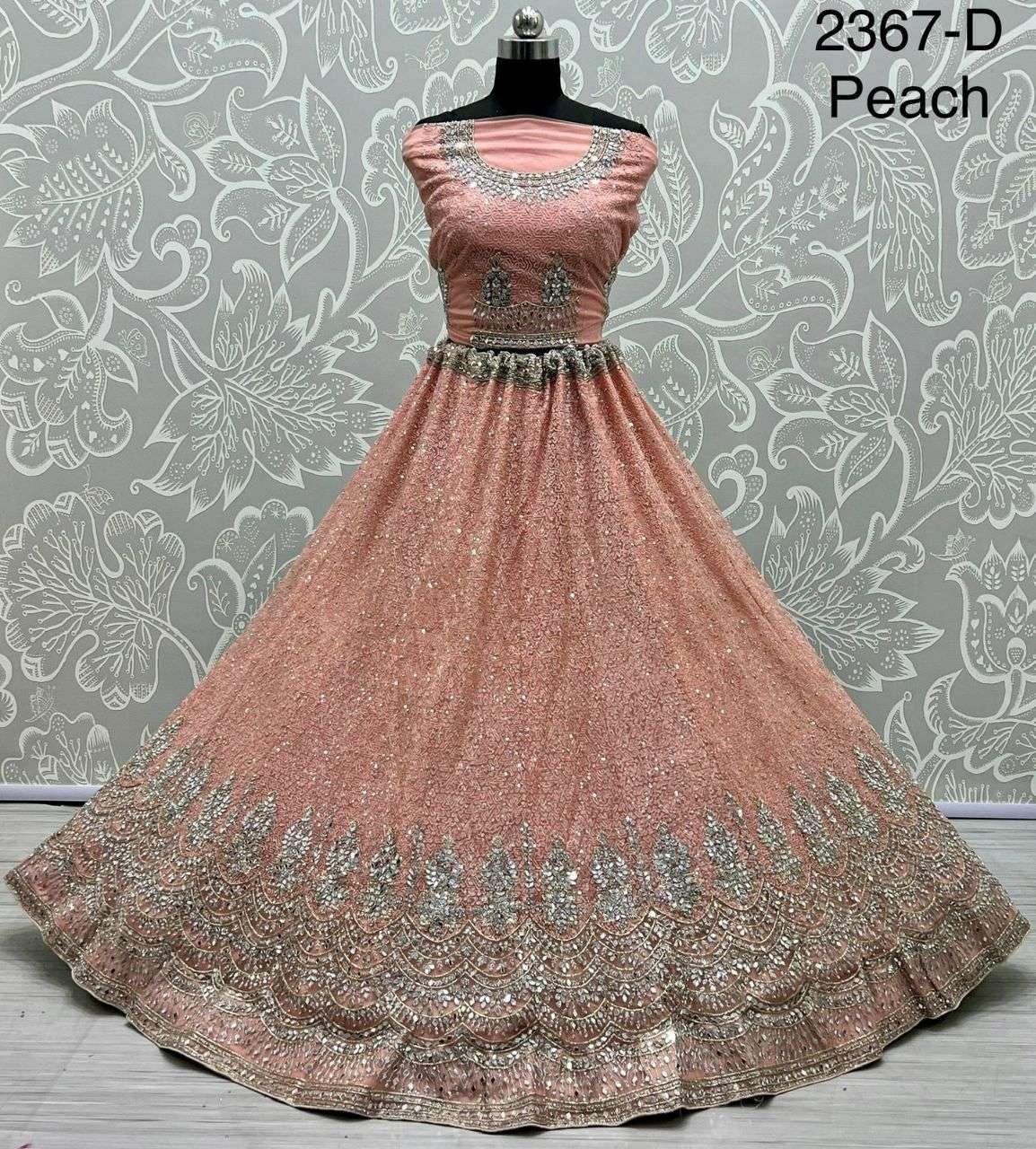 Code : 2367 Lehenga : Fabric - bridal net Work - hand mirror German zari work Fancy pattern thread work Zircon diamond work Stitching - standard cancan and canvas attached Size - free size up to 42