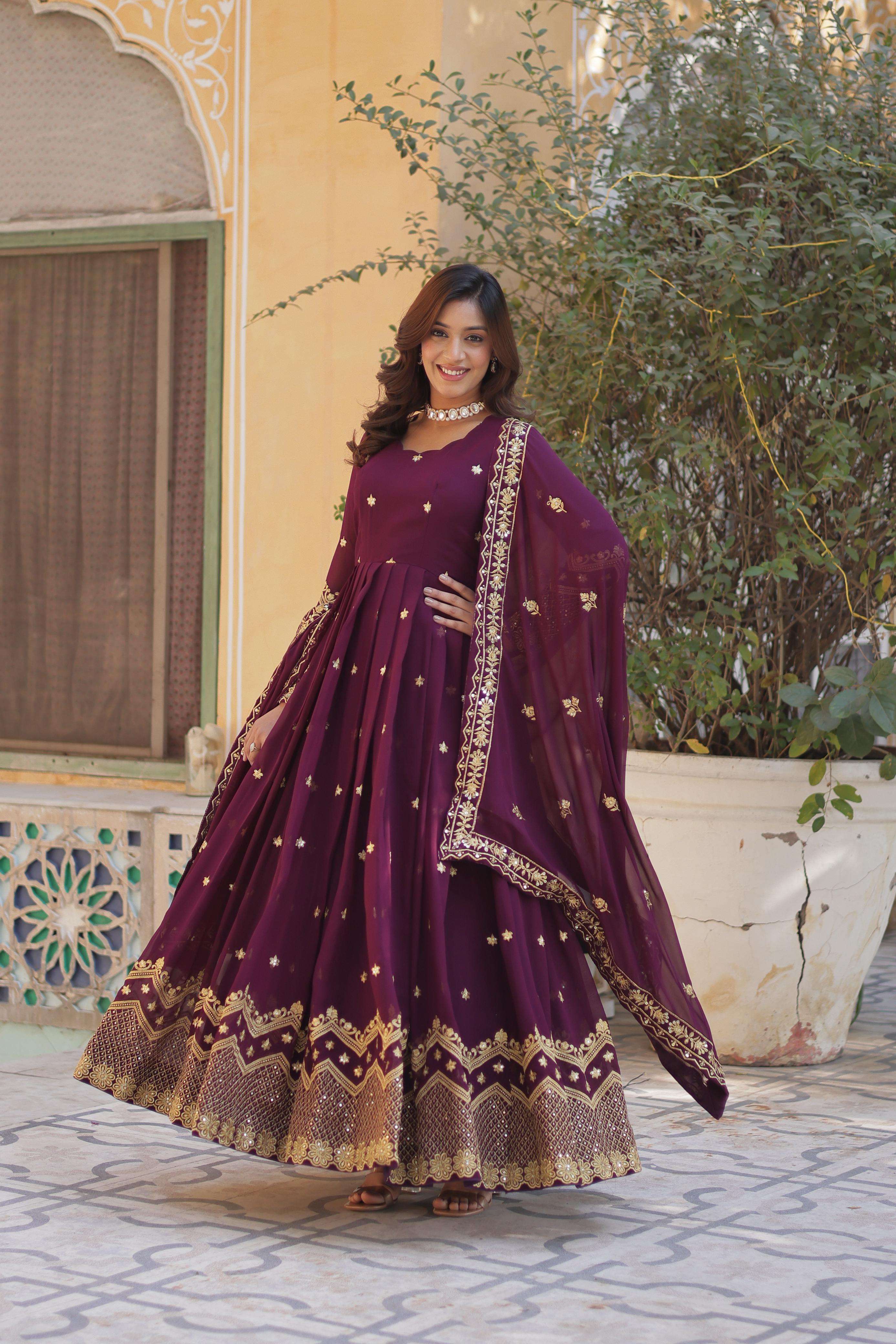 👉🏻 *GOWN* :- 👇 👉🏻 *FABRIC & WORK*:- Faux Blooming Georgette With Zari & Sequins Embroidery. 👉🏻*SIZE*:-M(38''),L(40''),XL(42''),XXL(44'') 👉🏻*LENGTH*:-56 INCH 👉🏻*FLAIR*:-3.5 MTR 👉🏻*LINING*:-Cotton (Full Inner Top To Bottom) 👉🏻*SLEEVE*:-Full Sleeves 👉🏻*NECK TYPE*:-Fancy Neck(Same as image)