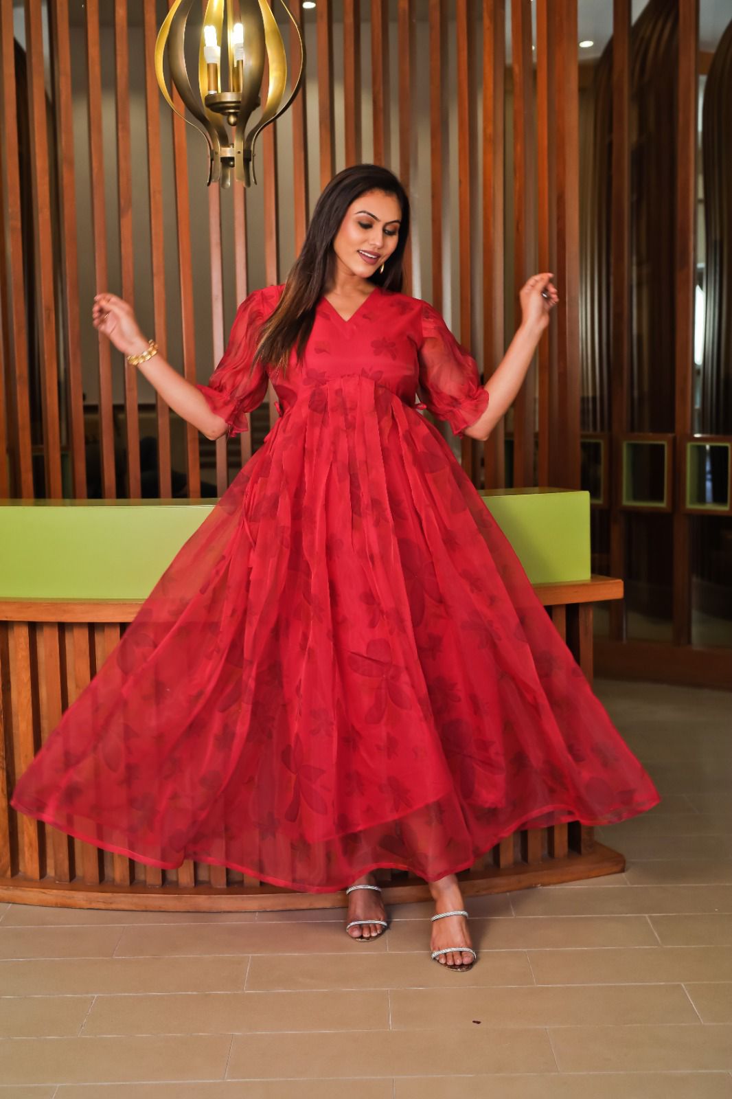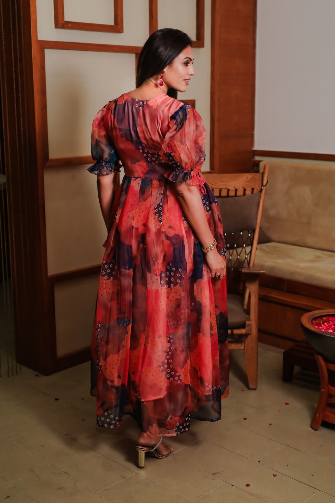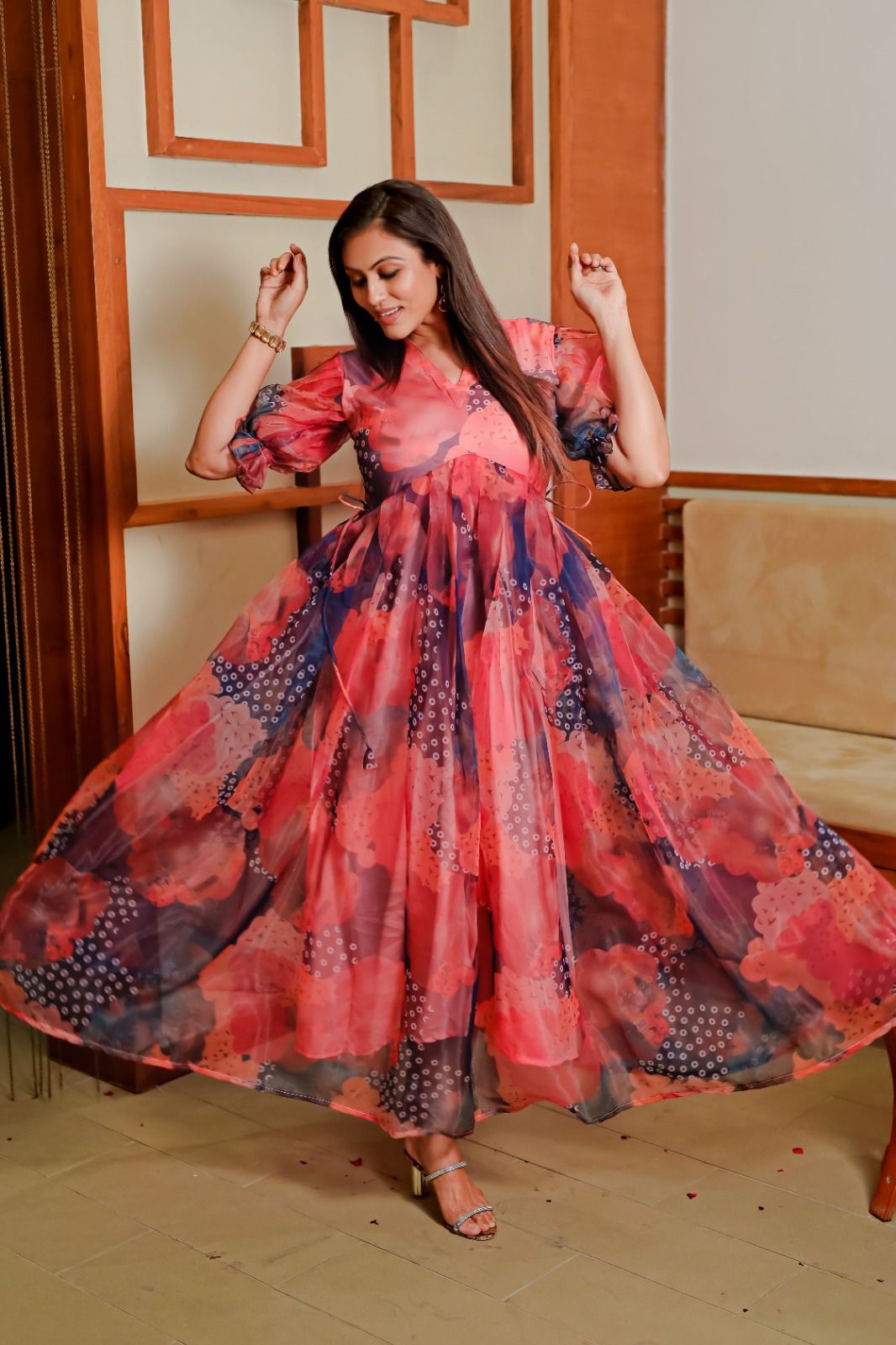 DESIGNS PRESENT PURE ORGANZA MAXI DRESS This hot flower printed pure organza party wear maxi dress combines peach color to give you a stunning look. Tailored in a fetching floral print, this dress comes in a tiered design and has a round back cut out detail. It features puff sleeve, V-neck, ruffle flair and it is full length maxi dress that is suitable for festival occasions. Pair it with matching footwear for a traditional look. Fabric: Pure Organza Length : 56(inch) | Pattern : Maxi Dress | Occasion : Festive, Party | Type : Flared | Sleeve Type : Puff Sleeves | PRICE : 625+SHIP Size : S,M,L,XL,XXL SINGLE AVAILABL 100+single |