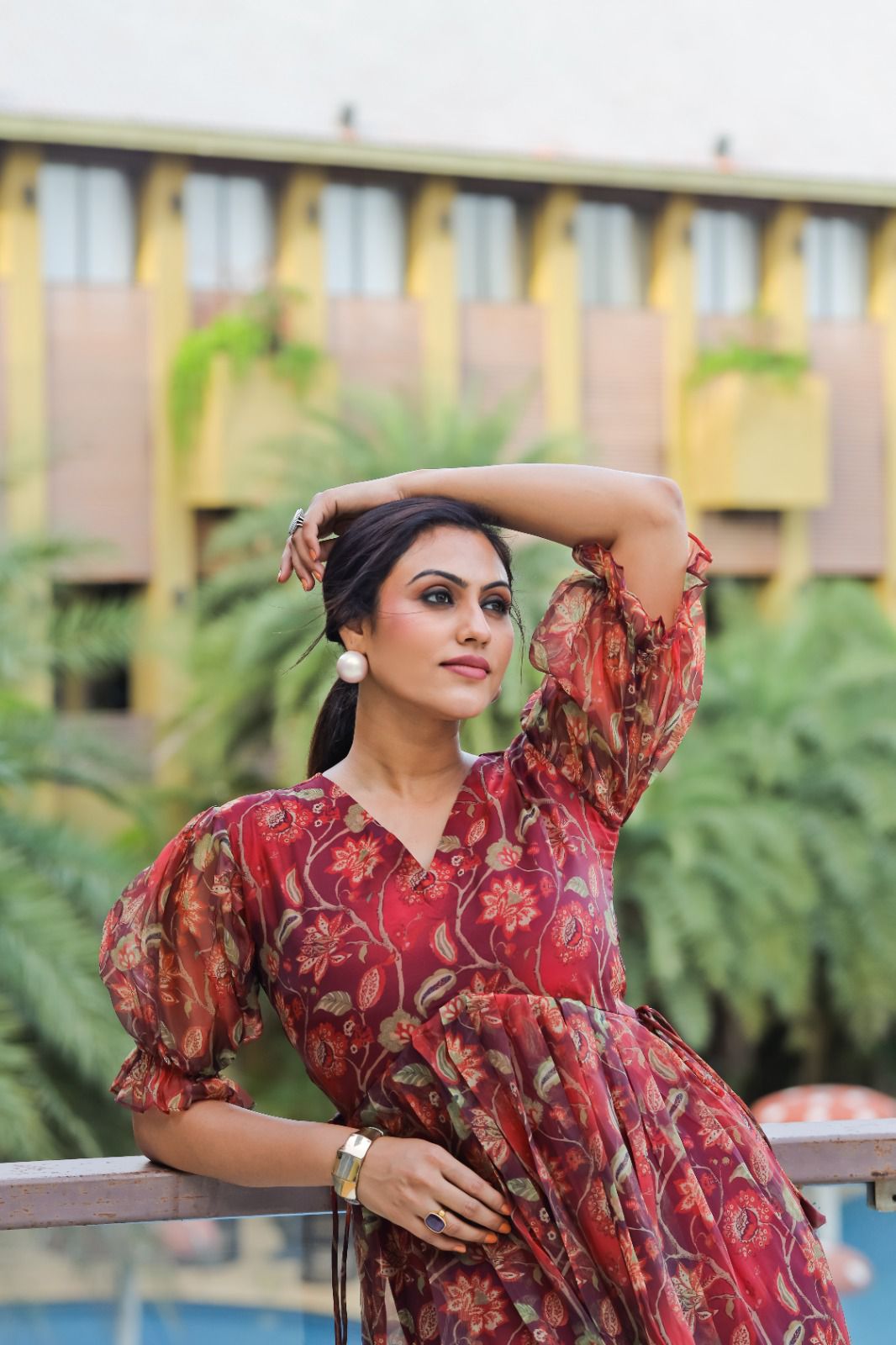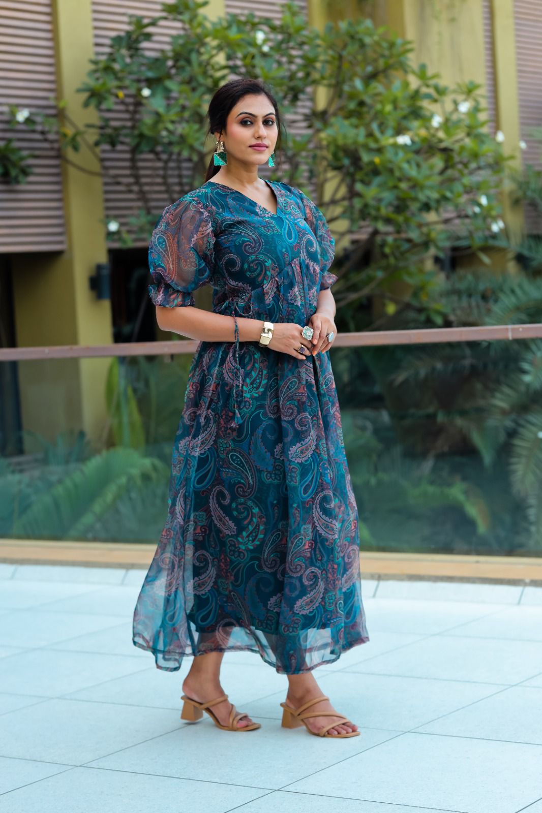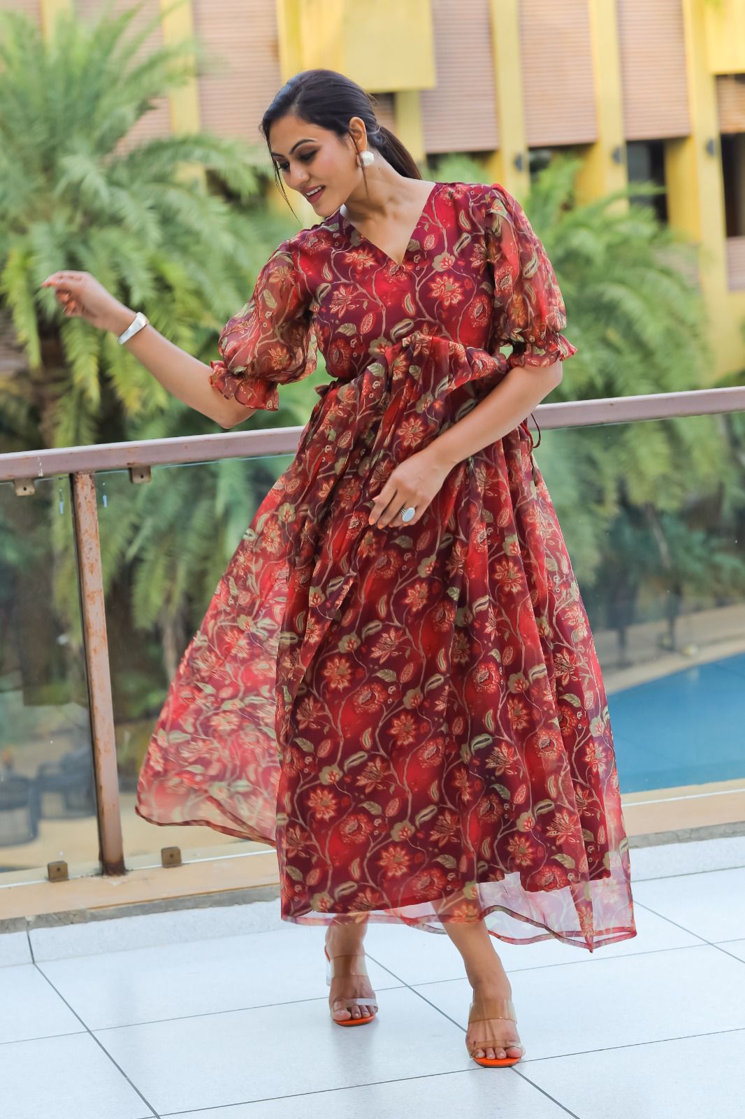 DESIGNS PRESENT PURE ORGANZA MAXI DRESS This hot flower printed pure organza party wear maxi dress combines peach color to give you a stunning look. Tailored in a fetching floral print, this dress comes in a tiered design and has a round back cut out detail. It features puff sleeve, V-neck, ruffle flair and it is full length maxi dress that is suitable for festival occasions. Pair it with matching footwear for a traditional look. Fabric: Pure Organza Length : 56(inch) | Pattern : Maxi Dress | Occasion : Festive, Party | Type : Flared | Sleeve Type : Puff Sleeves | PRICE : 625+SHIP Size : S,M,L,XL,XXL SINGLE AVAILABL 100+single |