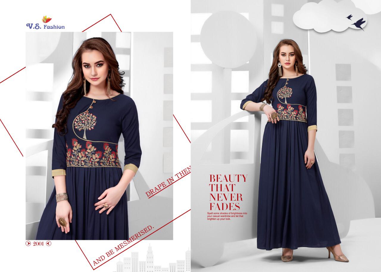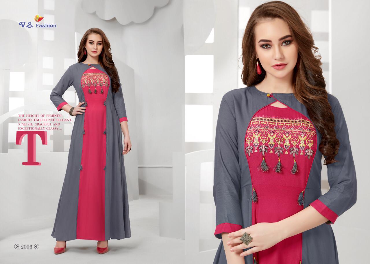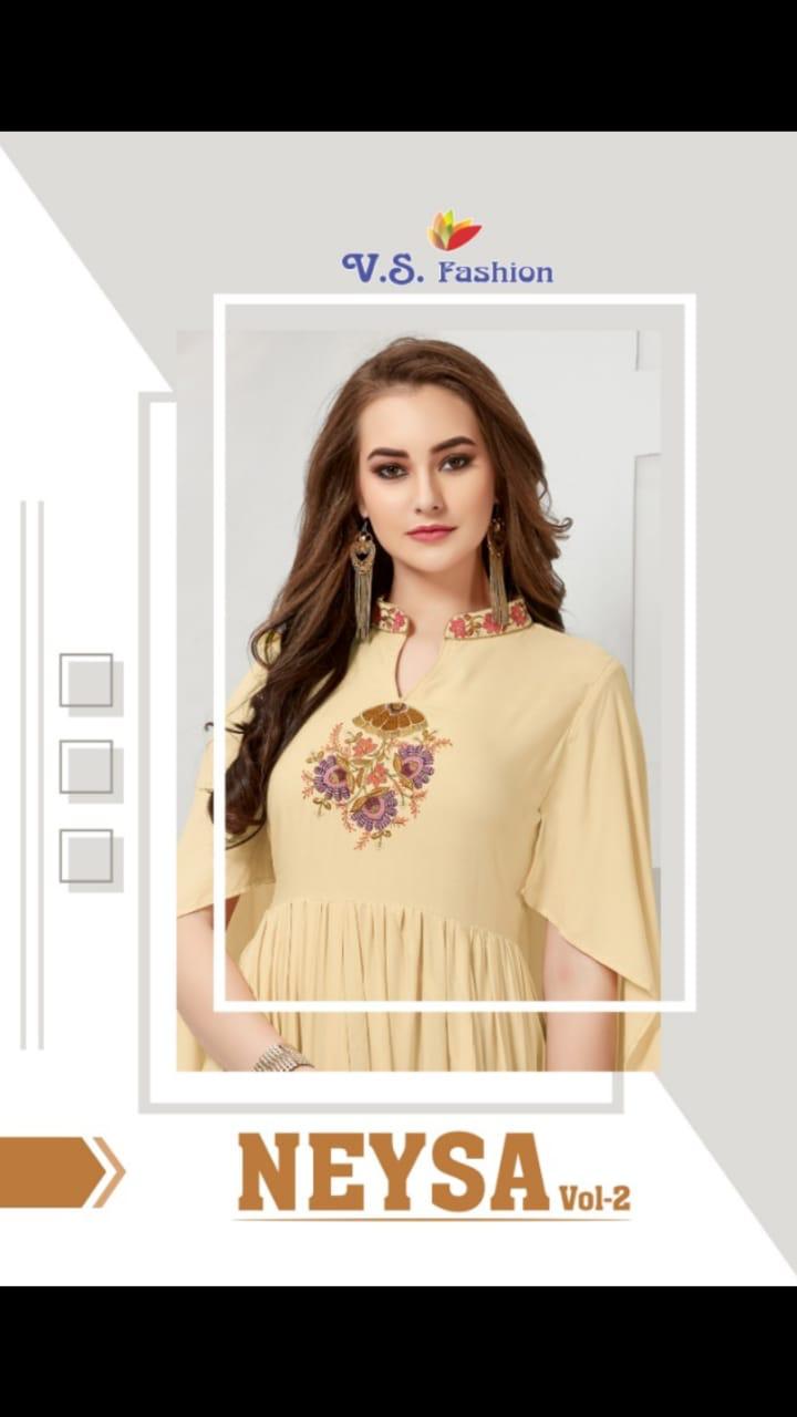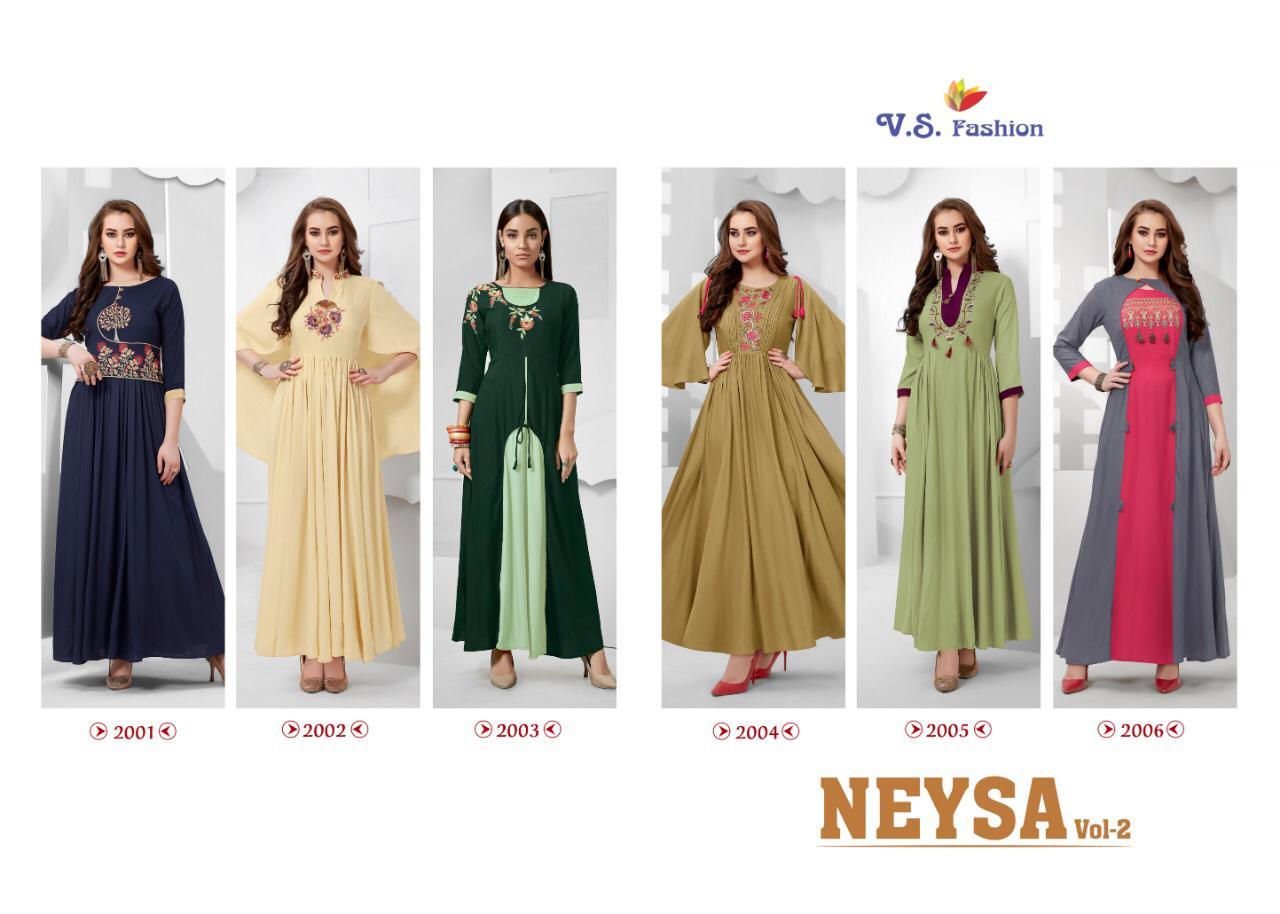 Buy Online Neysa Vol 3 By Vs Fashion 2001 Series Fancy Reyon Gown Style Kurti Catlog Wholesale Dealer Surat 6 Pcs of Full Catalogue at Wholesale Price. Looking for Neysa Vol 3 By Vs Fashion 2001 Series Fancy Reyon Gown Style Kurti Catlog Wholesale Dealer Surat Full Catalouge at Best Price? Buy Now Neysa Vol 3 By Vs Fashion 2001 Series Fancy Reyon Gown Style Kurti Catlog Wholesale Dealer Surat at Wholesale Rate of Rs 4776 with Total 6 Pcs from authroized dealer and supplier of VS Brand. Cost of Each piece is just only Rs 796 which is very low and affordable price to resale the product in your retail store ,This is Surat based Wholesale Supplier & Dealer of VS Brand. Click on Brand name to Know more about VS Brand's products.Call or Whatsapp on 9898838984 for booking or enquiry