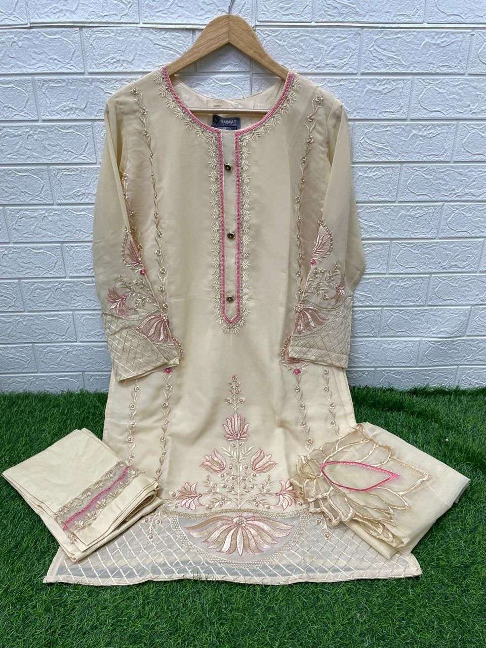 (NFS-1120) ➖➖➖➖➖➖➖ ✨ by *Naimat Fashoin Studio*✨ ➖➖➖➖➖➖➖➖ ❤️ *Description*❤️ 〰〰〰〰〰〰〰 *Designer Tunic Embellished with beautiful embroidery work with pearls in Top and Slive & paired with Classic strachable Straight pants with Embroidery Petch & with embroidery Petch work Orgenza Dupatta*