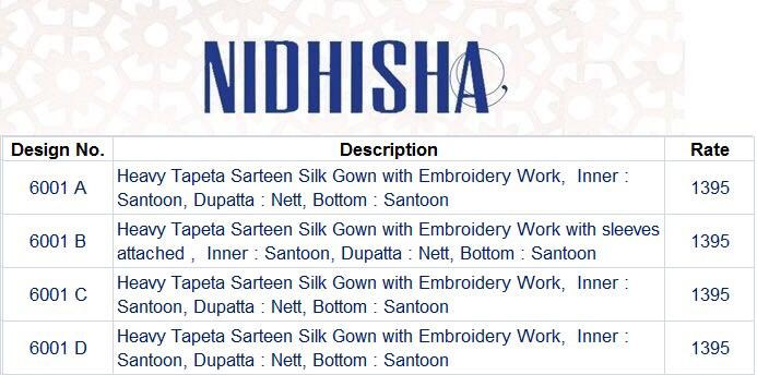 Buy Online Nidisha 6001 Colours Designer Gowns Wholesale Supplier Gujarat 4 Pcs of Full Catalogue at Wholesale Price. Looking for Nidisha 6001 Colours Designer Gowns Wholesale Supplier Gujarat Full Catalouge at Best Price? Buy Now Nidisha 6001 Colours Designer Gowns Wholesale Supplier Gujarat at Wholesale Rate of Rs 5580 with Total 4 Pcs from authroized dealer and supplier of BRAND'S Brand. Cost of Each piece is just only Rs 1395 which is very low and affordable price to resale the product in your retail store ,This is Surat based Wholesale Supplier & Dealer of BRAND'S Brand. Click on Brand name to Know more about BRAND'S Brand's products.Call or Whatsapp on 9898838984 for booking or enquiry