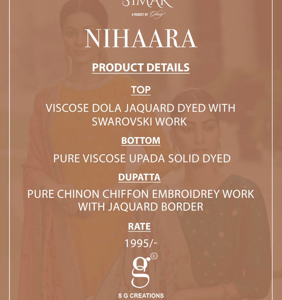 Buy Online Nihaara By Simar By Glossy Wholesaler Supplier From Surat 8 Pcs of Full Catalogue at Wholesale Price. Looking for Nihaara By Simar By Glossy Wholesaler Supplier From Surat Full Catalouge at Best Price? Buy Now Nihaara By Simar By Glossy Wholesaler Supplier From Surat at Wholesale Rate of Rs 15960 with Total 8 Pcs from authroized dealer and supplier of GLOSSY Brand. Cost of Each piece is just only Rs 1995 which is very low and affordable price to resale the product in your retail store ,This is Surat based Wholesale Supplier & Dealer of GLOSSY Brand. Click on Brand name to Know more about GLOSSY Brand's products.Call or Whatsapp on 9898838984 for booking or enquiry