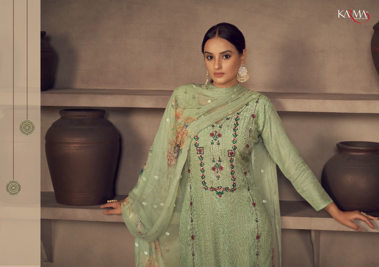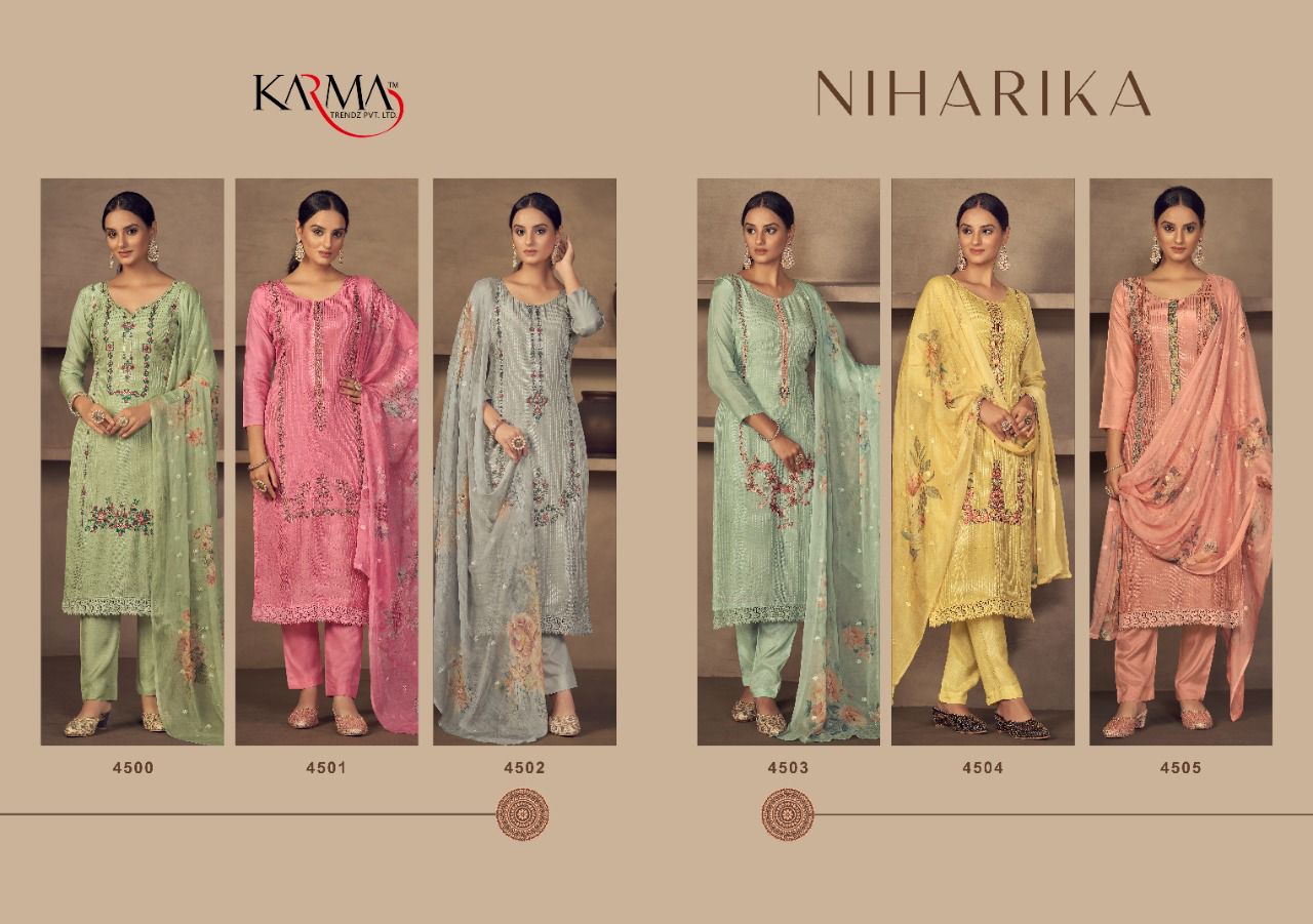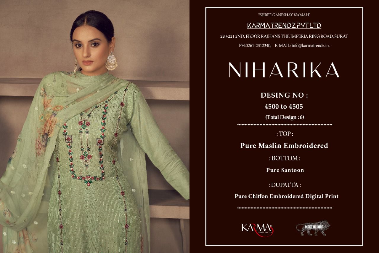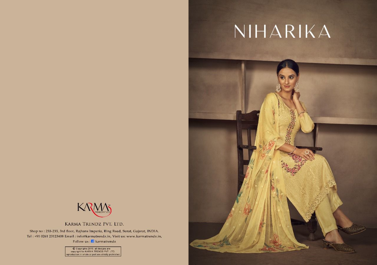 Buy Online Niharika By Karma Trendz Pure Suit Wholesale Supplier Traders In Surat 6 Pcs of Full Catalogue at Wholesale Price. Looking for Niharika By Karma Trendz Pure Suit Wholesale Supplier Traders In Surat Full Catalouge at Best Price? Buy Now Niharika By Karma Trendz Pure Suit Wholesale Supplier Traders In Surat at Wholesale Rate of Rs 8670 with Total 6 Pcs from authroized dealer and supplier of KARMA Brand. Cost of Each piece is just only Rs 1445 which is very low and affordable price to resale the product in your retail store ,This is Surat based Wholesale Supplier & Dealer of KARMA Brand. Click on Brand name to Know more about KARMA Brand's products.Call or Whatsapp on 9898838984 for booking or enquiry