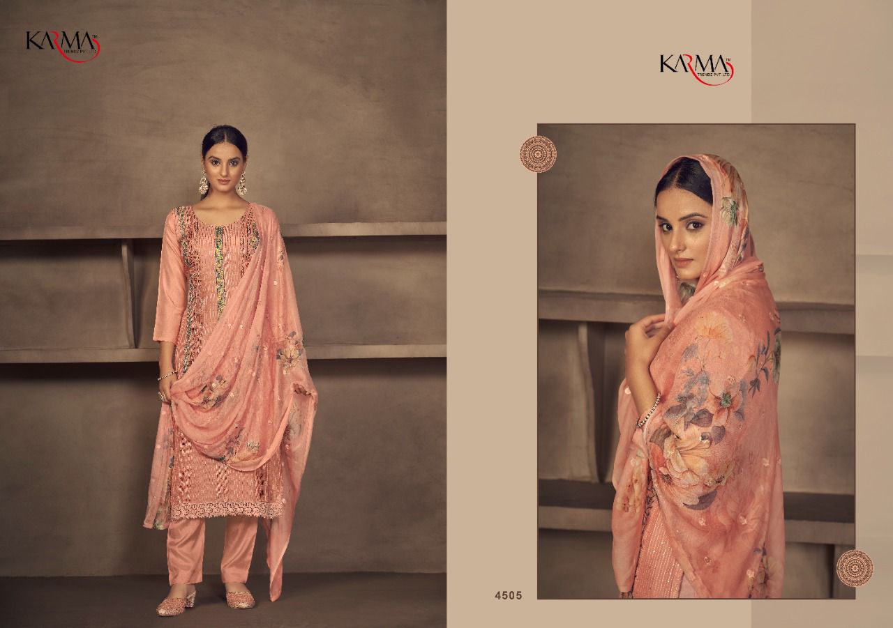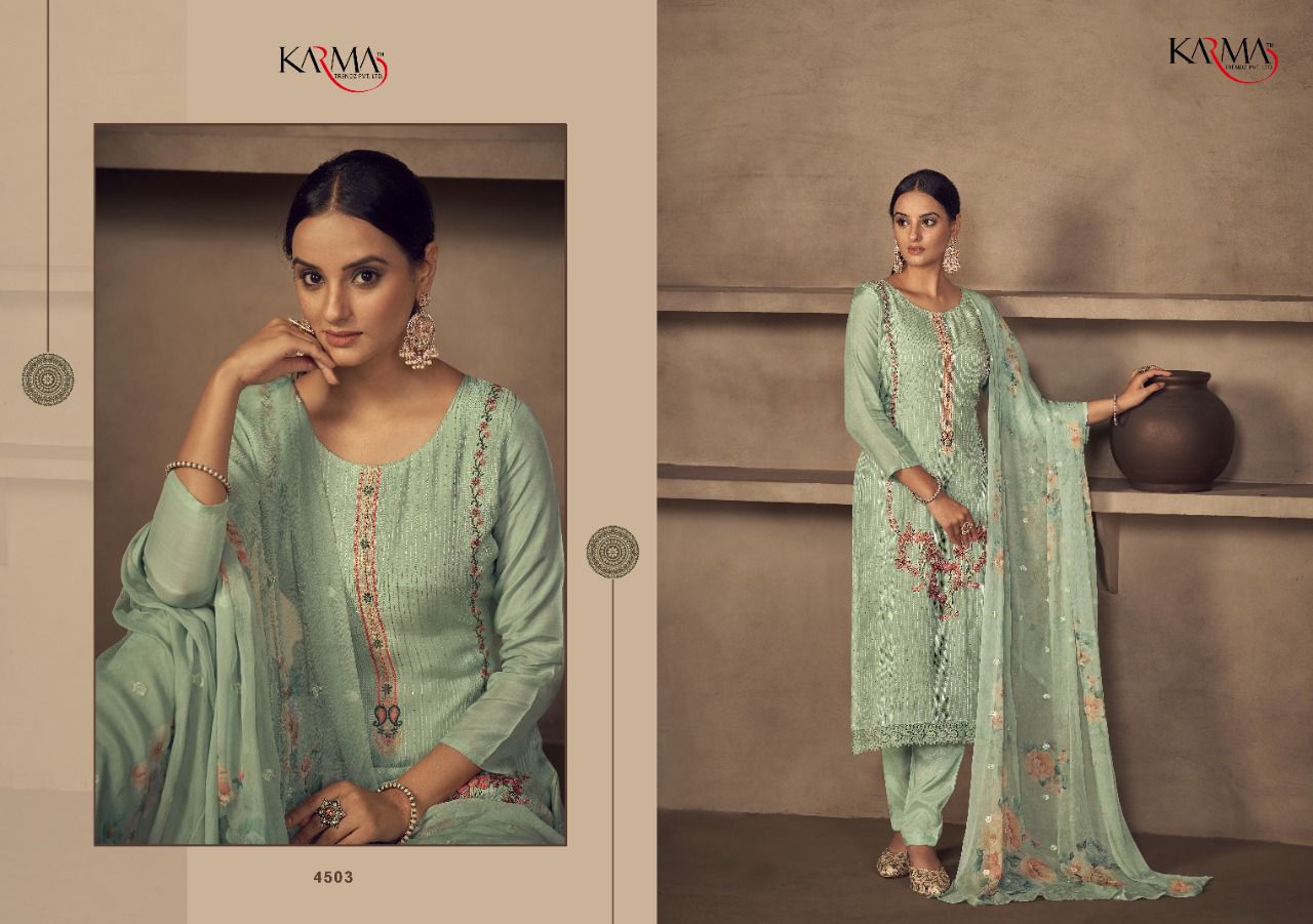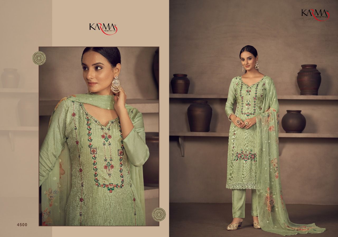 Buy Online Niharika By Karma Trendz Pure Suit Wholesale Supplier Traders In Surat 6 Pcs of Full Catalogue at Wholesale Price. Looking for Niharika By Karma Trendz Pure Suit Wholesale Supplier Traders In Surat Full Catalouge at Best Price? Buy Now Niharika By Karma Trendz Pure Suit Wholesale Supplier Traders In Surat at Wholesale Rate of Rs 8670 with Total 6 Pcs from authroized dealer and supplier of KARMA Brand. Cost of Each piece is just only Rs 1445 which is very low and affordable price to resale the product in your retail store ,This is Surat based Wholesale Supplier & Dealer of KARMA Brand. Click on Brand name to Know more about KARMA Brand's products.Call or Whatsapp on 9898838984 for booking or enquiry