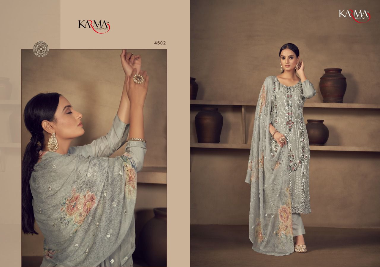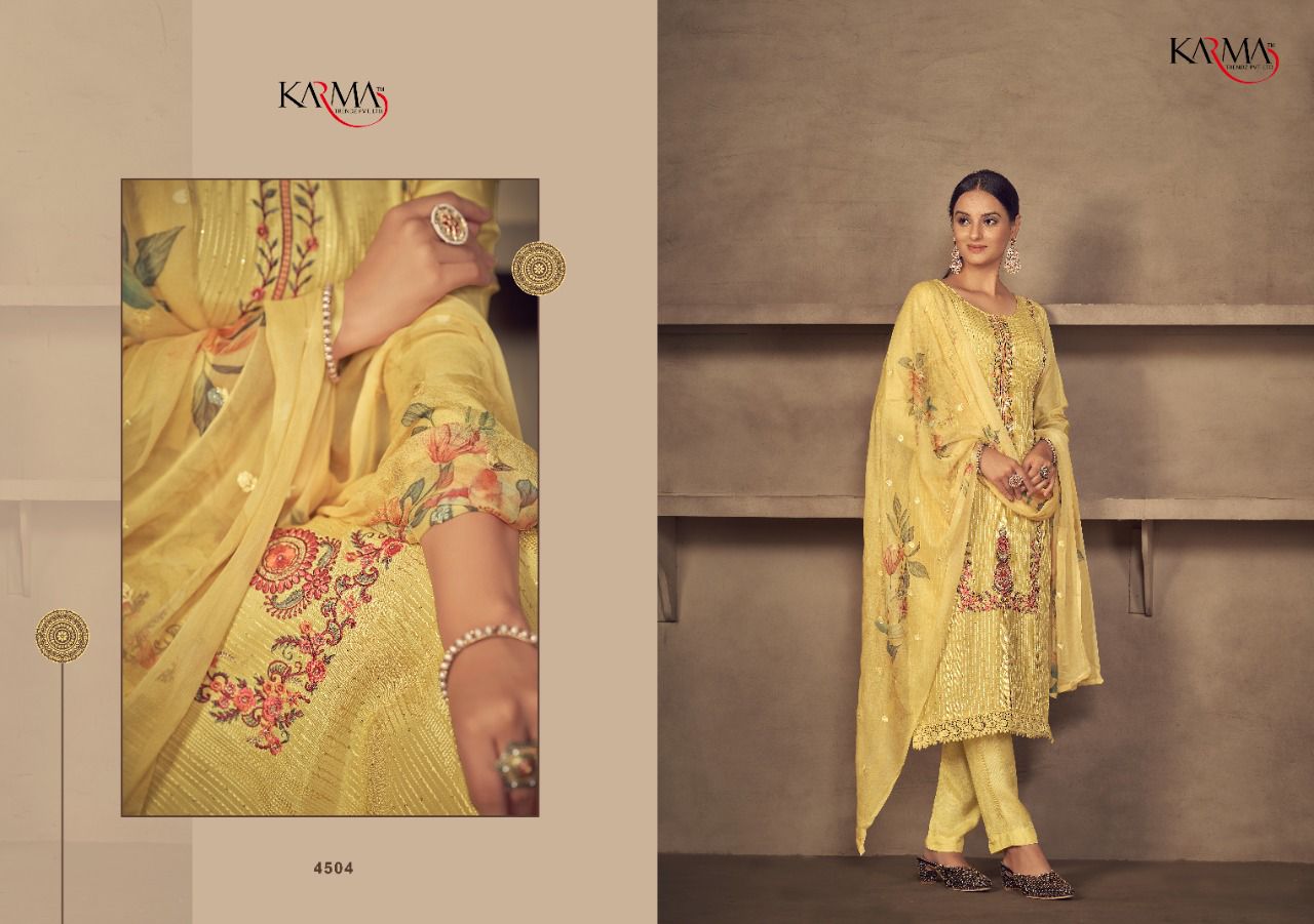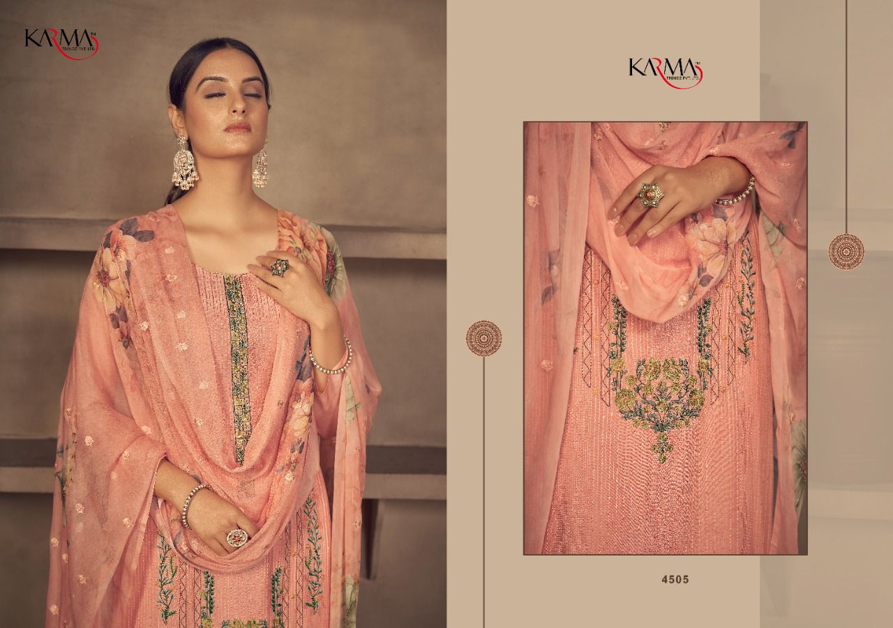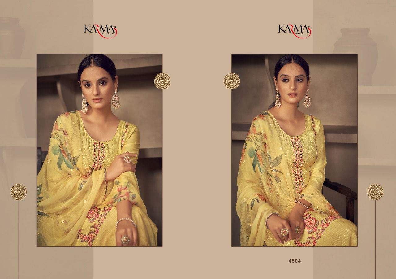 Buy Online Niharika By Karma Trendz Pure Suit Wholesale Supplier Traders In Surat 6 Pcs of Full Catalogue at Wholesale Price. Looking for Niharika By Karma Trendz Pure Suit Wholesale Supplier Traders In Surat Full Catalouge at Best Price? Buy Now Niharika By Karma Trendz Pure Suit Wholesale Supplier Traders In Surat at Wholesale Rate of Rs 8670 with Total 6 Pcs from authroized dealer and supplier of KARMA Brand. Cost of Each piece is just only Rs 1445 which is very low and affordable price to resale the product in your retail store ,This is Surat based Wholesale Supplier & Dealer of KARMA Brand. Click on Brand name to Know more about KARMA Brand's products.Call or Whatsapp on 9898838984 for booking or enquiry
