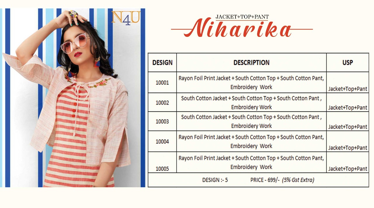*TUNIC HOUSE* Presents New Catalogs *NIHARIKA* JACKET+TOP+PANT *TOP* :- SOUTH COTTON & EMBROIDERY *JACKET* :- RAYON FOIL PRINT & SOUTH COTTON *PANT* :- SOUTH COTTON *SIZE* :- *M - L - XL - XXL* PRICE :- *699/-* 5% Gst Extra Set to set DESIGN :- 5 Set To Set Dispatch : Today delivery Book your Order? |