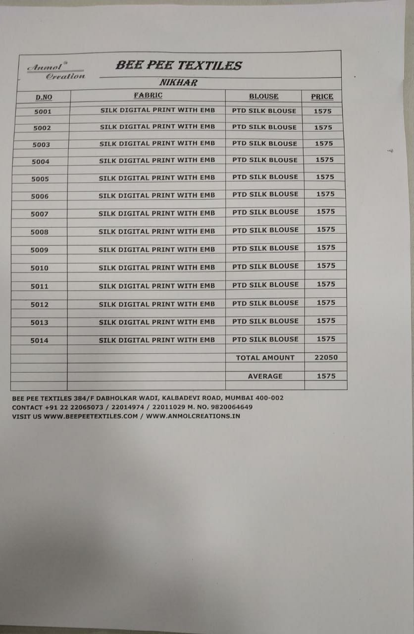 Buy Online Nikhar By Anmol Creation Sarees Single And Set Stockiest And Supplier From Surat 14 Pcs of Full Catalogue at Wholesale Price. Looking for Nikhar By Anmol Creation Sarees Single And Set Stockiest And Supplier From Surat Full Catalouge at Best Price? Buy Now Nikhar By Anmol Creation Sarees Single And Set Stockiest And Supplier From Surat at Wholesale Rate of Rs 22050 with Total 14 Pcs from authroized dealer and supplier of Brand. Cost of Each piece is just only Rs 1575 which is very low and affordable price to resale the product in your retail store ,This is Surat based Wholesale Supplier & Dealer of Brand. Click on Brand name to Know more about Brand's products.Call or Whatsapp on 9898838984 for booking or enquiry