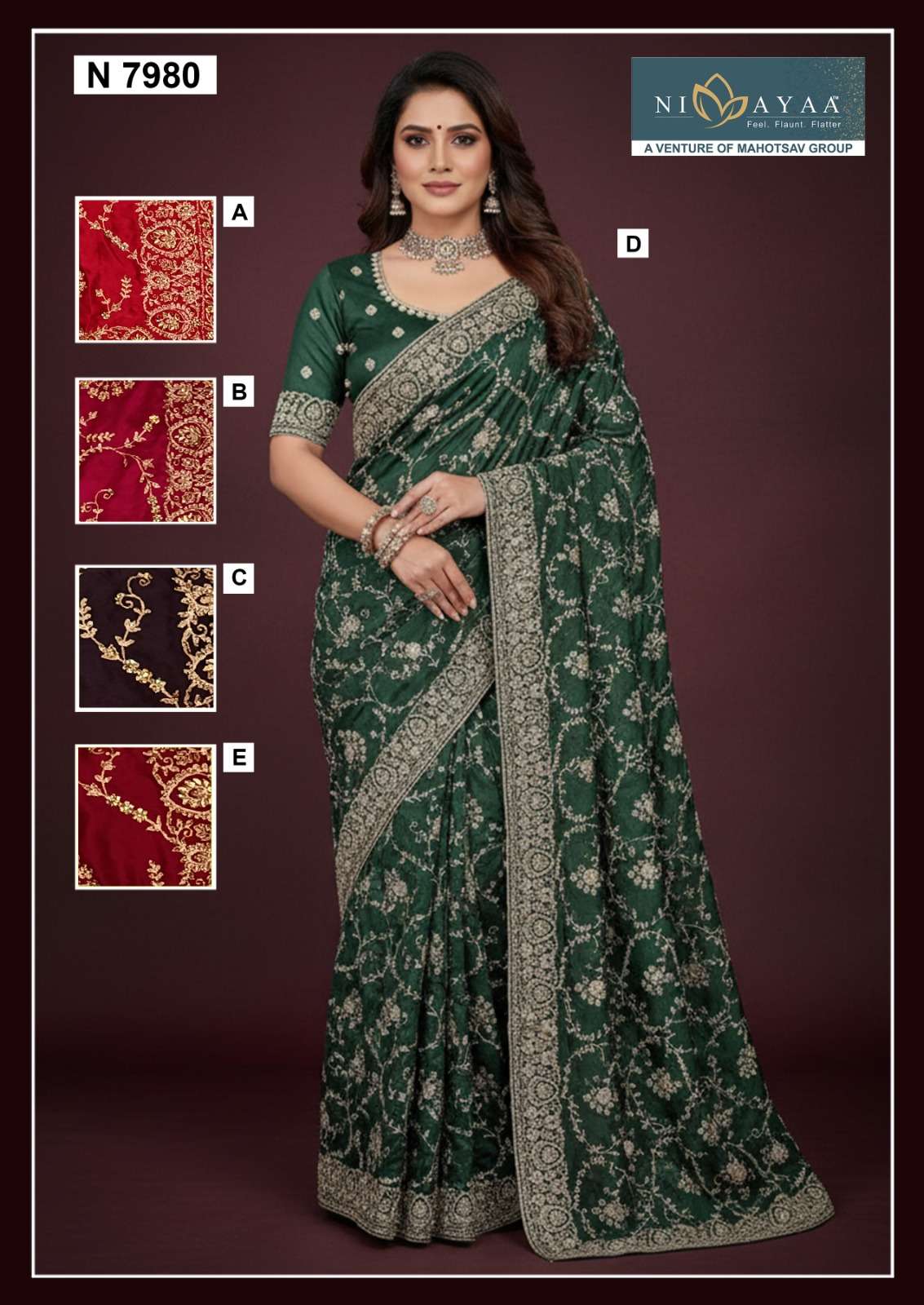 Buy Online NIMAYA NAIRA VOL 01 By MAHOTSAV saree collection manufacturer Surat 21 Pcs of Full Catalogue at Wholesale Price. Looking for NIMAYA NAIRA VOL 01 By MAHOTSAV saree collection manufacturer Surat Full Catalouge at Best Price? Buy Now NIMAYA NAIRA VOL 01 By MAHOTSAV saree collection manufacturer Surat at Wholesale Rate of Rs 0 with Total 21 Pcs from authroized dealer and supplier of Mahotsav Saree Brand. Cost of Each piece is just only Rs 0 which is very low and affordable price to resale the product in your retail store ,This is Surat based Wholesale Supplier & Dealer of Mahotsav Saree Brand. Click on Brand name to Know more about Mahotsav Saree Brand's products.Call or Whatsapp on 9898838984 for booking or enquiry