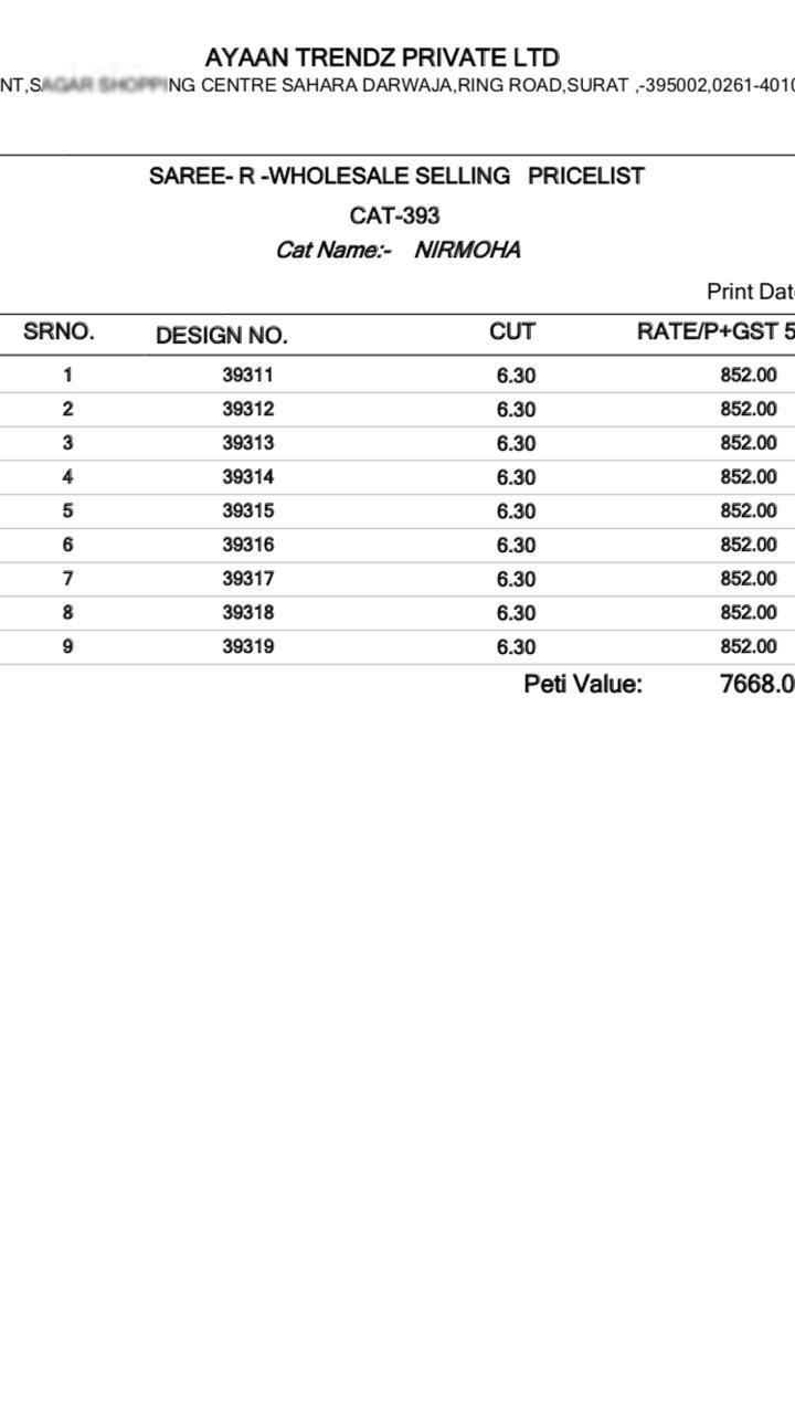 Buy Online Nirmoha Cat 393 By Vipul Series 39311 To 39319 Designer Party Wear Sarees Wholesale Supplier And Dealer Surat 9 Pcs of Full Catalogue at Wholesale Price. Looking for Nirmoha Cat 393 By Vipul Series 39311 To 39319 Designer Party Wear Sarees Wholesale Supplier And Dealer Surat Full Catalouge at Best Price? Buy Now Nirmoha Cat 393 By Vipul Series 39311 To 39319 Designer Party Wear Sarees Wholesale Supplier And Dealer Surat at Wholesale Rate of Rs 7668 with Total 9 Pcs from authroized dealer and supplier of VIPUL Brand. Cost of Each piece is just only Rs 852 which is very low and affordable price to resale the product in your retail store ,This is Surat based Wholesale Supplier & Dealer of VIPUL Brand. Click on Brand name to Know more about VIPUL Brand's products.Call or Whatsapp on 9898838984 for booking or enquiry