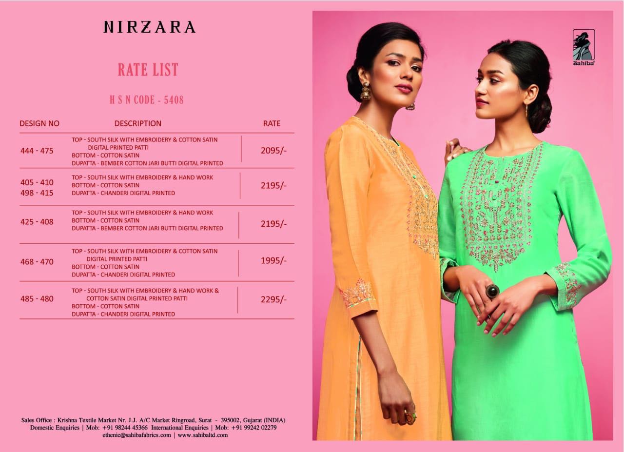 Buy Online Nirzara By Sahiba Silk Embroidered Party Wear Designer Suits Wholesale Supplier And Dealer India 12 Pcs of Full Catalogue at Wholesale Price. Looking for Nirzara By Sahiba Silk Embroidered Party Wear Designer Suits Wholesale Supplier And Dealer India Full Catalouge at Best Price? Buy Now Nirzara By Sahiba Silk Embroidered Party Wear Designer Suits Wholesale Supplier And Dealer India at Wholesale Rate of Rs 25944 with Total 12 Pcs from authroized dealer and supplier of SAHIBA Brand. Cost of Each piece is just only Rs 2162 which is very low and affordable price to resale the product in your retail store ,This is Surat based Wholesale Supplier & Dealer of SAHIBA Brand. Click on Brand name to Know more about SAHIBA Brand's products.Call or Whatsapp on 9898838984 for booking or enquiry