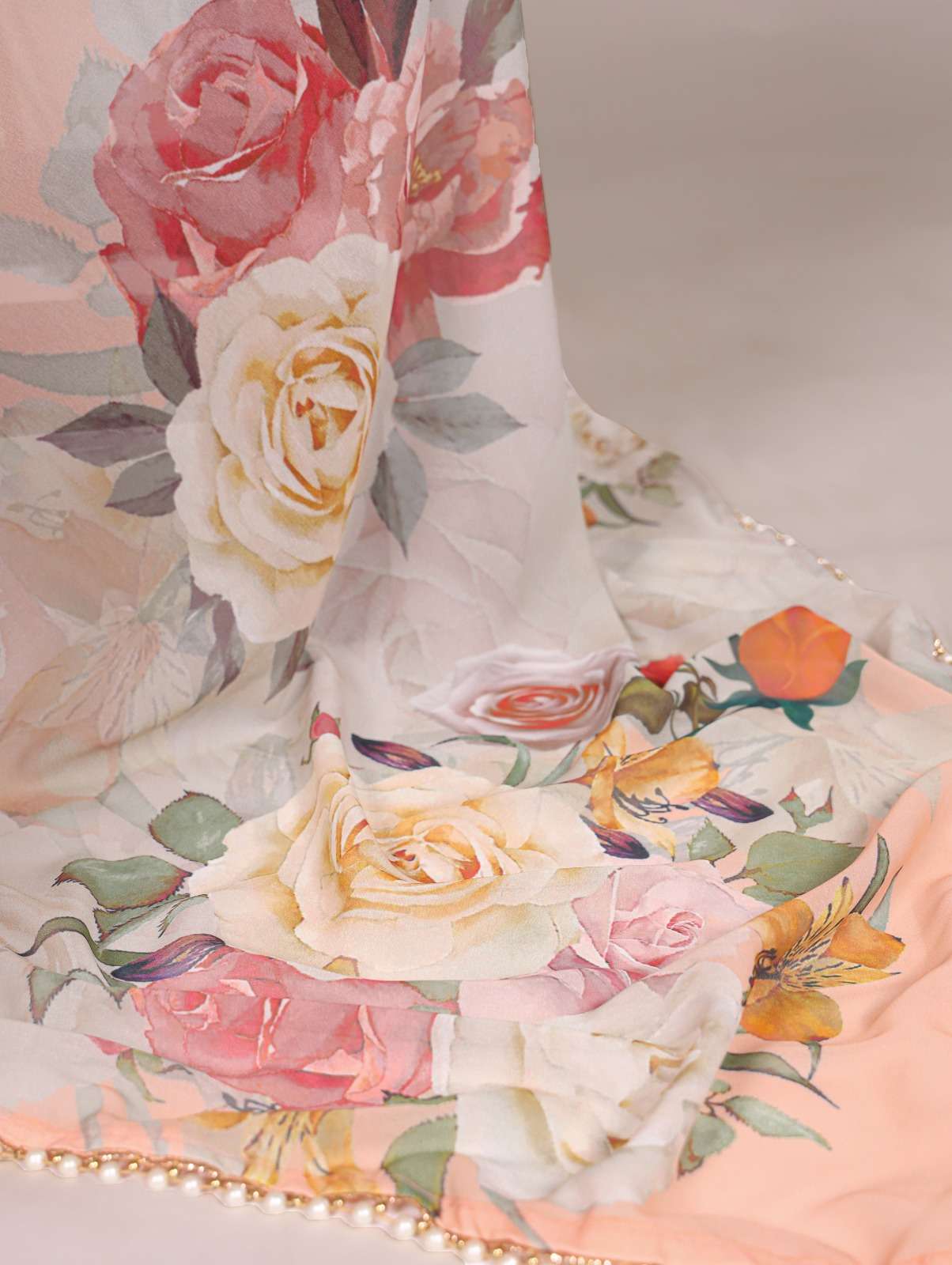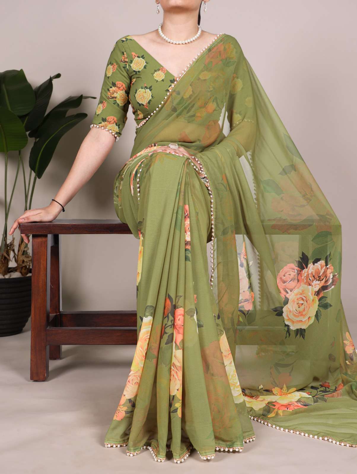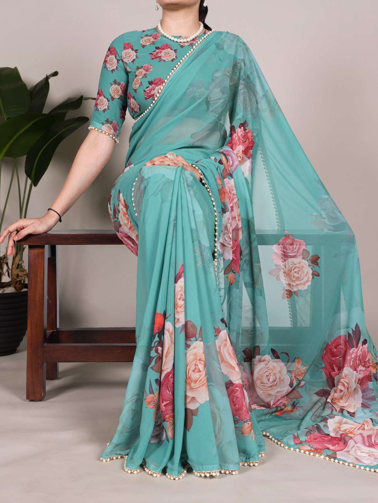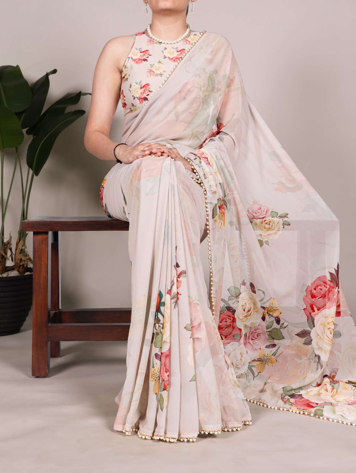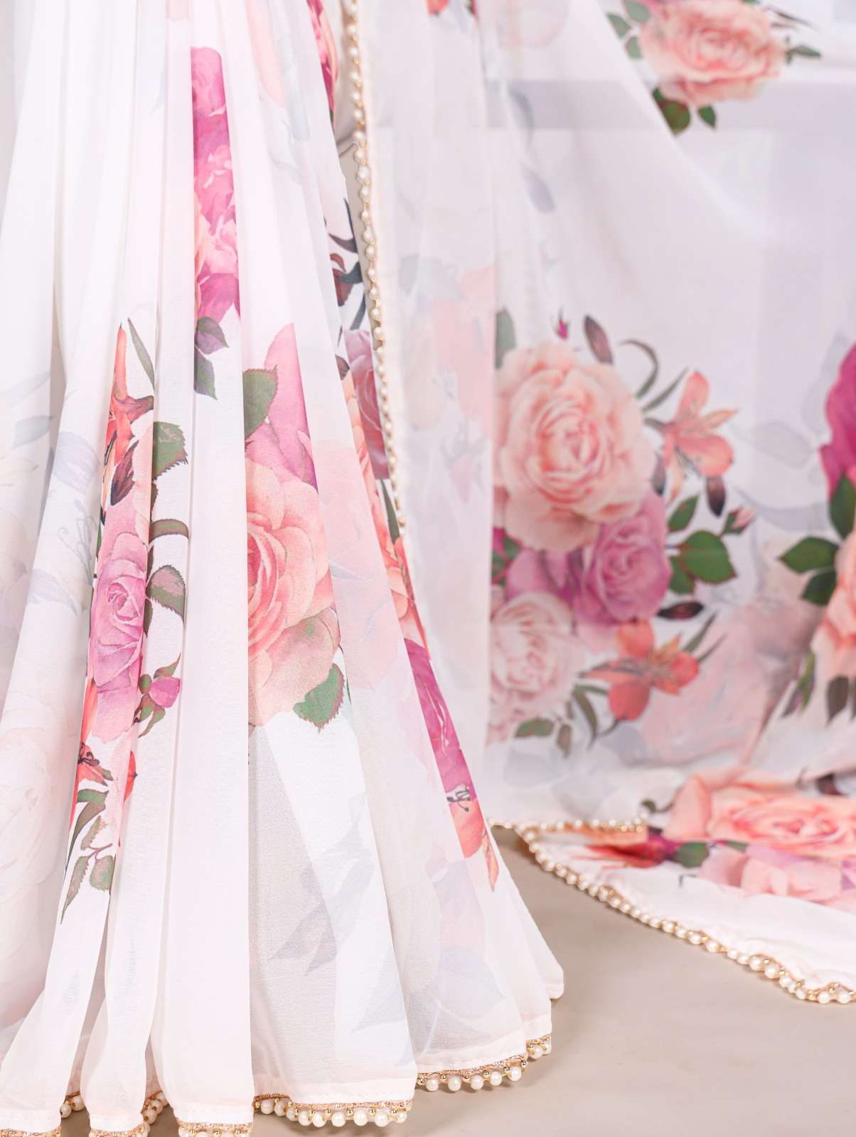 The best way to represent your classy look with this spectacular georgette printed saree with Pearl lace border✨.
