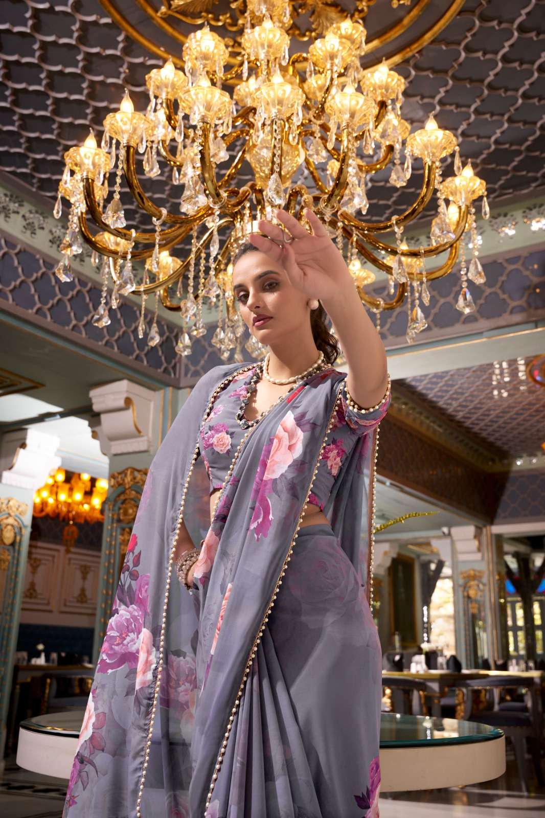 The best way to represent your classy look with this spectacular georgette printed saree with Pearl lace border✨.