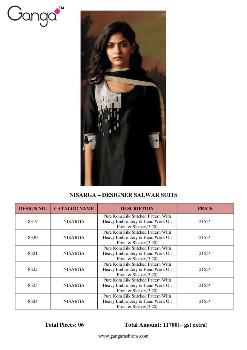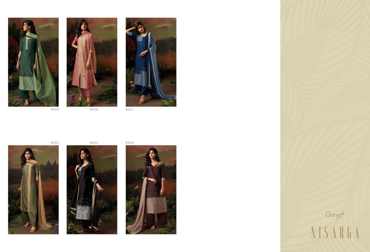 Buy Online Nisarga By Ganga Series 4319 To 4324 Designer Party Wear Suits Wholesale Supplier Surat 6 Pcs of Full Catalogue at Wholesale Price. Looking for Nisarga By Ganga Series 4319 To 4324 Designer Party Wear Suits Wholesale Supplier Surat Full Catalouge at Best Price? Buy Now Nisarga By Ganga Series 4319 To 4324 Designer Party Wear Suits Wholesale Supplier Surat at Wholesale Rate of Rs 12930 with Total 6 Pcs from authroized dealer and supplier of GANGA Brand. Cost of Each piece is just only Rs 2155 which is very low and affordable price to resale the product in your retail store ,This is Surat based Wholesale Supplier & Dealer of GANGA Brand. Click on Brand name to Know more about GANGA Brand's products.Call or Whatsapp on 9898838984 for booking or enquiry