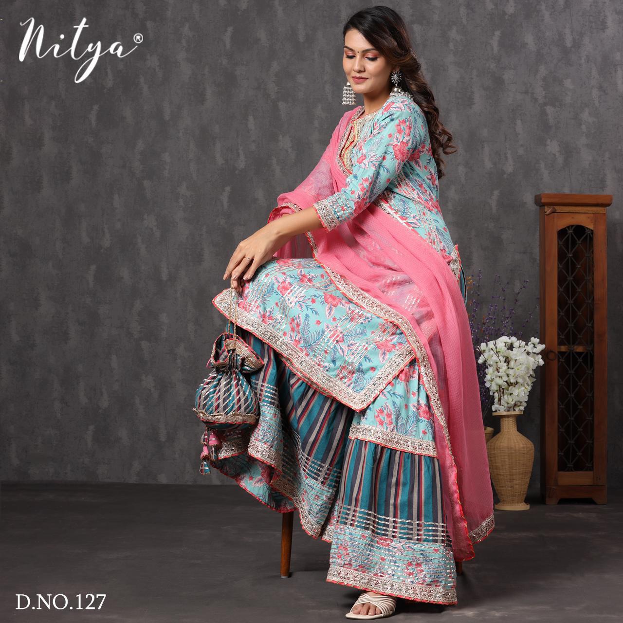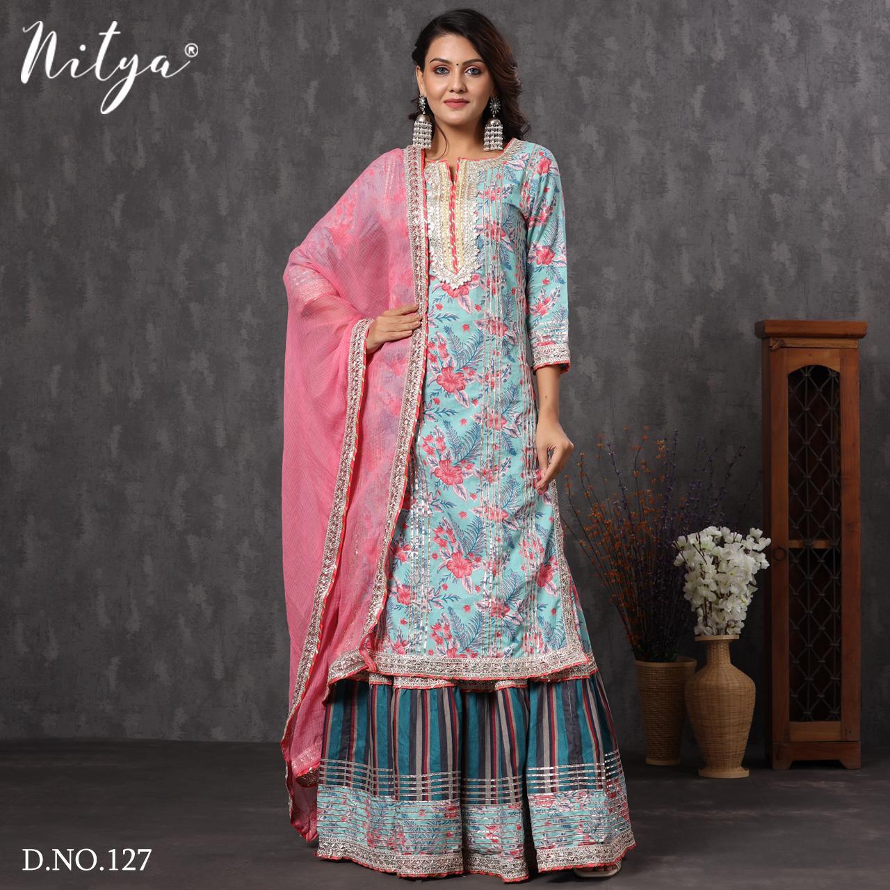 Buy Online Nitya D No 125 And 127 By Lt Fabrics Manufacturer Traders Surat 4 Pcs of Full Catalogue at Wholesale Price. Looking for Nitya D No 125 And 127 By Lt Fabrics Manufacturer Traders Surat Full Catalouge at Best Price? Buy Now Nitya D No 125 And 127 By Lt Fabrics Manufacturer Traders Surat at Wholesale Rate of Rs 7340 with Total 4 Pcs from authroized dealer and supplier of LT FABRICS Brand. Cost of Each piece is just only Rs 1835 which is very low and affordable price to resale the product in your retail store ,This is Surat based Wholesale Supplier & Dealer of LT FABRICS Brand. Click on Brand name to Know more about LT FABRICS Brand's products.Call or Whatsapp on 9898838984 for booking or enquiry