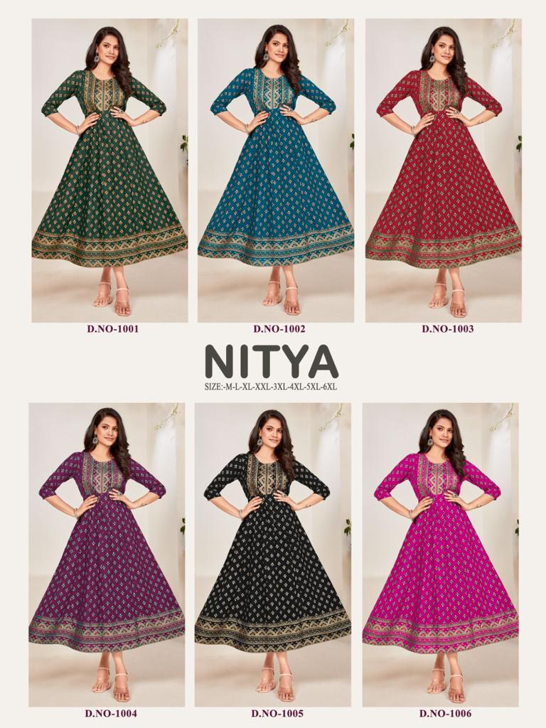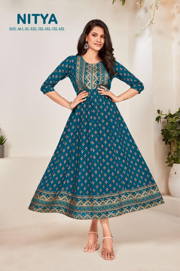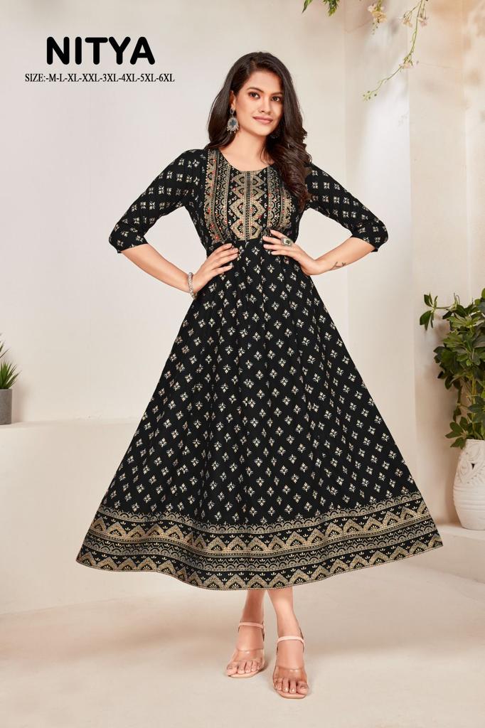 *NEW LAUNCH* *NITYA* _Multi Color Foil Print Flair Gown_ *Fabric:* 14kg Rayon with Foil Print *Work* :- Multi Color Foil Print *Size:* M:38" L:40Â? XL:42Â? XXL:44Â? 3XL:46" 4XL:48" 5XL:50" 6XL:52" Length: 49Â? * Dispatch 4-5 Days later 100+Singles |