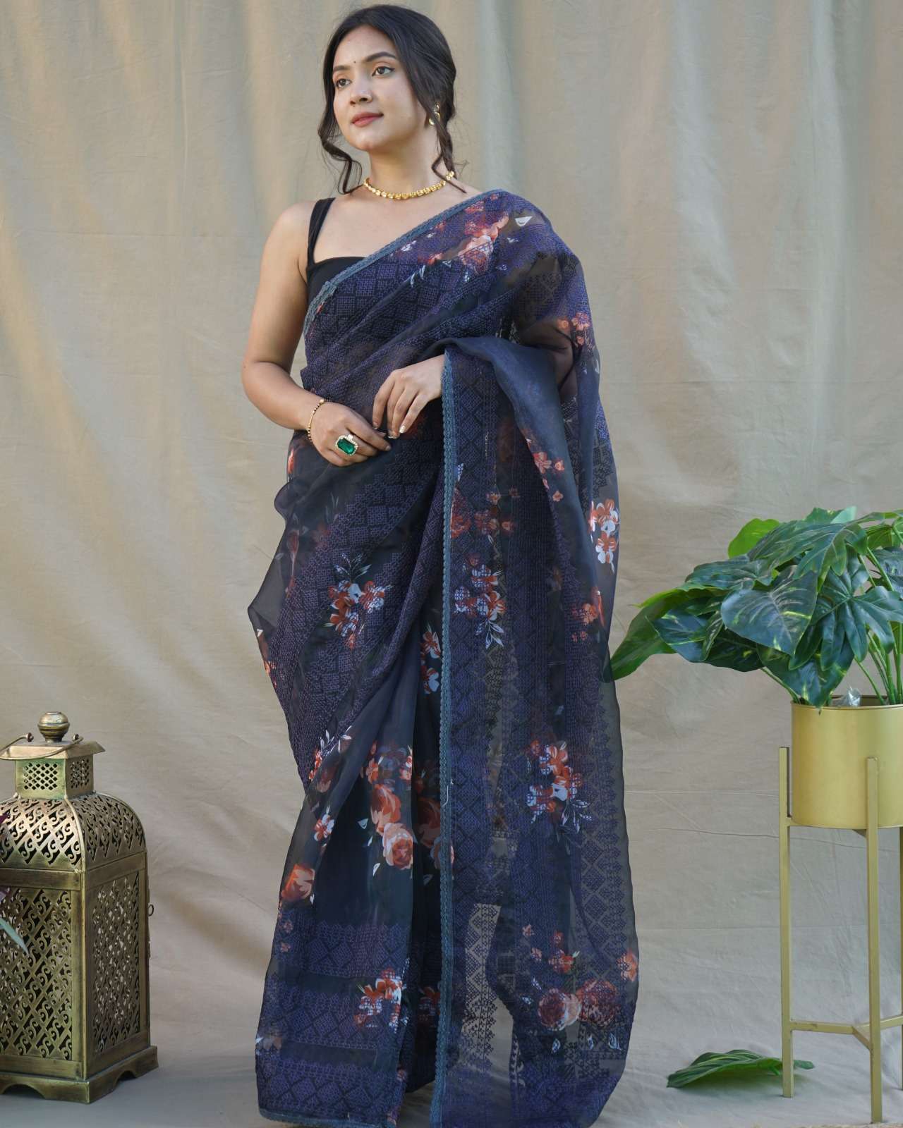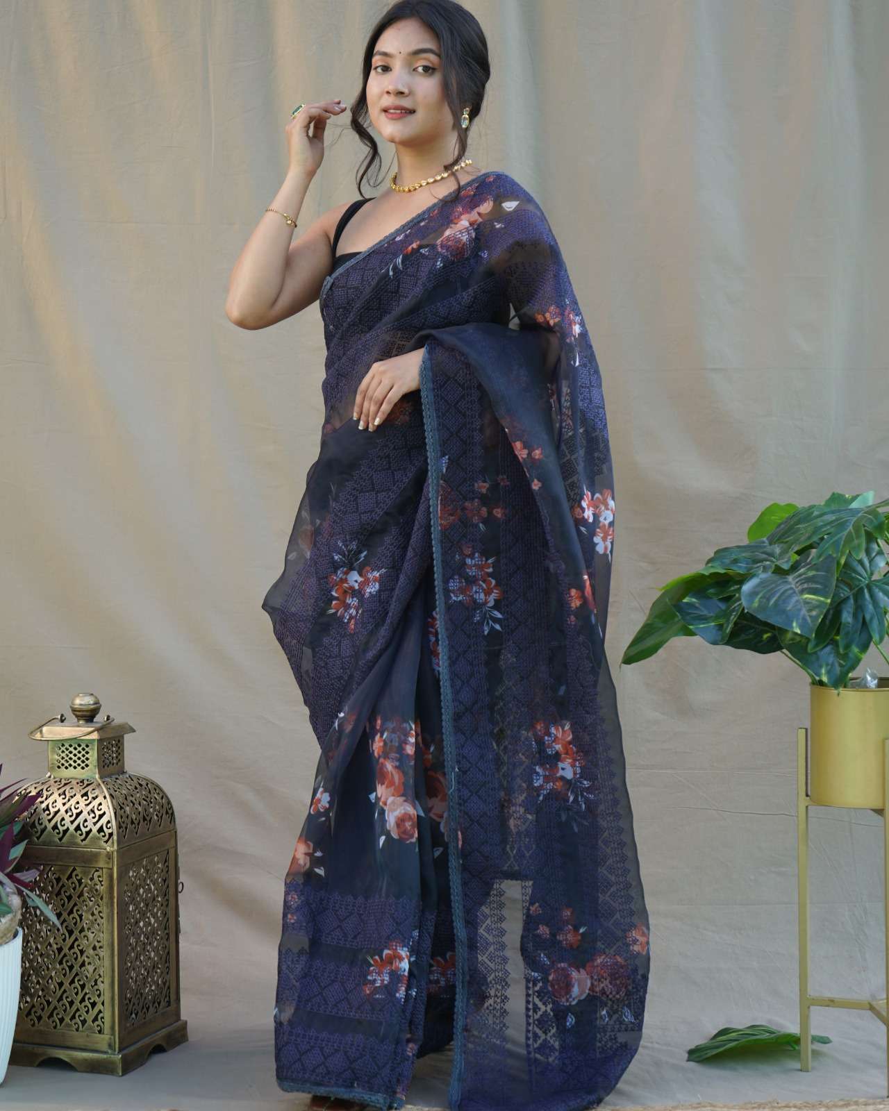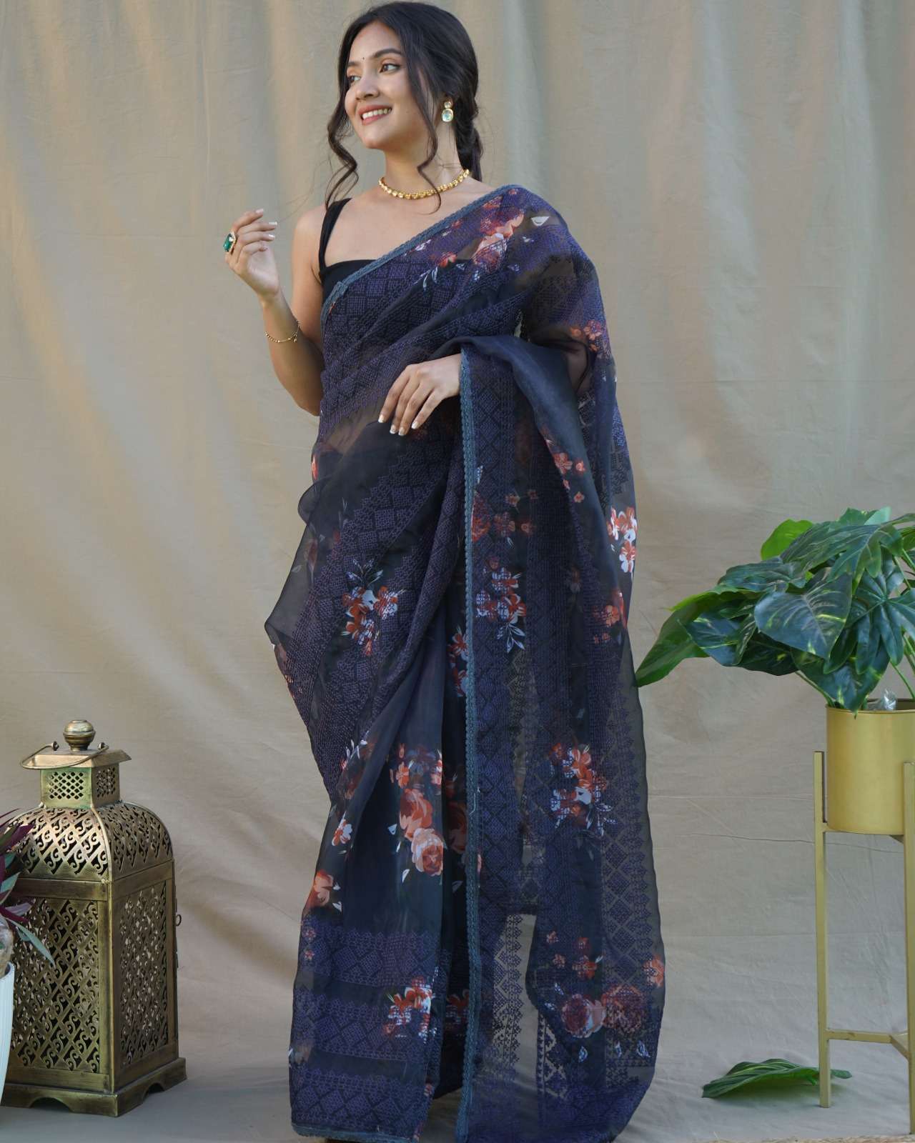 Catalog Name : *Nitya* No of Pcs : 1 Fabric : Organza Work : Digital , Flower Printed & Embroidered Work with Chikankari Border with banglori sattin silk blouse