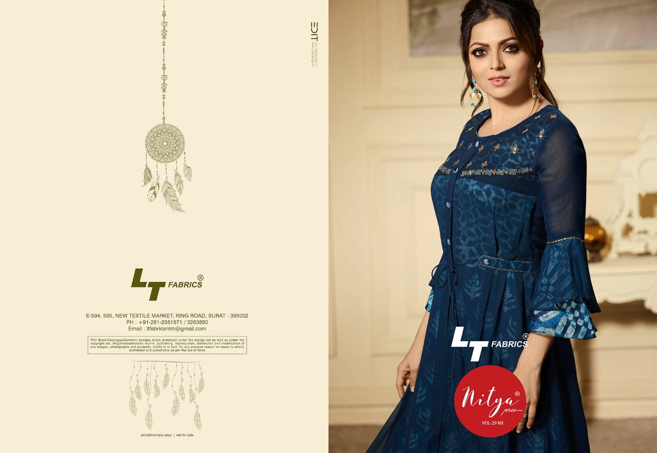 Buy Online Nitya Vol 29 Nx By Lt Georgette Designer Kurtis Wholesale Supplier And Dealer Surat 11 Pcs of Full Catalogue at Wholesale Price. Looking for Nitya Vol 29 Nx By Lt Georgette Designer Kurtis Wholesale Supplier And Dealer Surat Full Catalouge at Best Price? Buy Now Nitya Vol 29 Nx By Lt Georgette Designer Kurtis Wholesale Supplier And Dealer Surat at Wholesale Rate of Rs 7689 with Total 11 Pcs from authroized dealer and supplier of LT FABRICS Brand. Cost of Each piece is just only Rs 699 which is very low and affordable price to resale the product in your retail store ,This is Surat based Wholesale Supplier & Dealer of LT FABRICS Brand. Click on Brand name to Know more about LT FABRICS Brand's products.Call or Whatsapp on 9898838984 for booking or enquiry