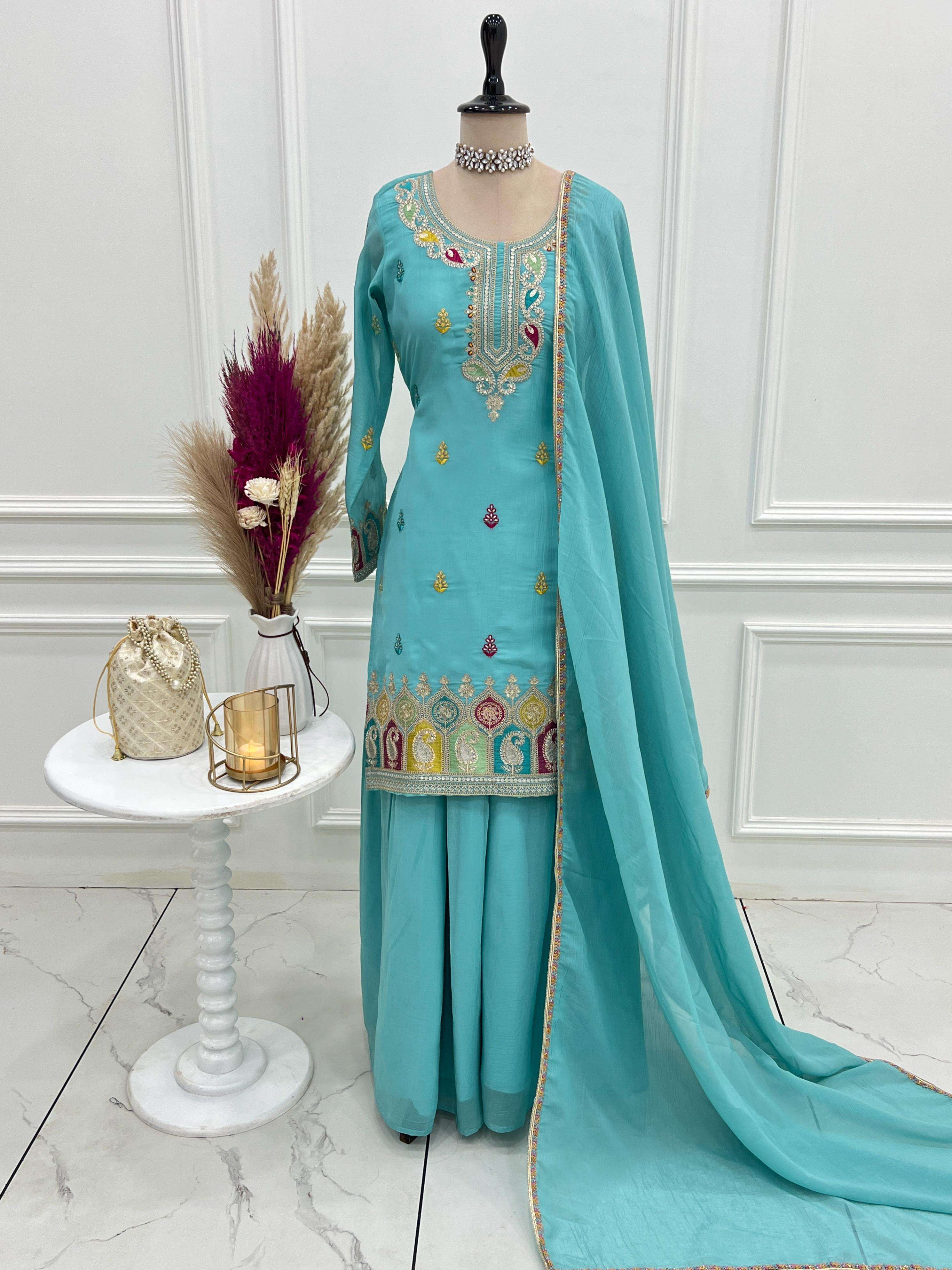 *This colourfull & fresh look outfit is perfect for upcoming festivities and weddings which provides you more comfort and style* *PURE SOFT CRUNCHY SILK FABRIC TOP,SHARARA WITH DUPATTA SET READY TO WEAR*