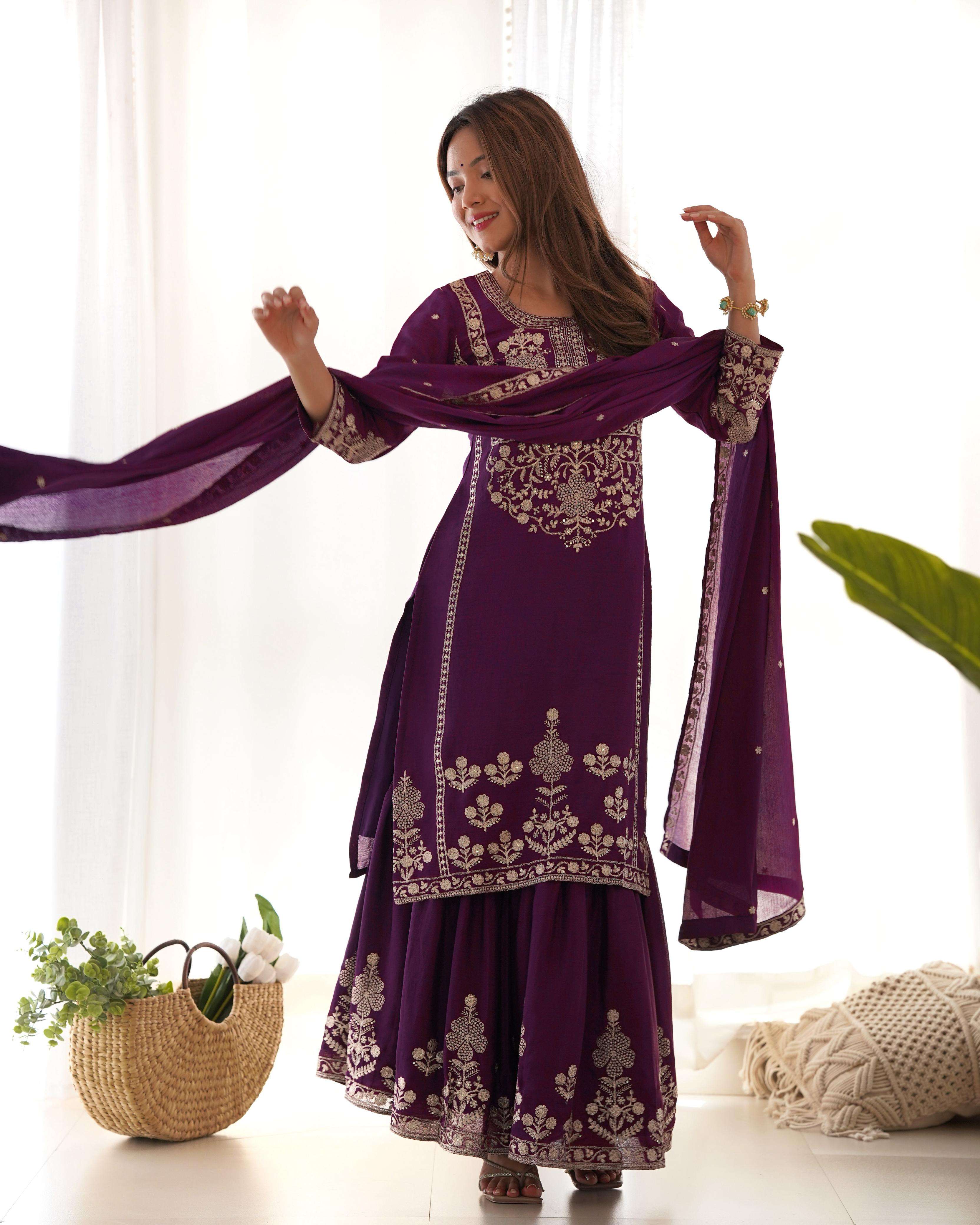 *This colourfull & fresh look outfit is perfect for upcoming festivities and weddings which provides you more comfort and style* *PURE CHINNON SILK FABRIC TOP WITH DUPPTA SET,SHARARA READY TO WEAR*